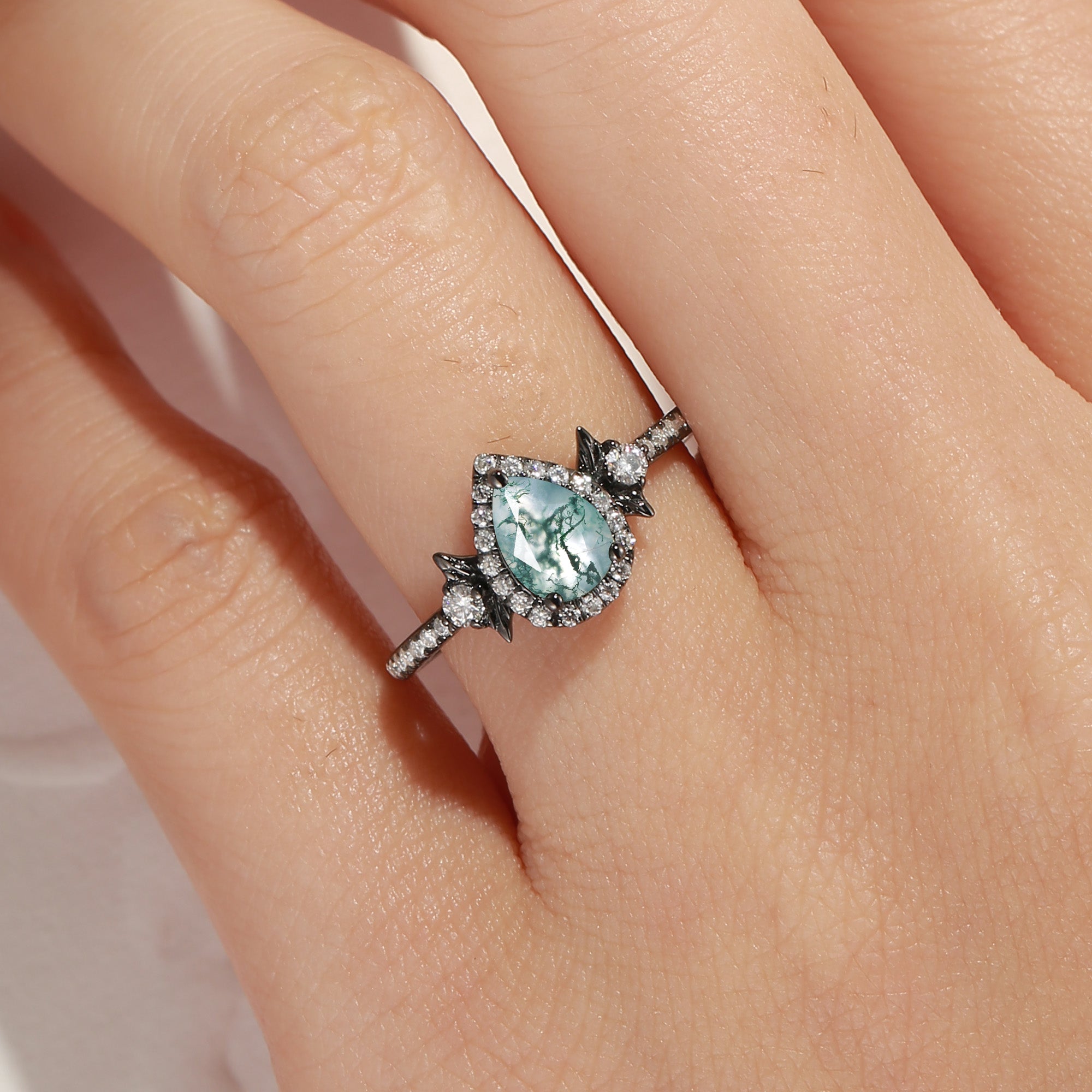 Nature Inspired Pear Shaped Moss Agate Halo Leaf Engagement Ring