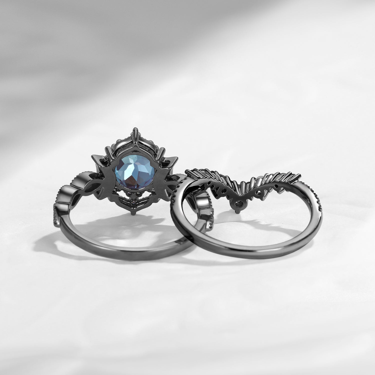 Crescent Moon | Round Cut Lab Alexandrite 'Black Statement' Ring Set 2pcs