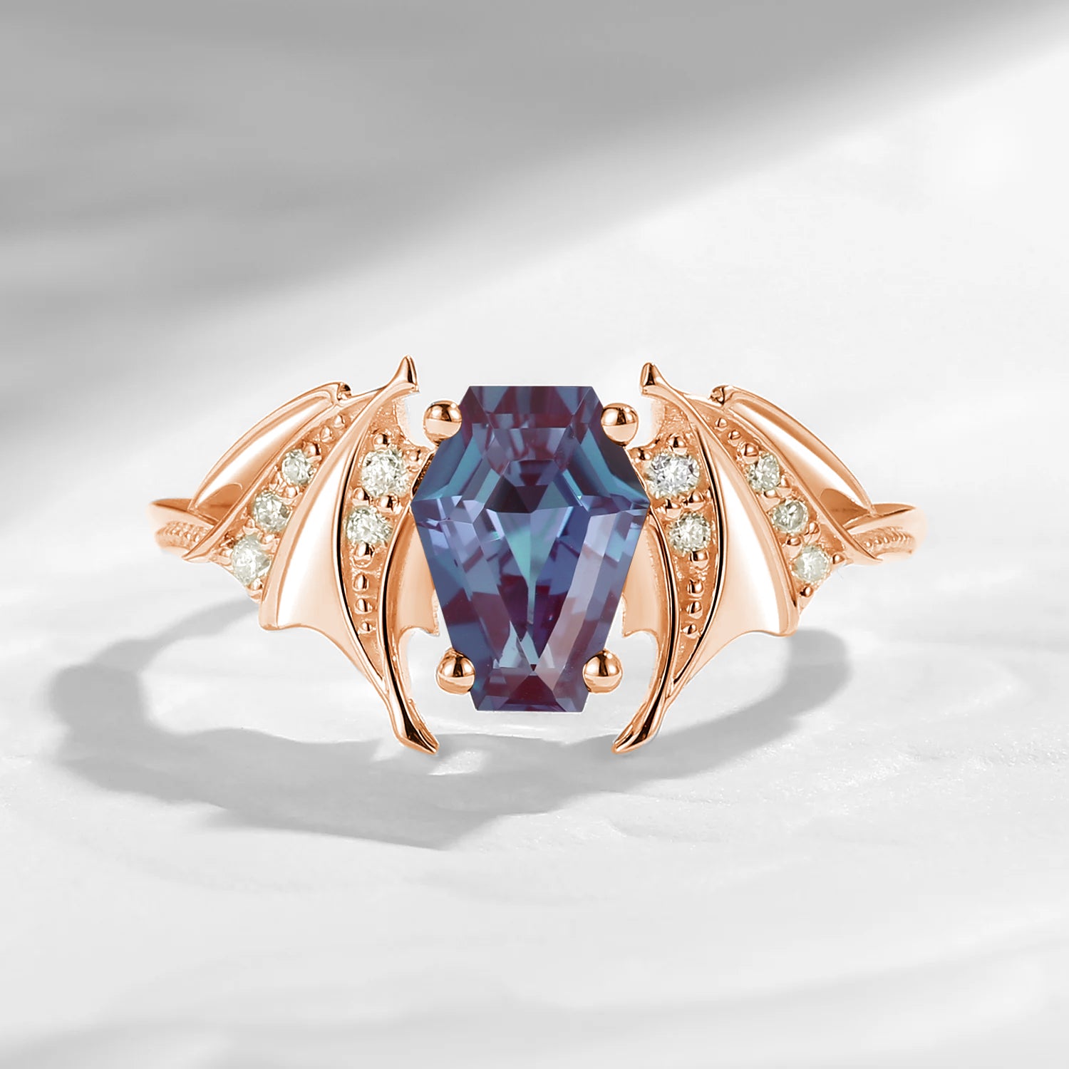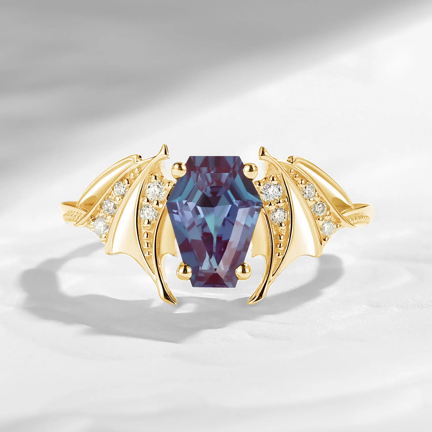 Coffin Cut Lab Alexandrite Gothic Inspired Black Gold Engagement Ring - Bat Ring