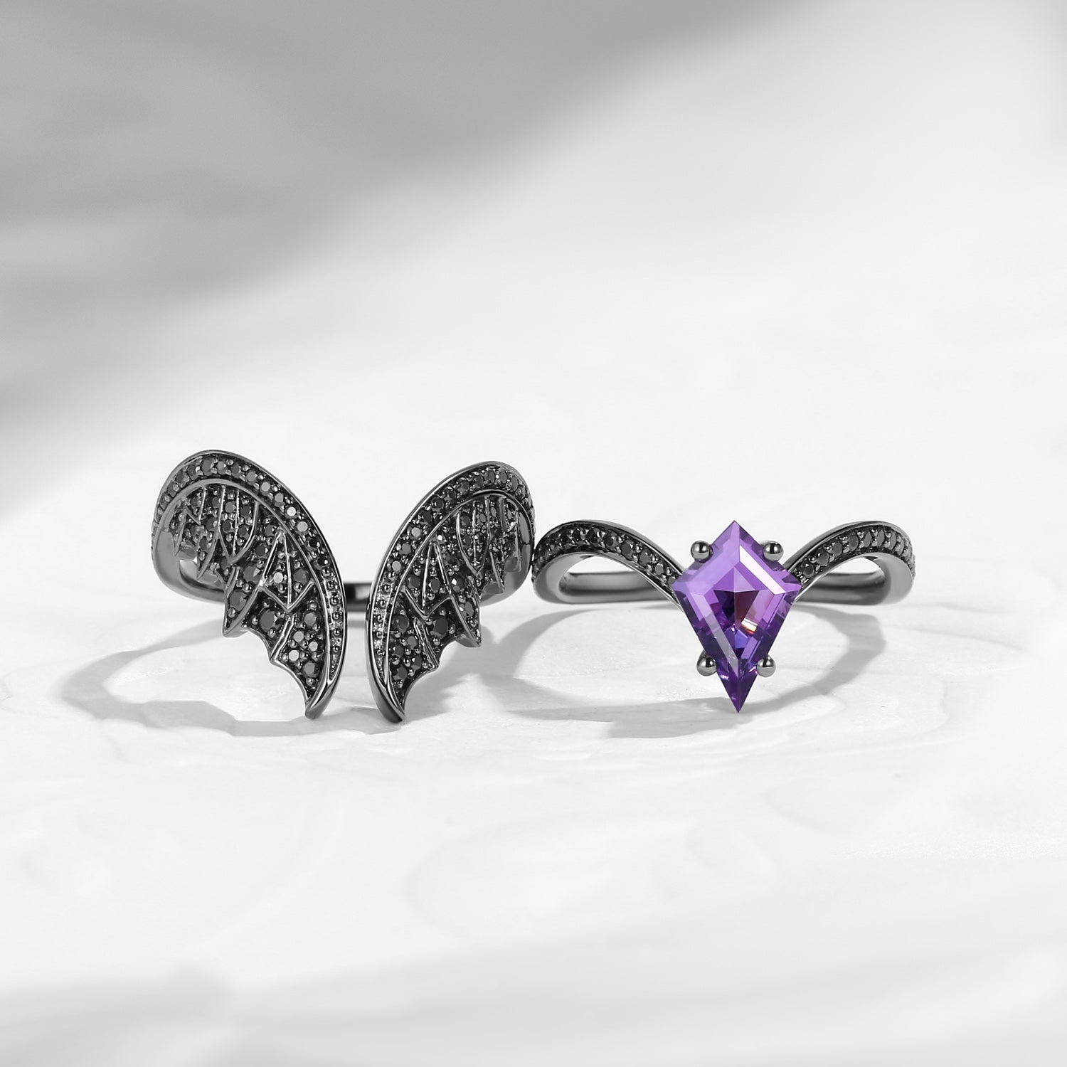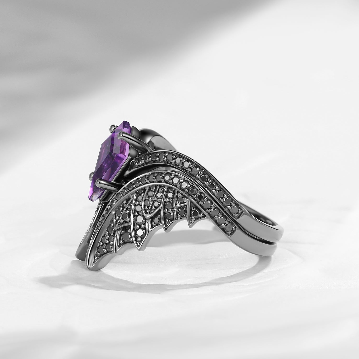 Kite Cut Natural Amethyst Vintage Black Gold Bridal Set 2pcs - Bat Ring