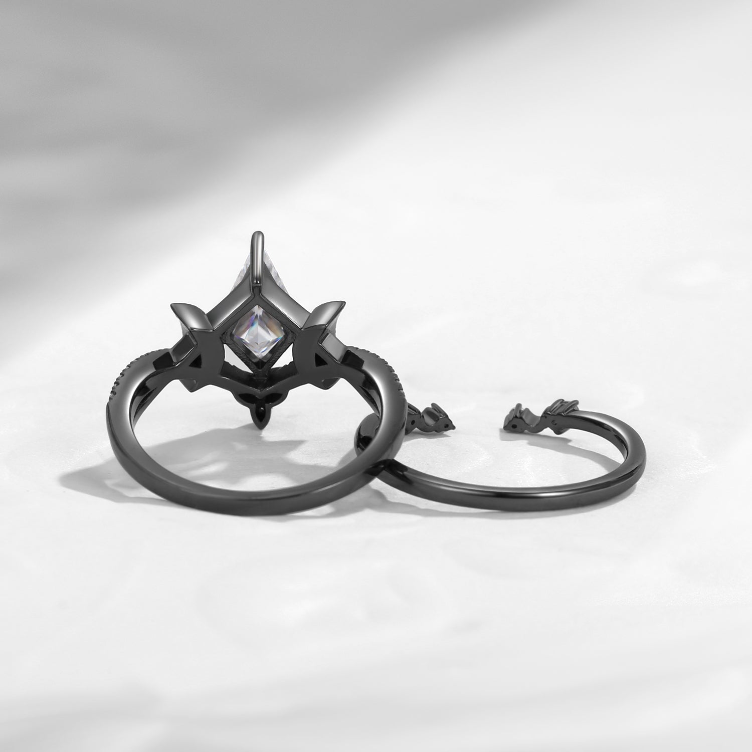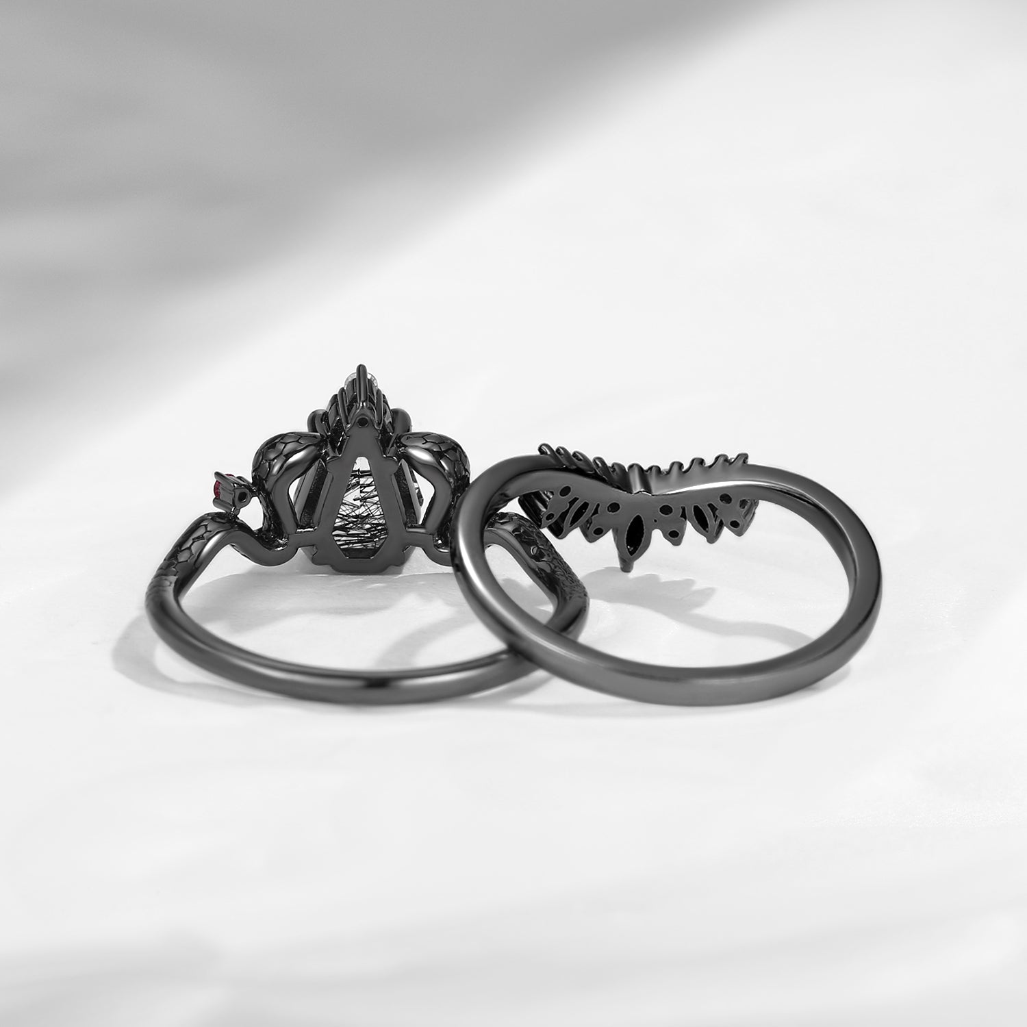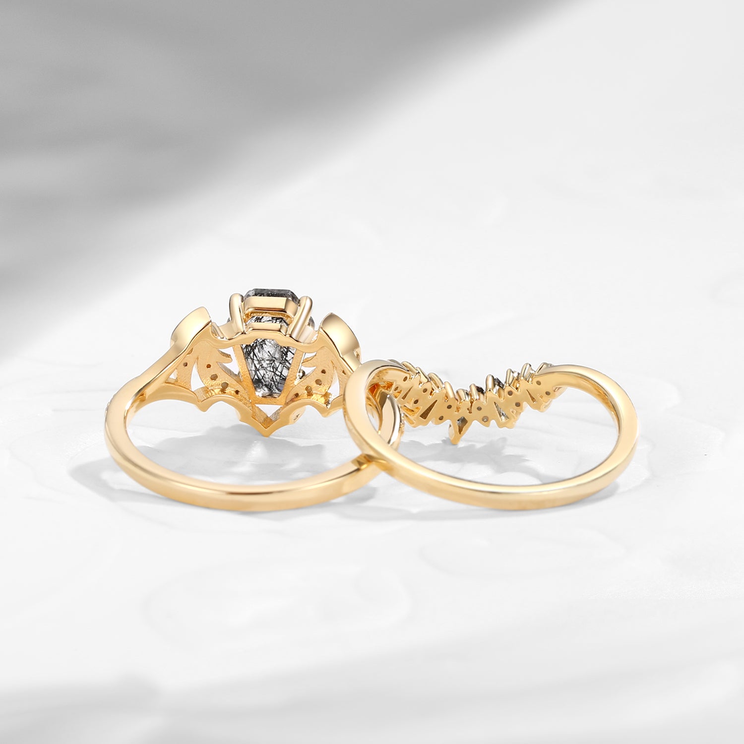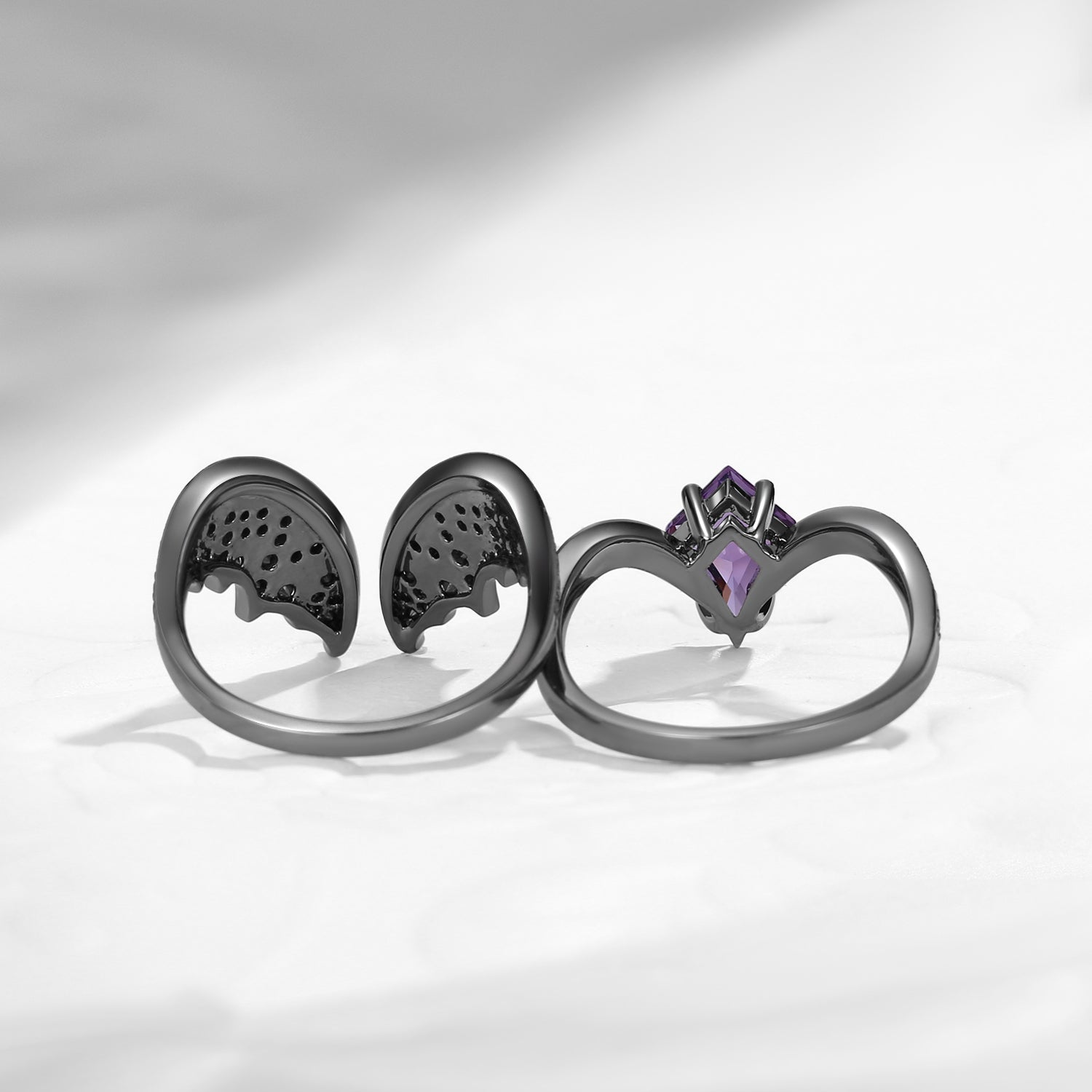 Non-Traditional Coffin Moissanite Vampire Black Gold Ring Set 2pcs - Bat Ring