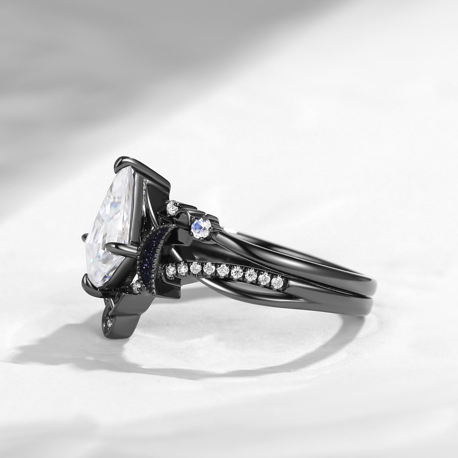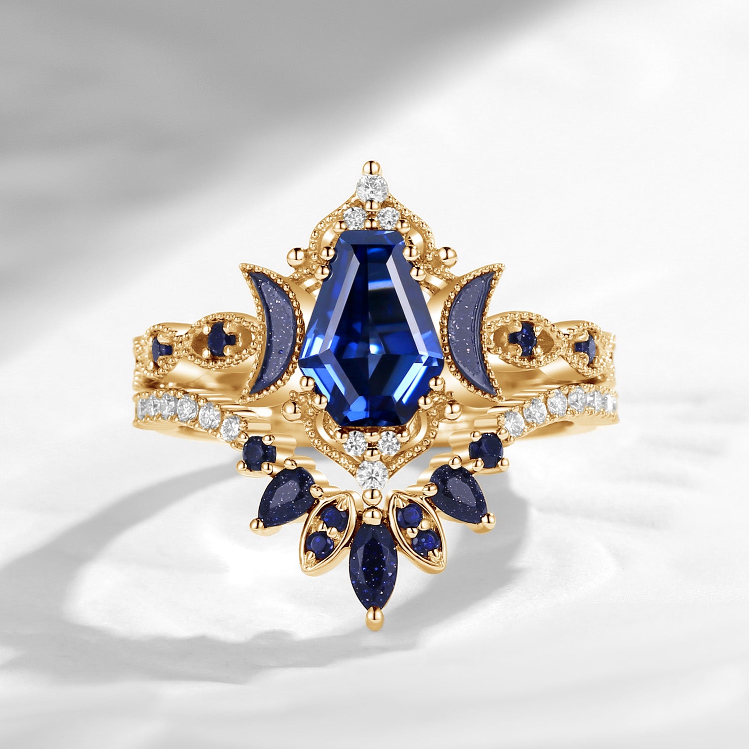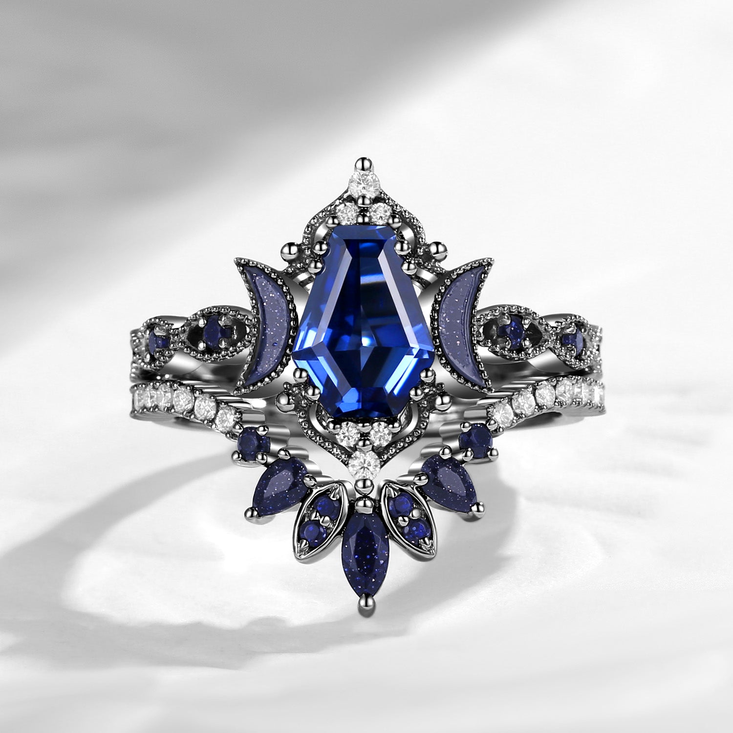 Crescent Moon | Coffin Cut Lab Sapphire Engagement Ring Set 2pcs- 'Ultra Galaxy'