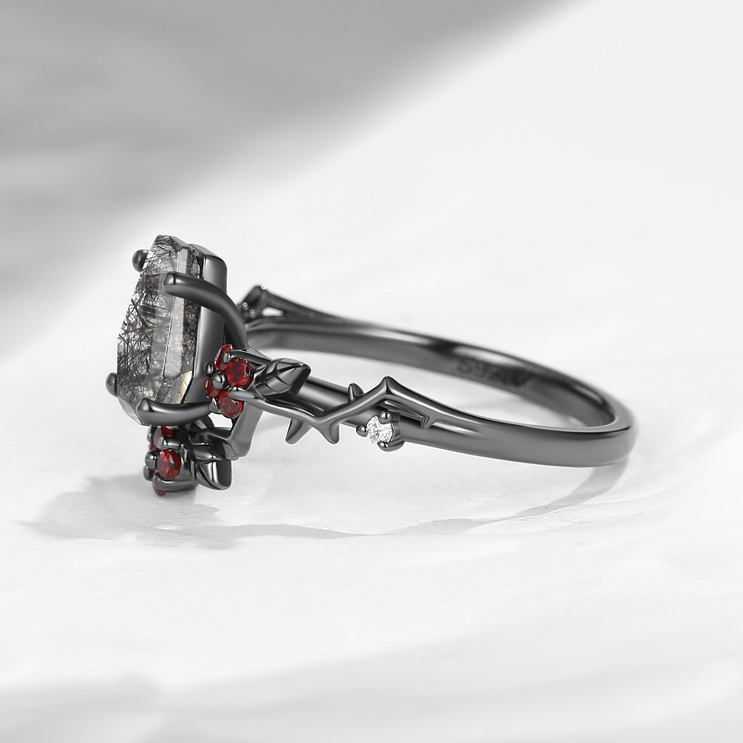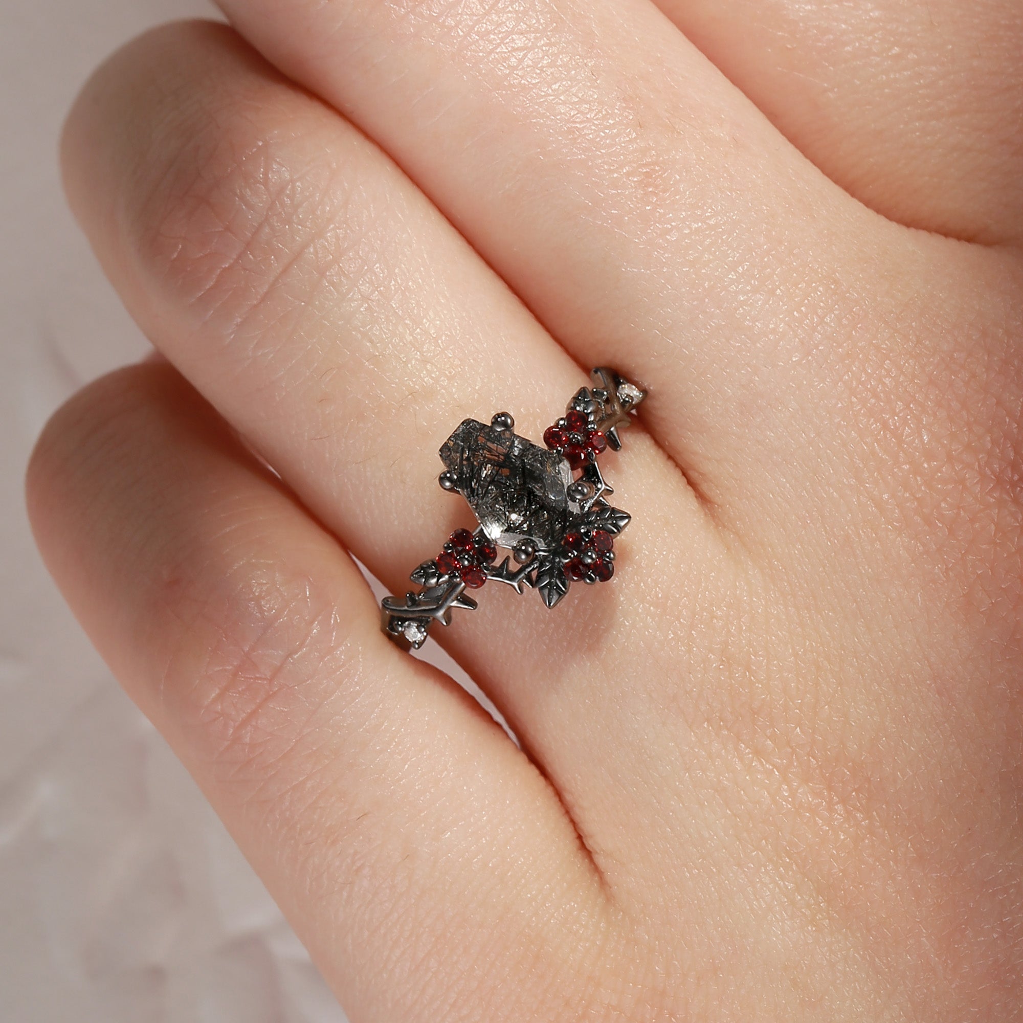 Gothic Style Coffin Black Rutilated Quartz Vine 'Thorns & Roses' Engagement Ring