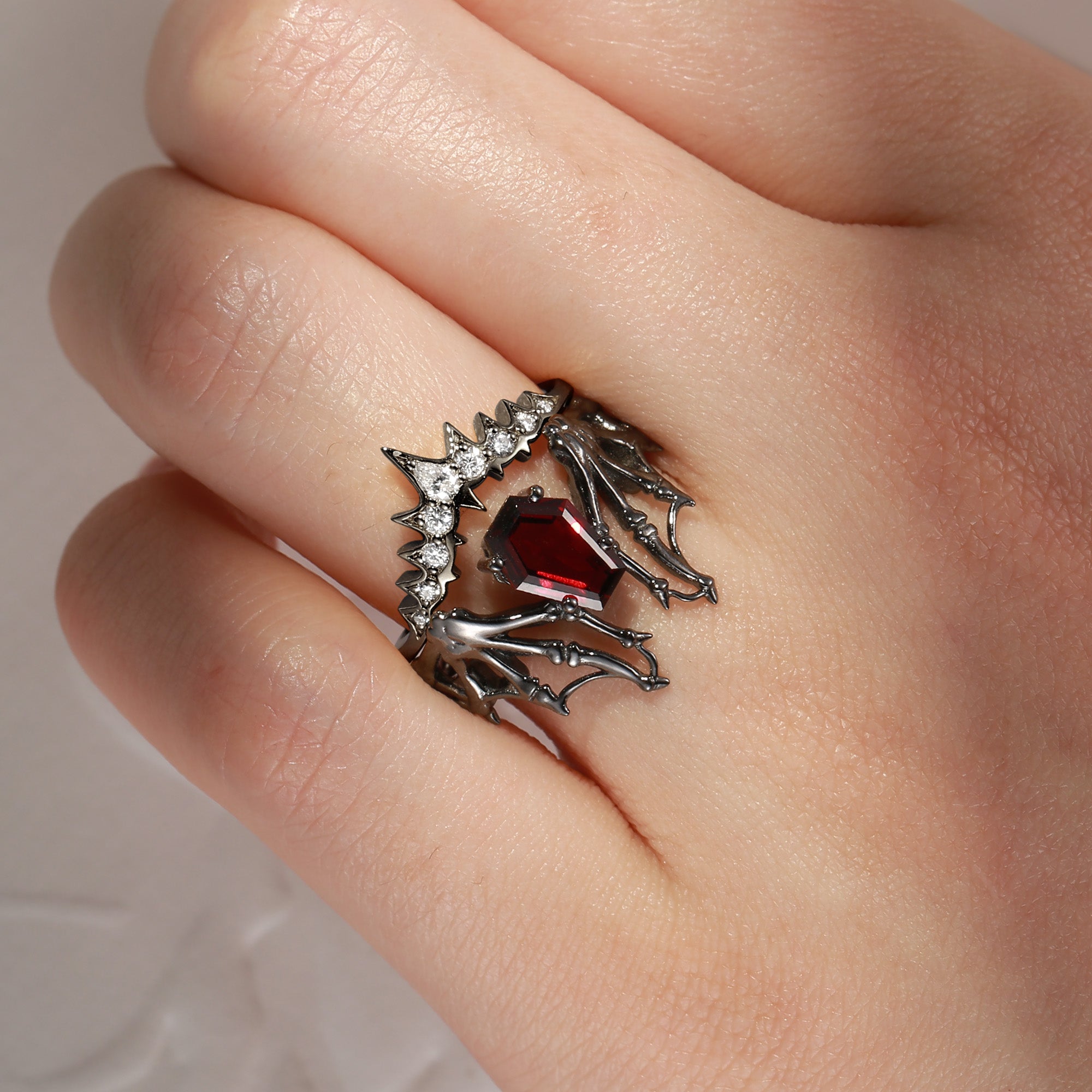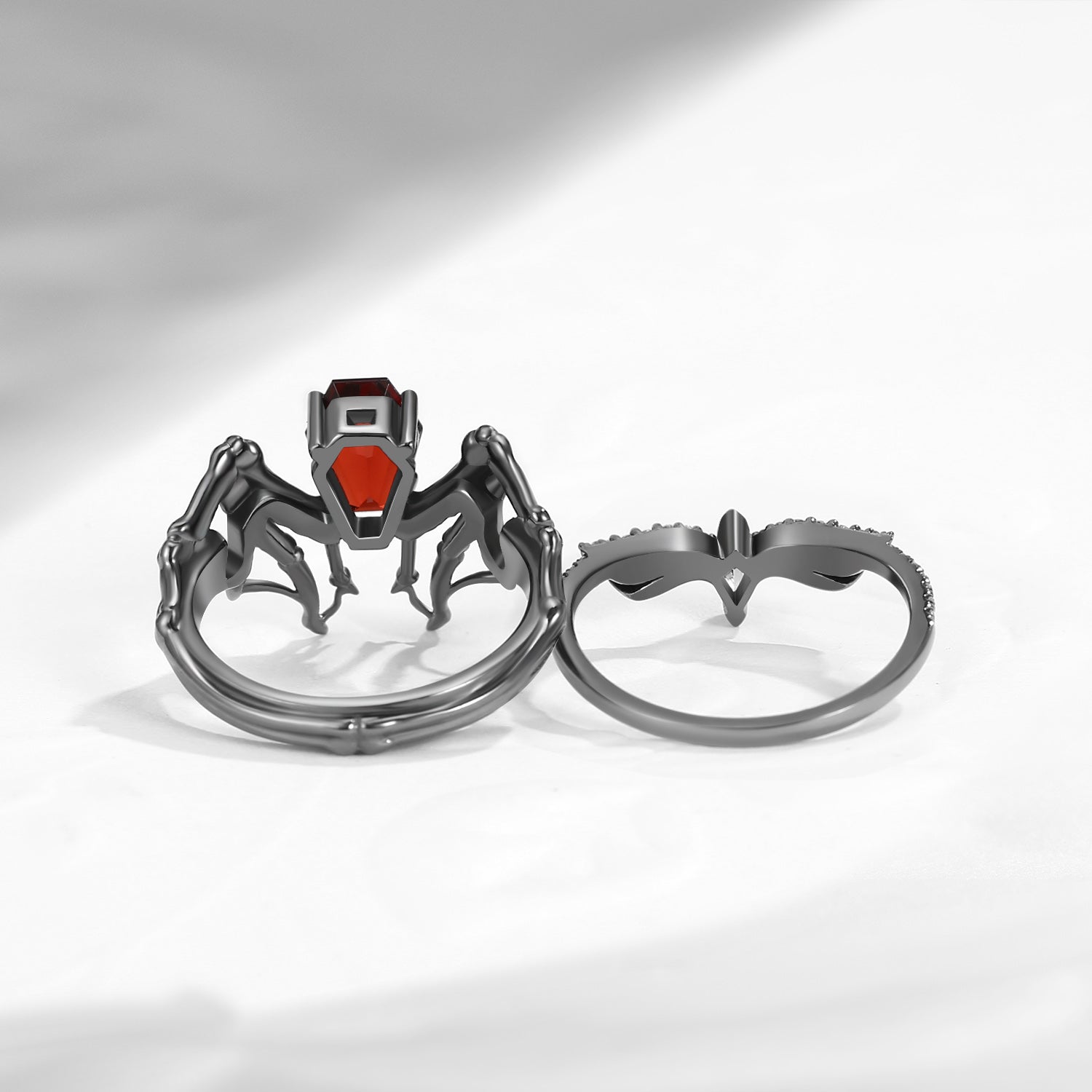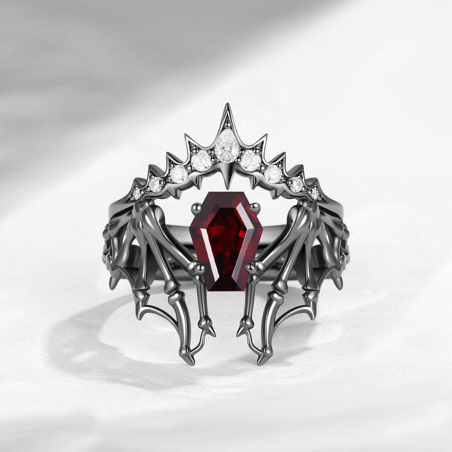 Non-Traditional Coffin Garnet Black Gold Vampire Ring Set 2pcs - Bat Ring