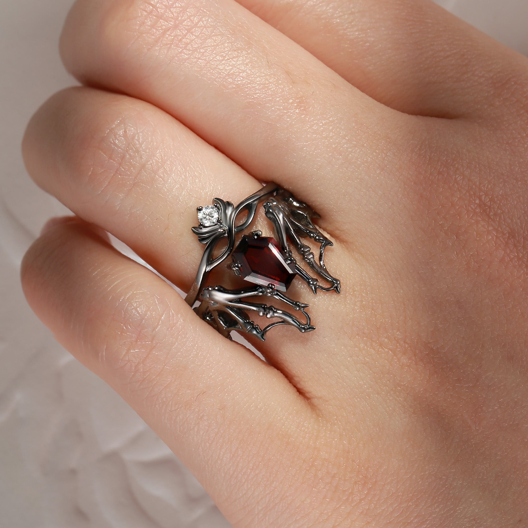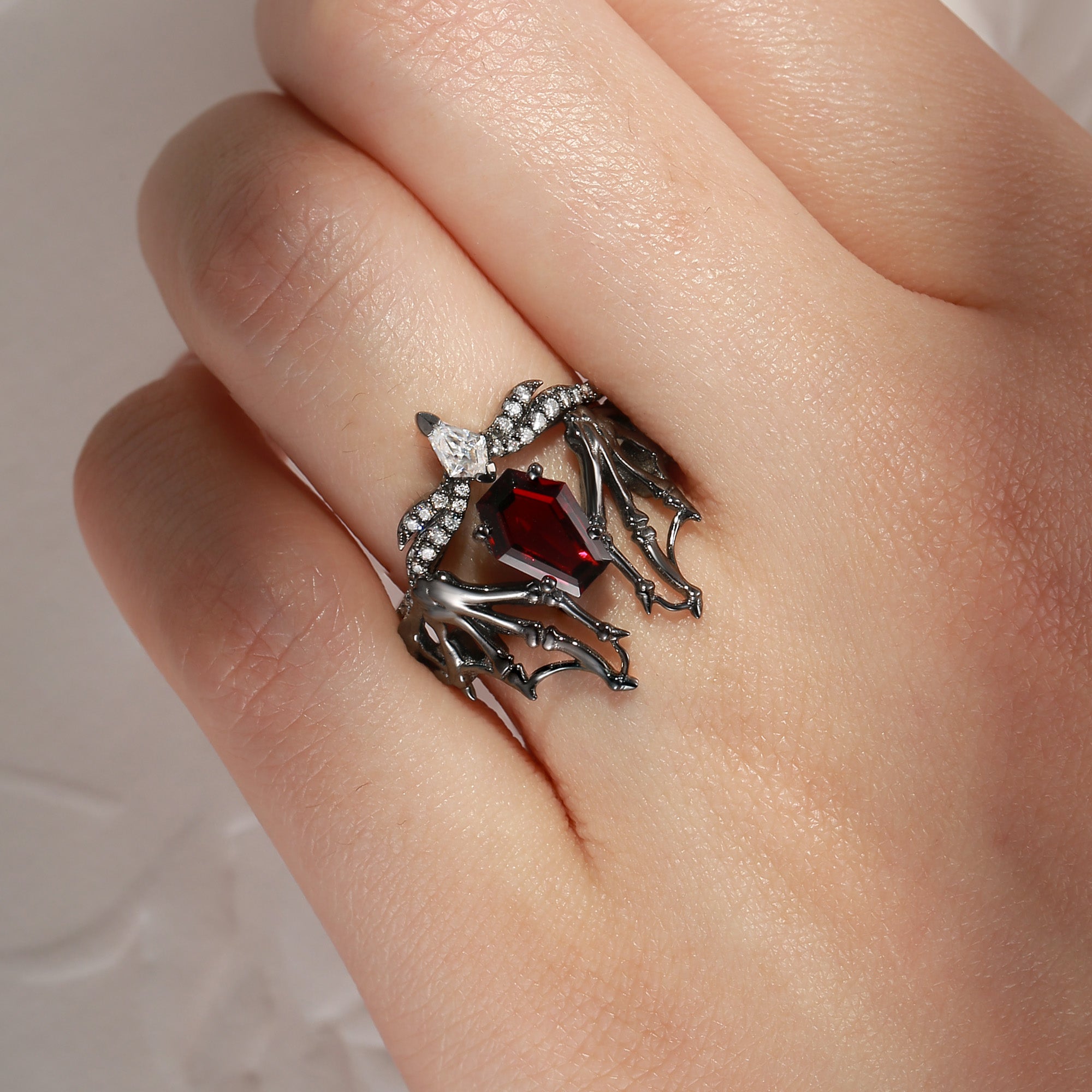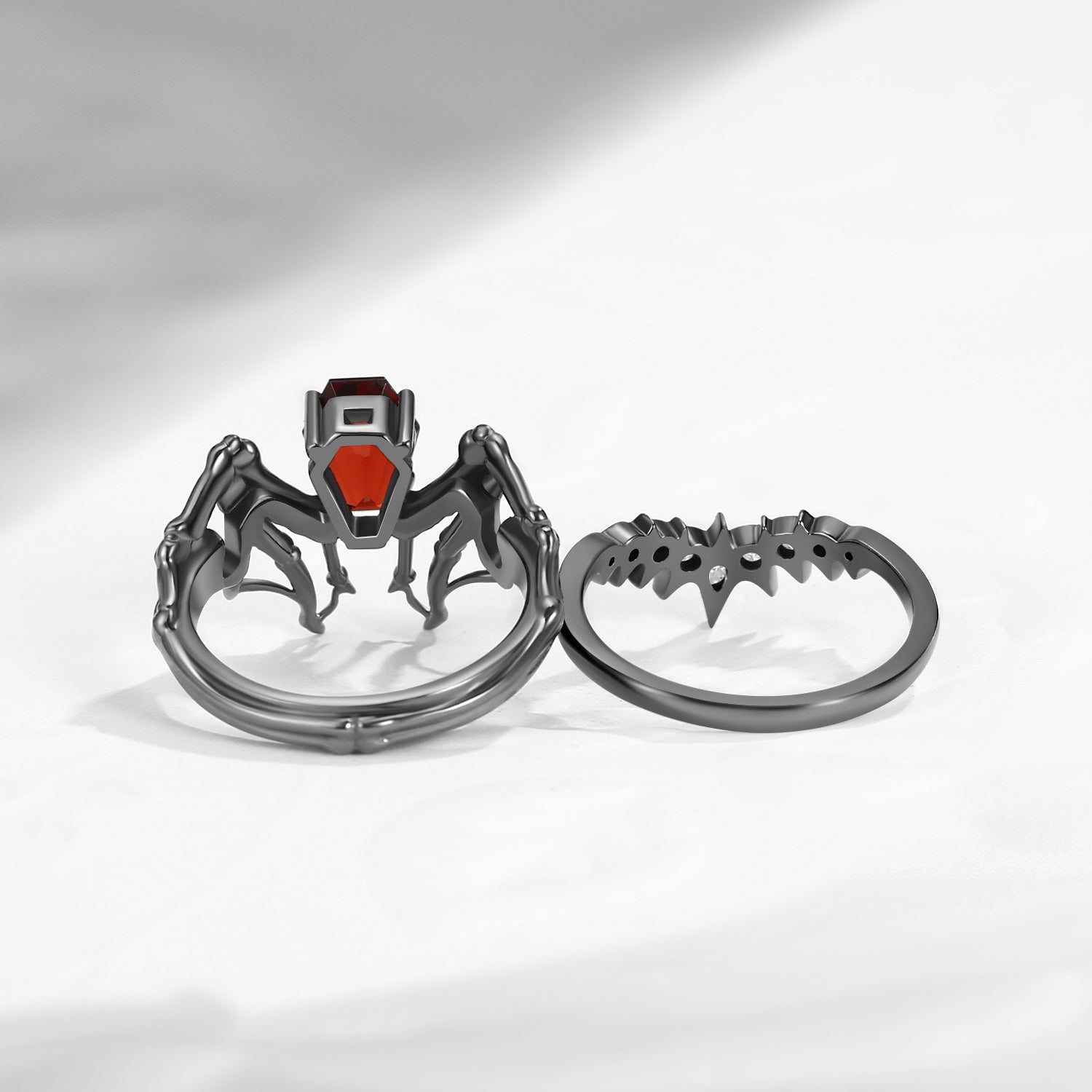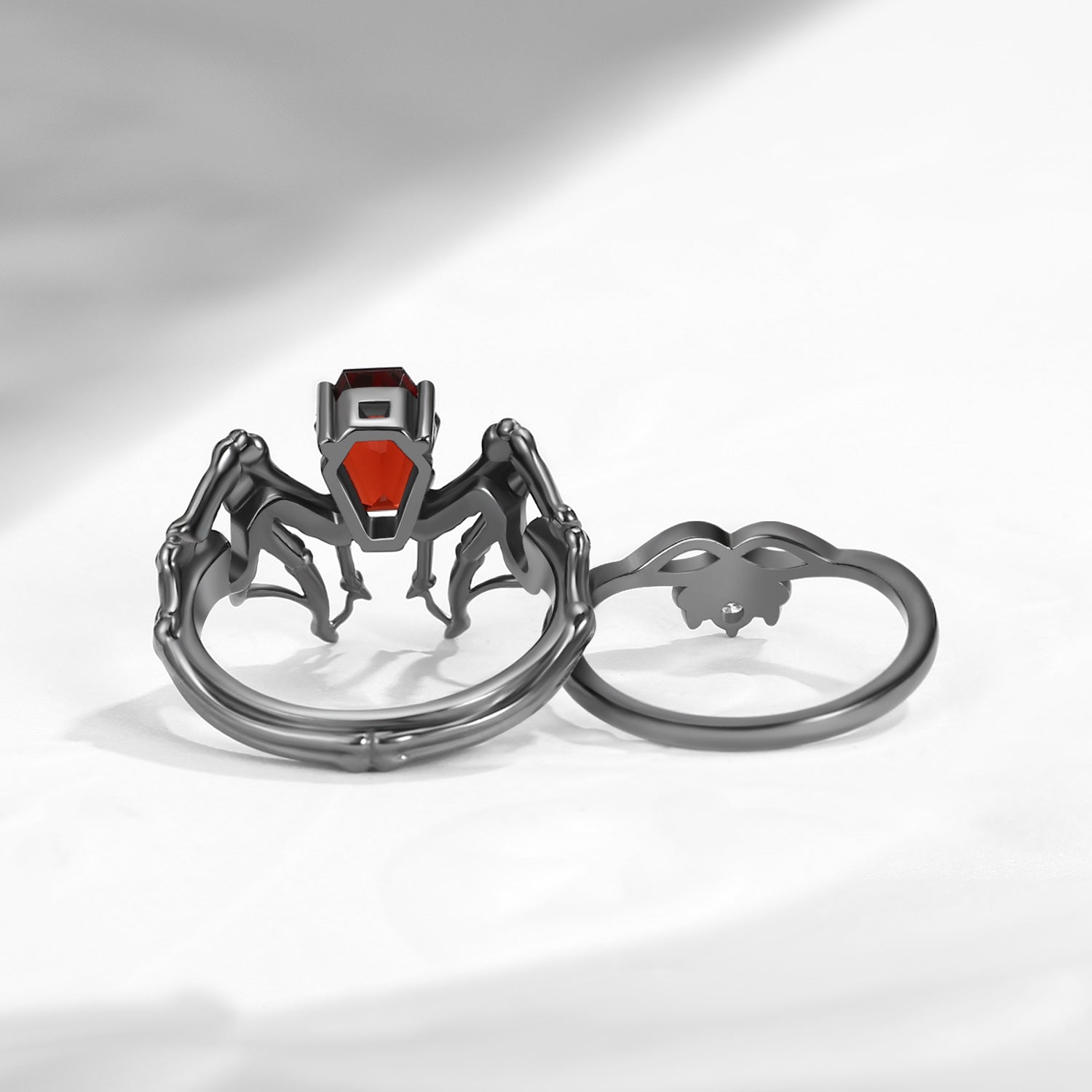 Non-Traditional Coffin Garnet Black Gold Vampire Ring Set 2pcs - Bat Ring