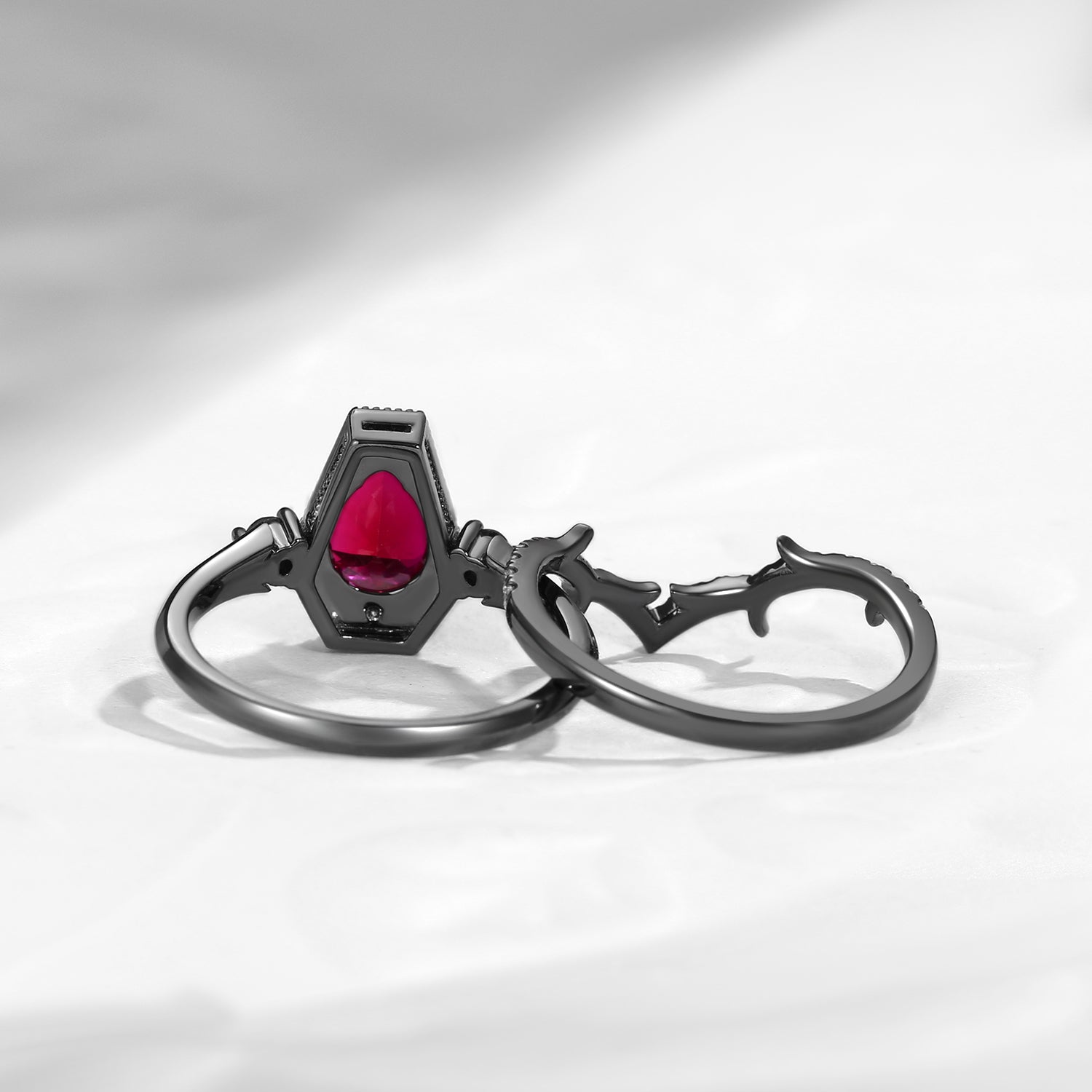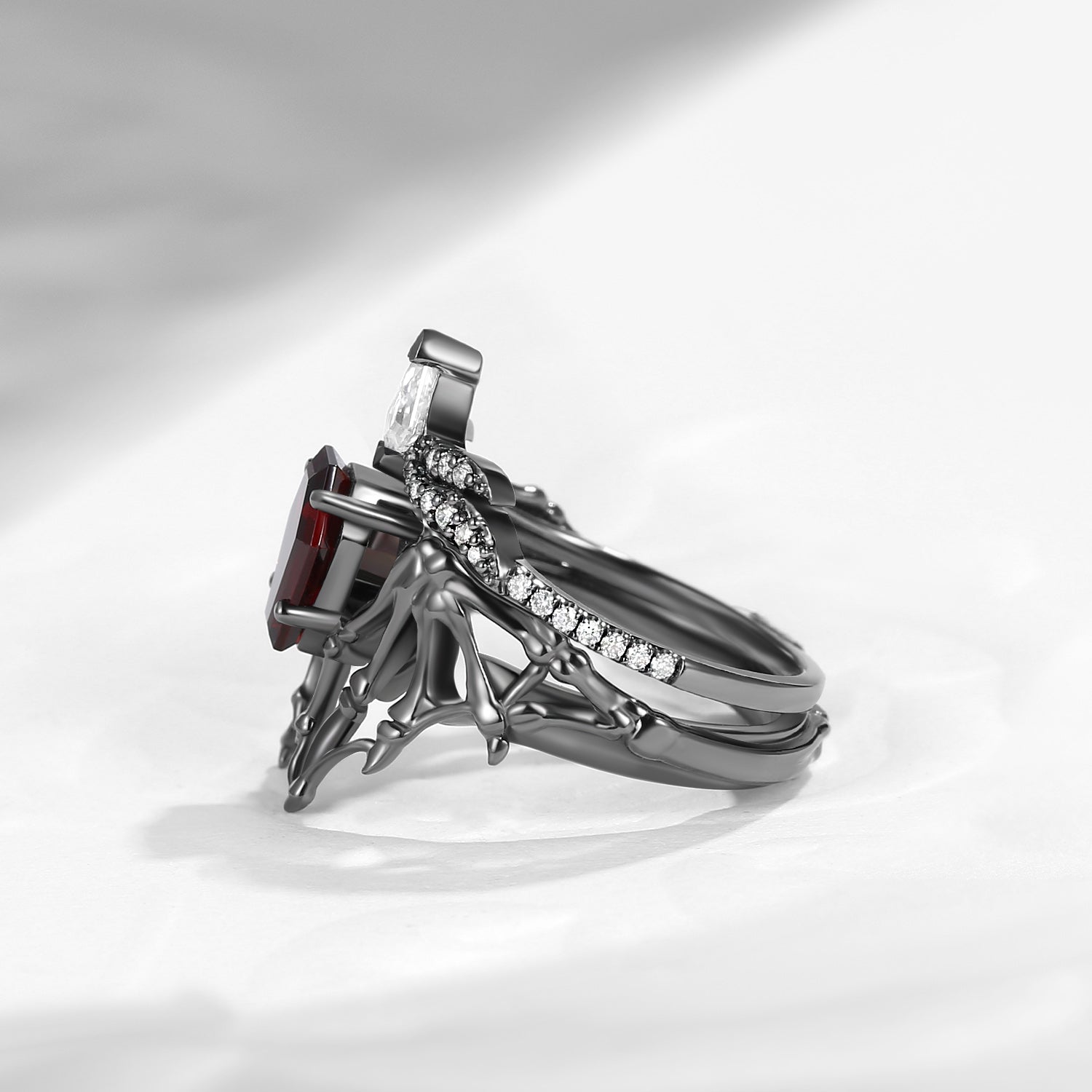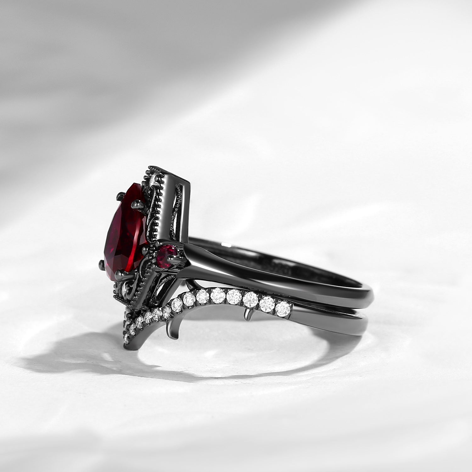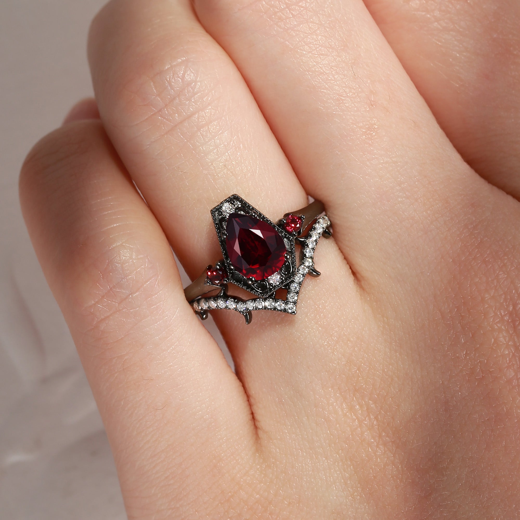 Gothic Pear Cut Garnet Vampire Fallen Aegis Engagement Ring Set 2pcs