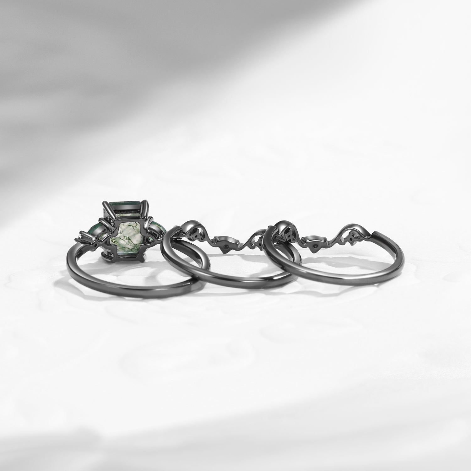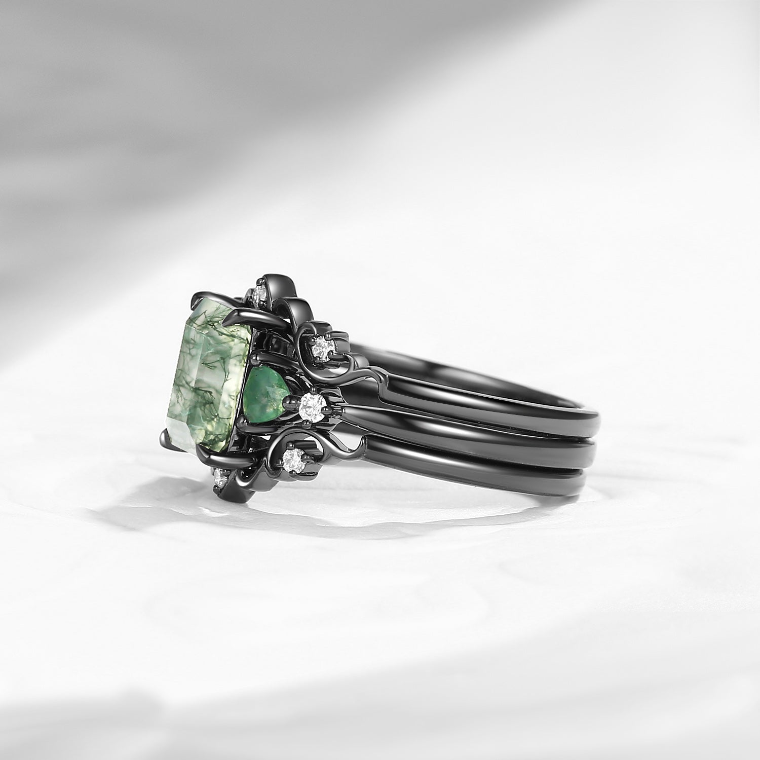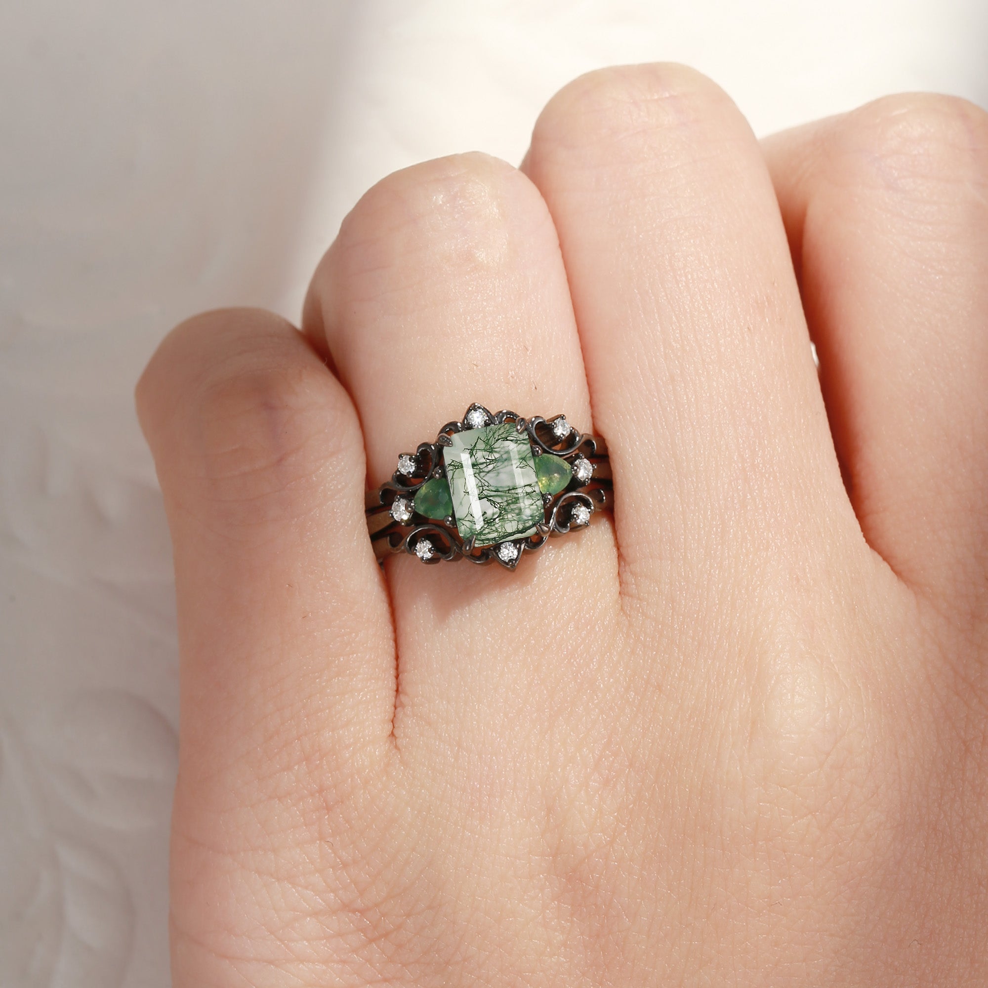 Nature Inspired Emerald Cut Moss Agate Gothic Engagement Ring Set 3pcs