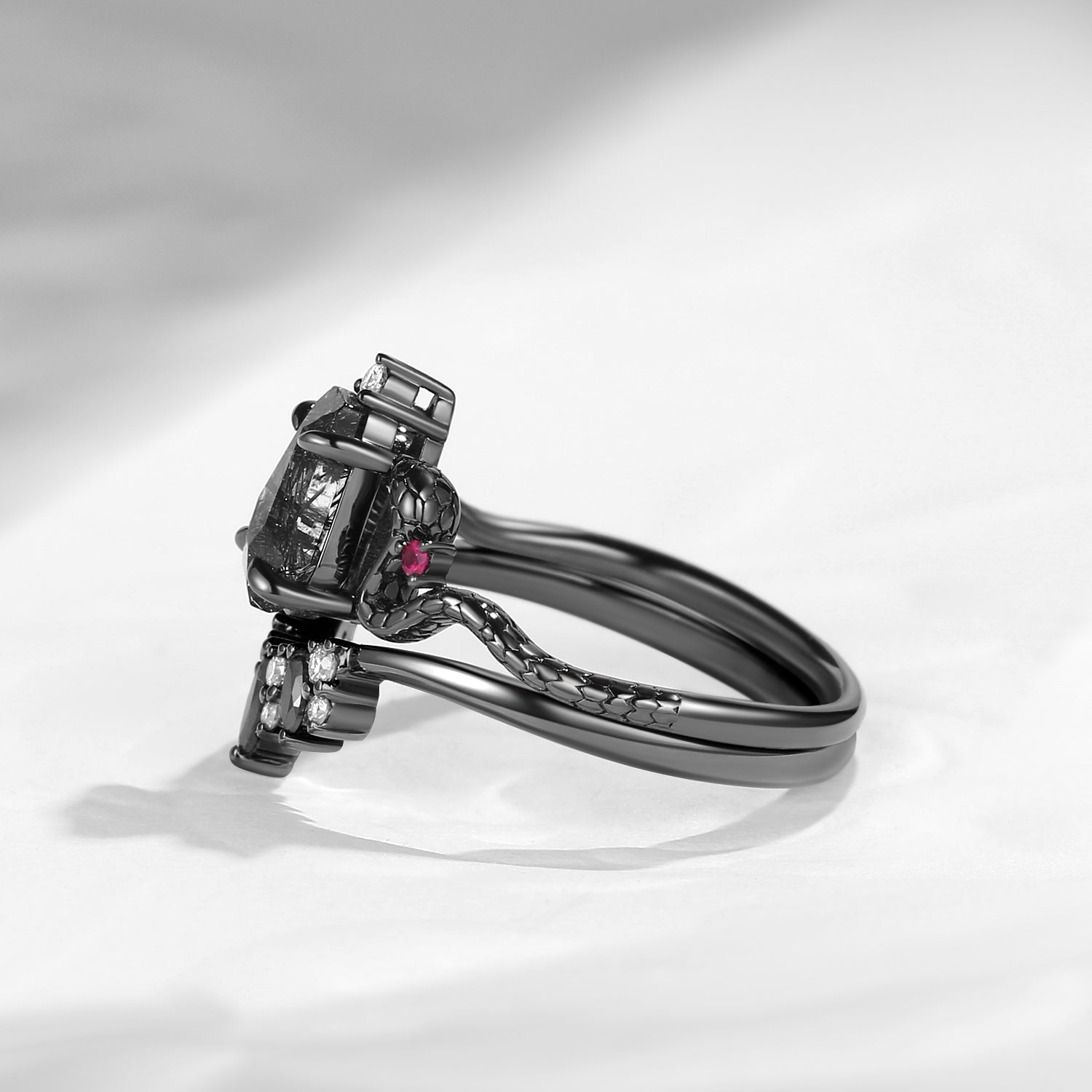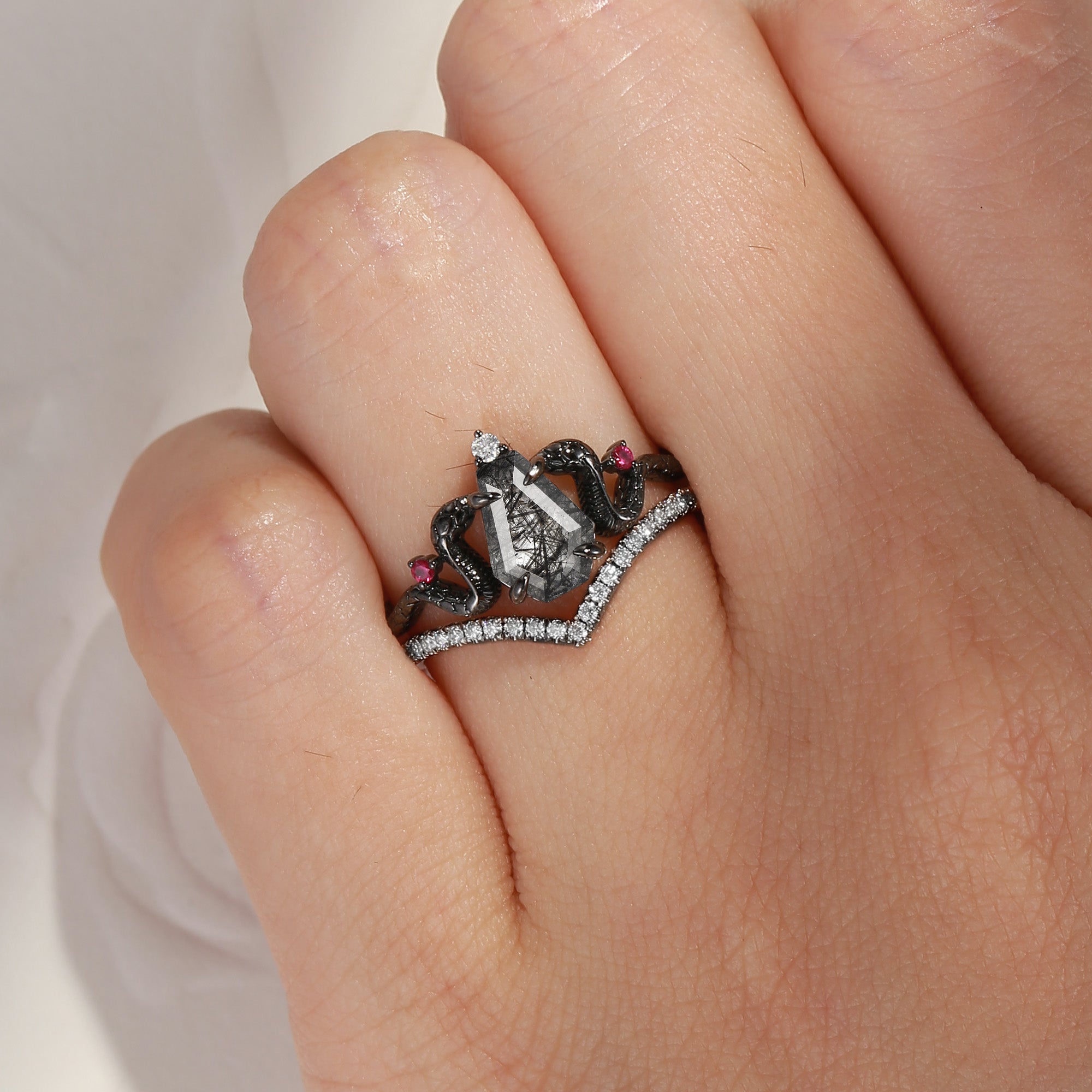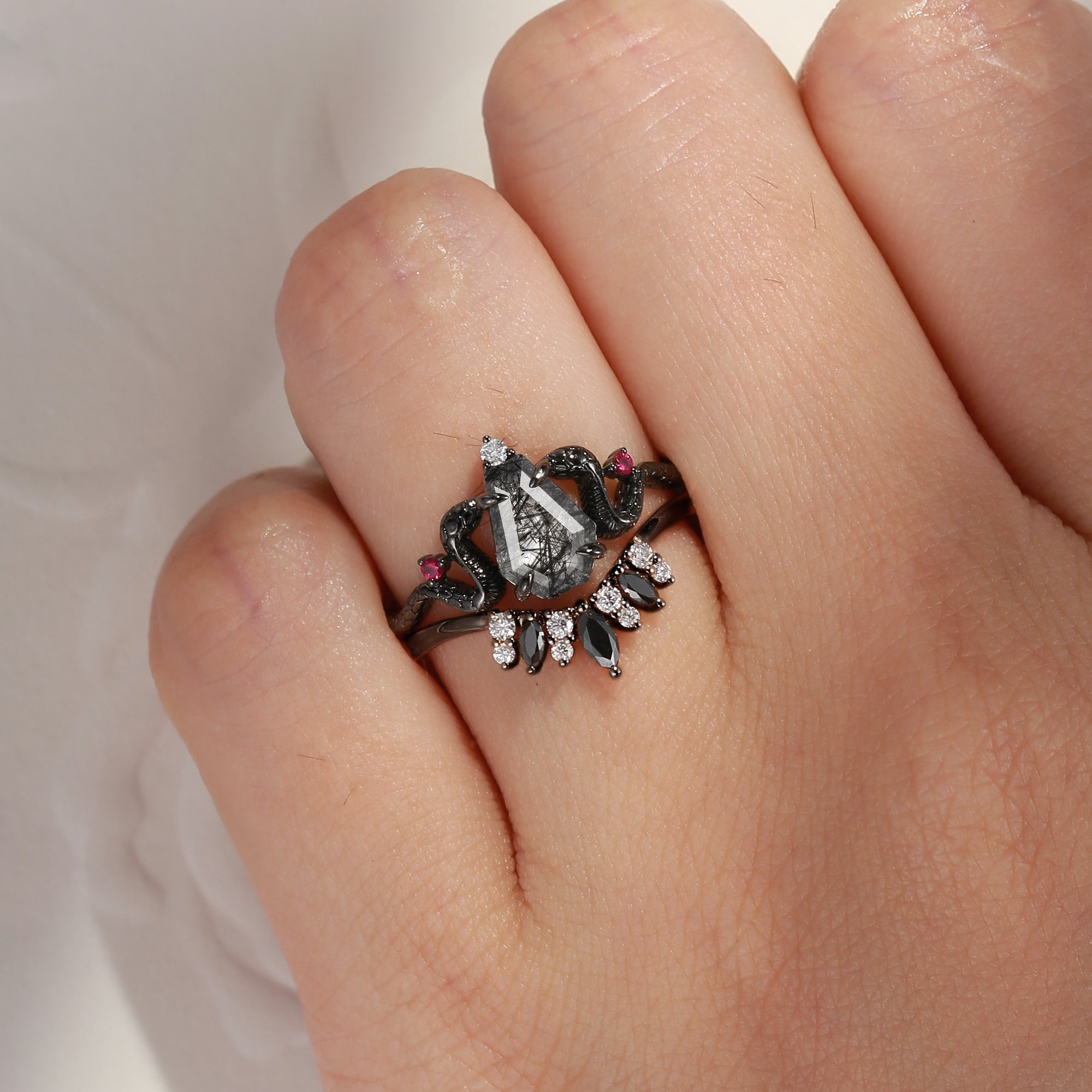 Gothic Coffin Cut Black Rutilated Quartz Engagement Ring - 'Serpent's Embrace'