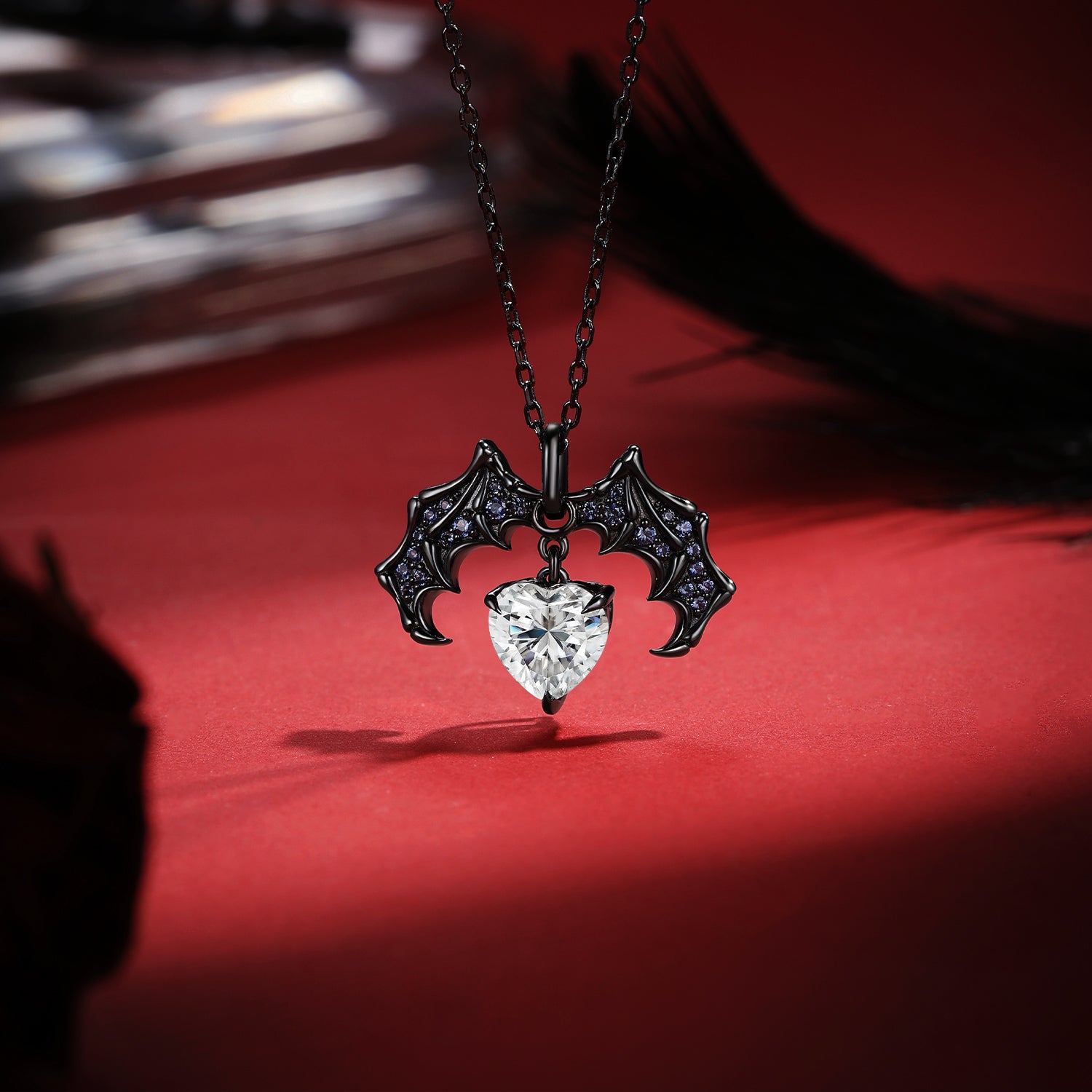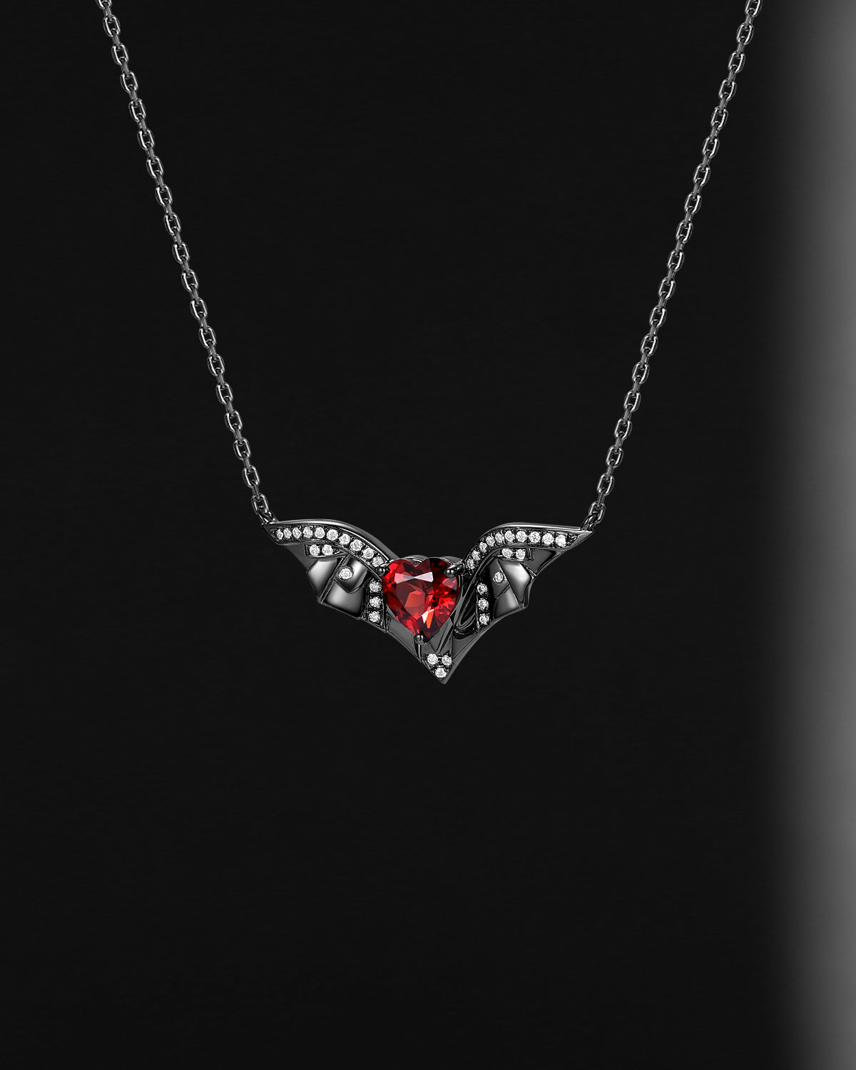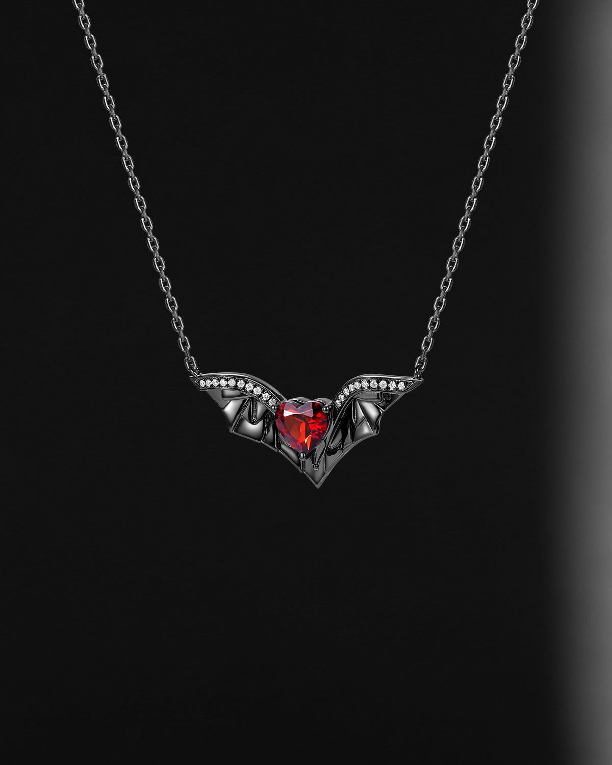 Unique Heart Shaped Garnet Necklace Bat Wing Halloween Jewelry