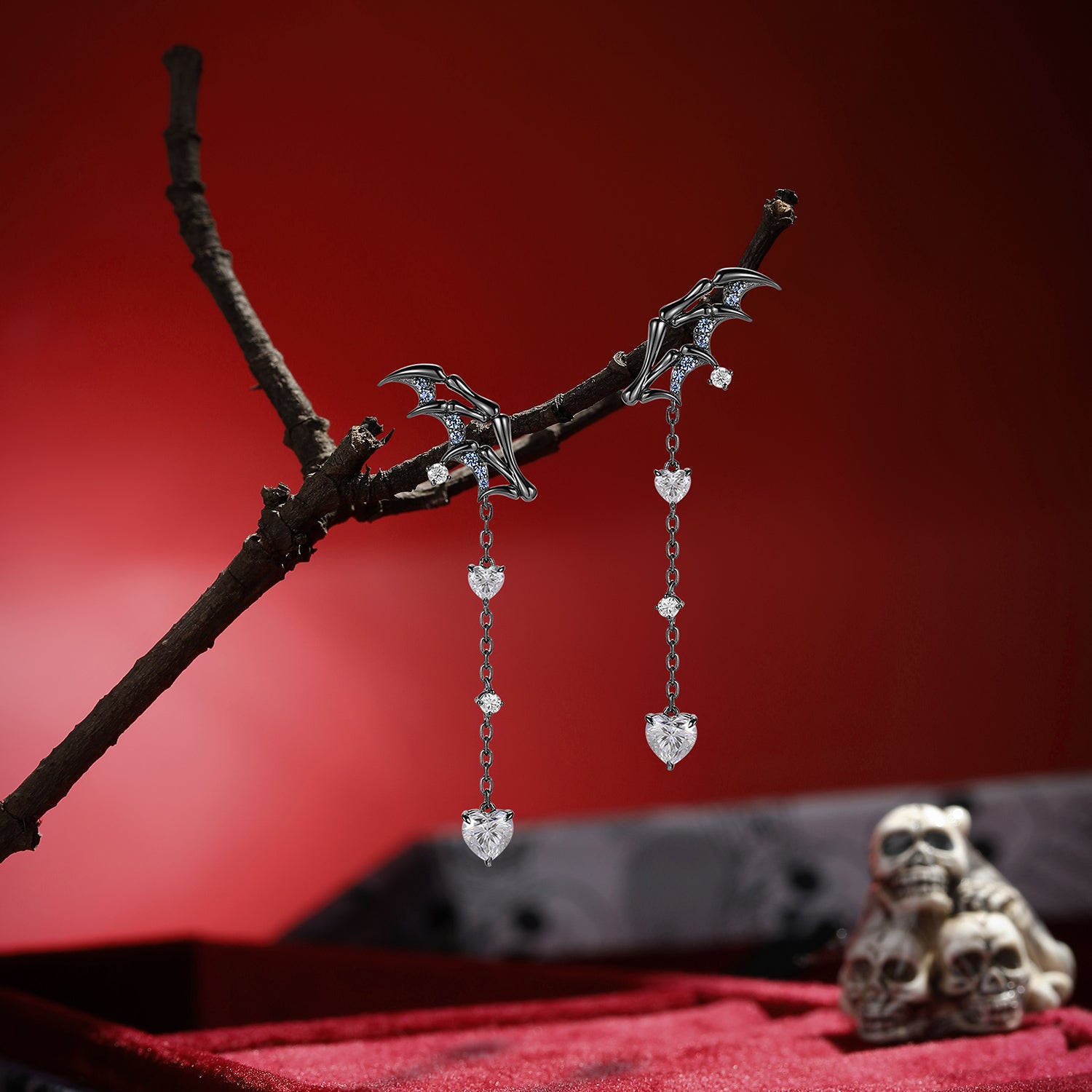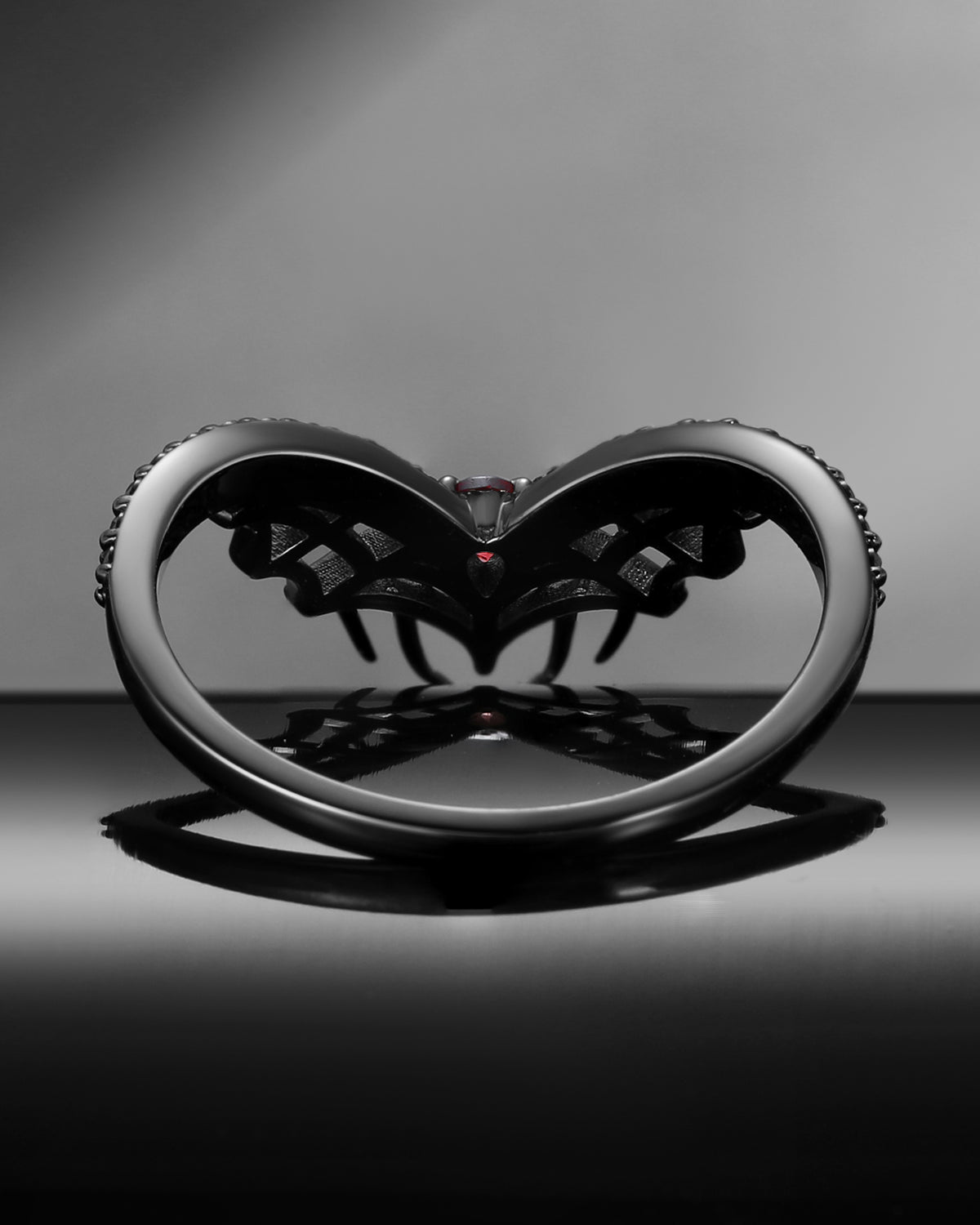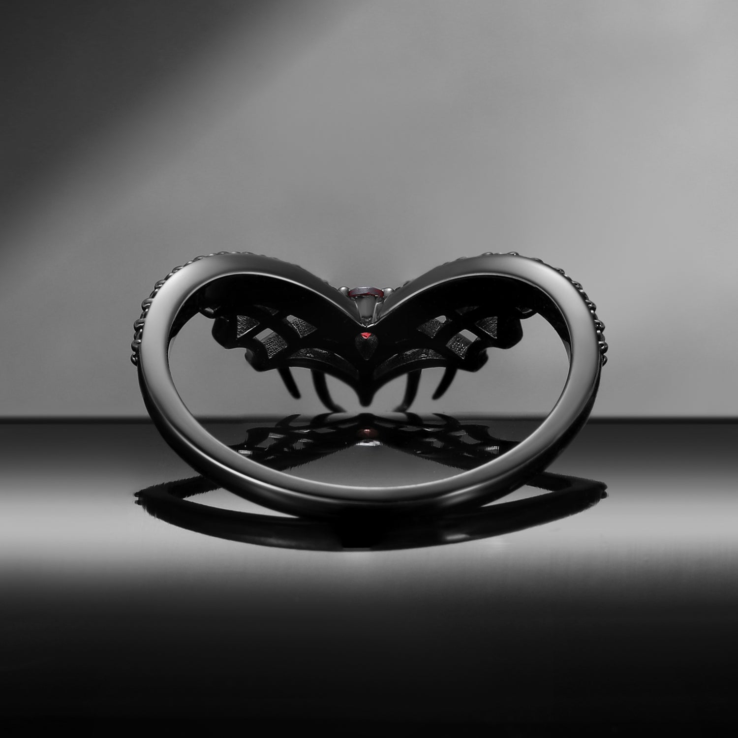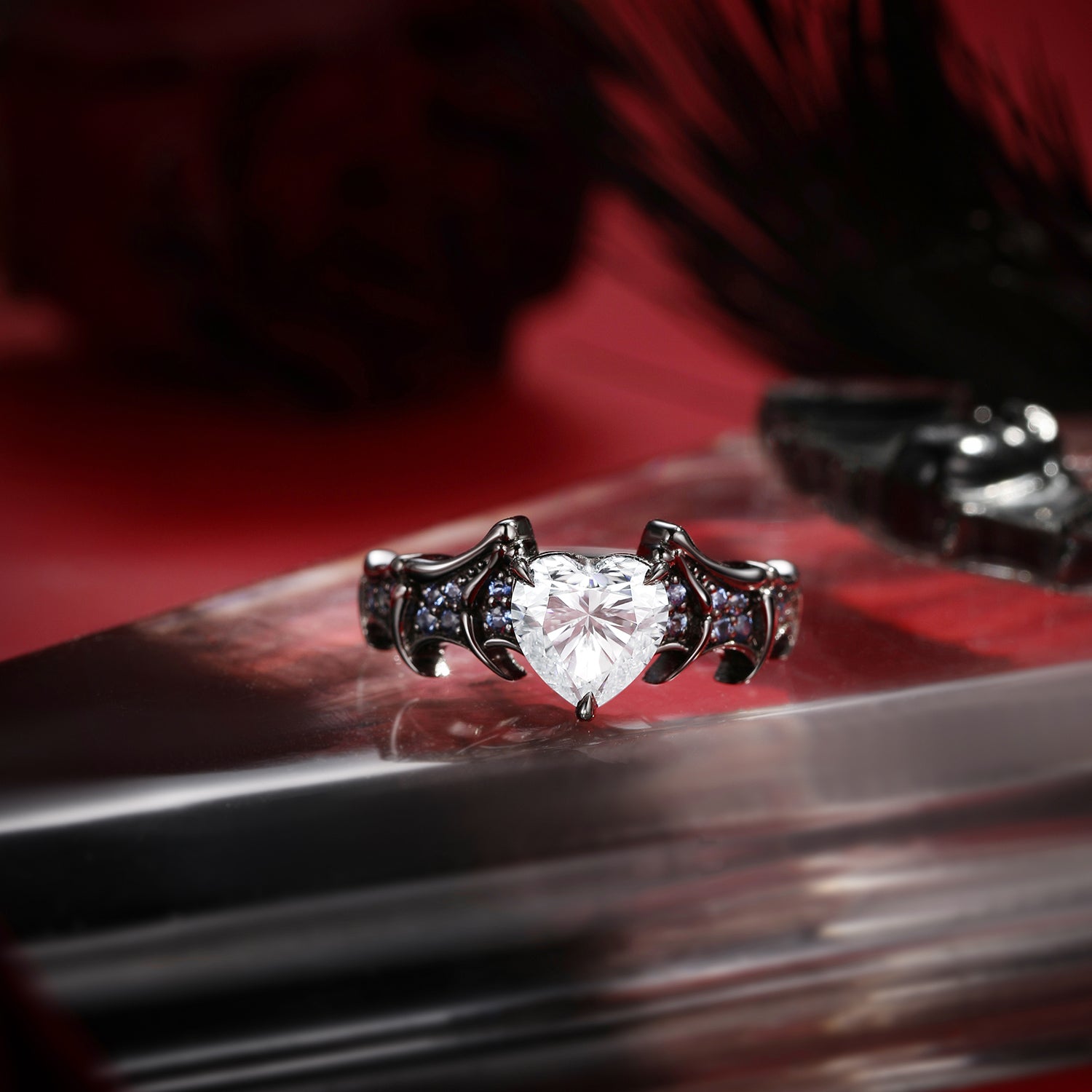 Heart Shaped Moissanite Gothic Inspired Black Gold Engagement Ring - Bat Ring