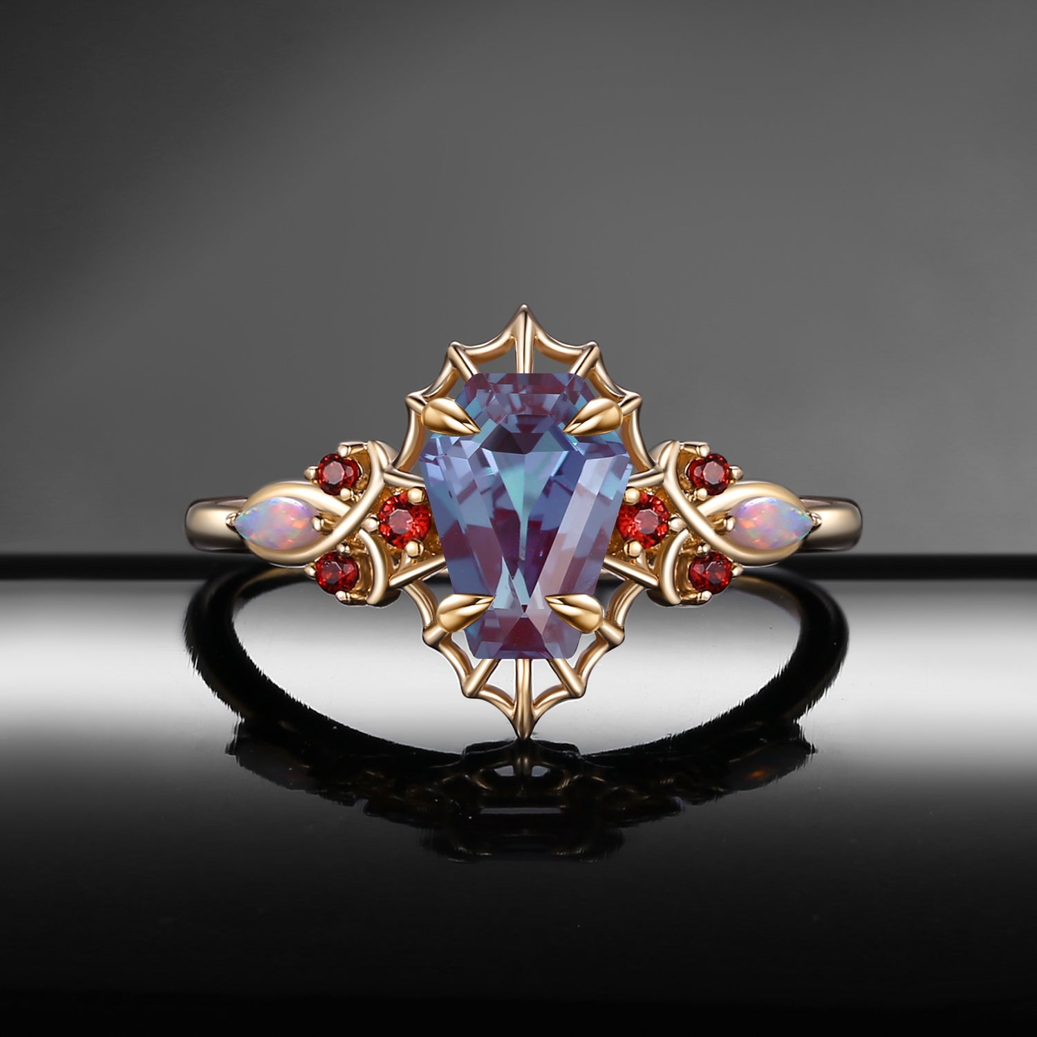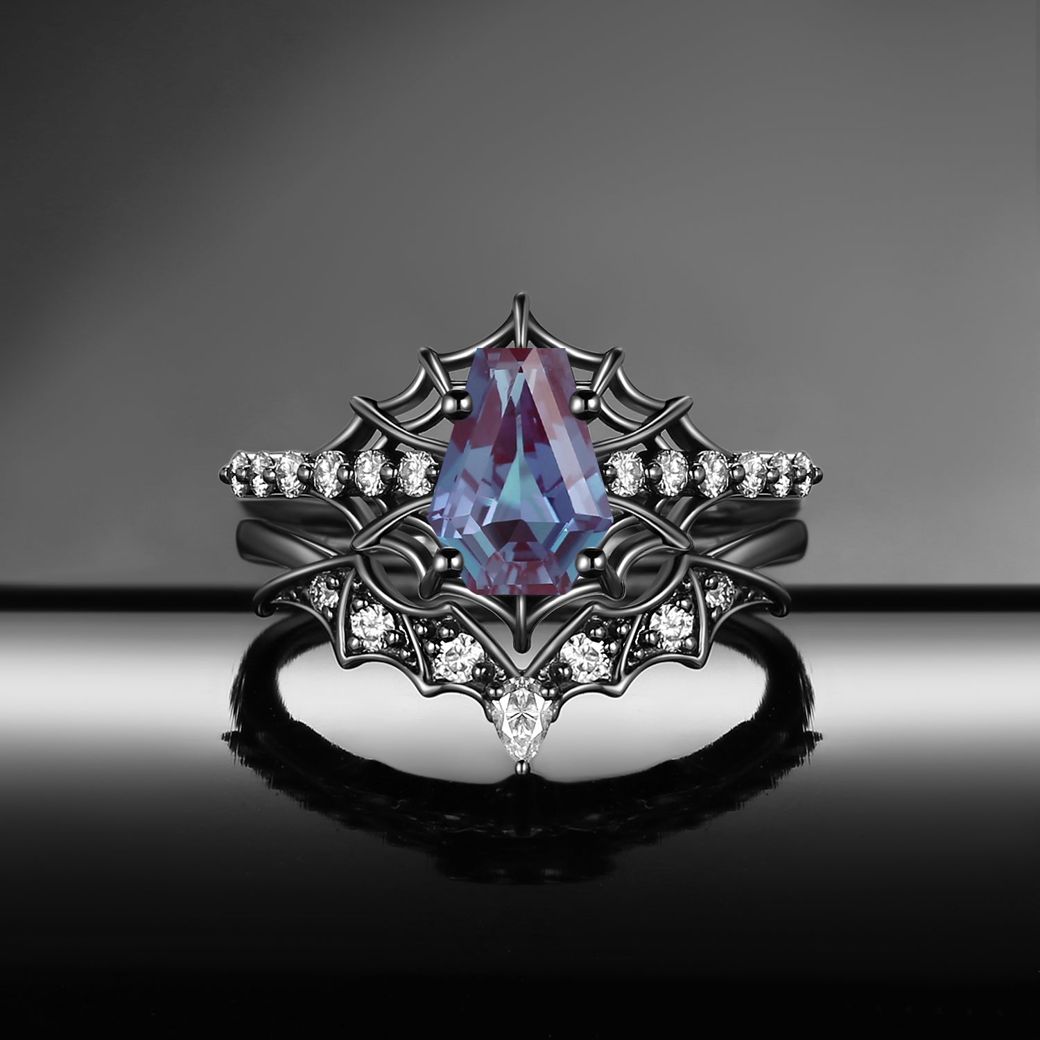 Gothic Coffin Cut Lab Alexandrite Spider Web Black Gold Engagement Ring