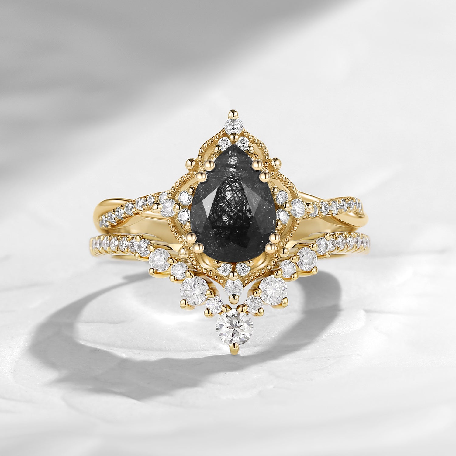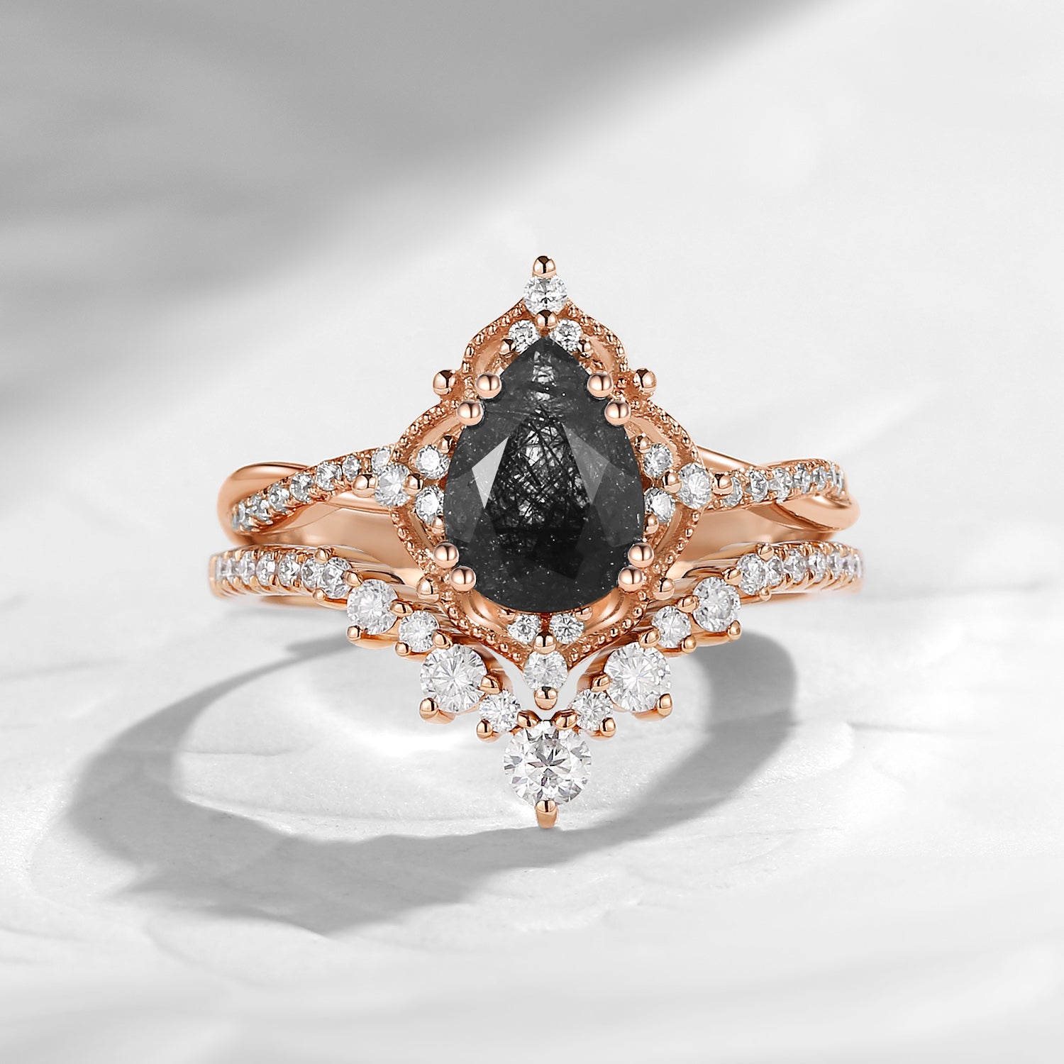 Vintage Inspired Pear Cut Black Rutilated Quartz Infinity Engagement Ring 2pcs