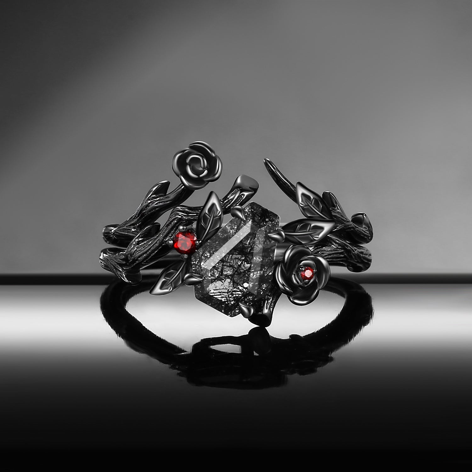 Gothic Inspired Coffin Cut Moissanite Black Gold Vines & Thorns Engagement Ring