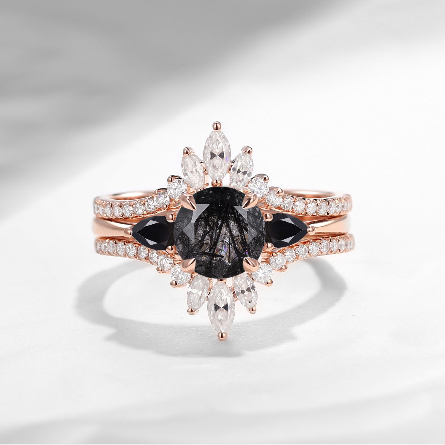 Salt & Pepper Diamonds Engagement Ring Set 3pcs Stacking Rose Gold Bridal Set Marquise Black Rutilated Quartz Cluster Engagement Ring Wedding Band Marquise Moissanite