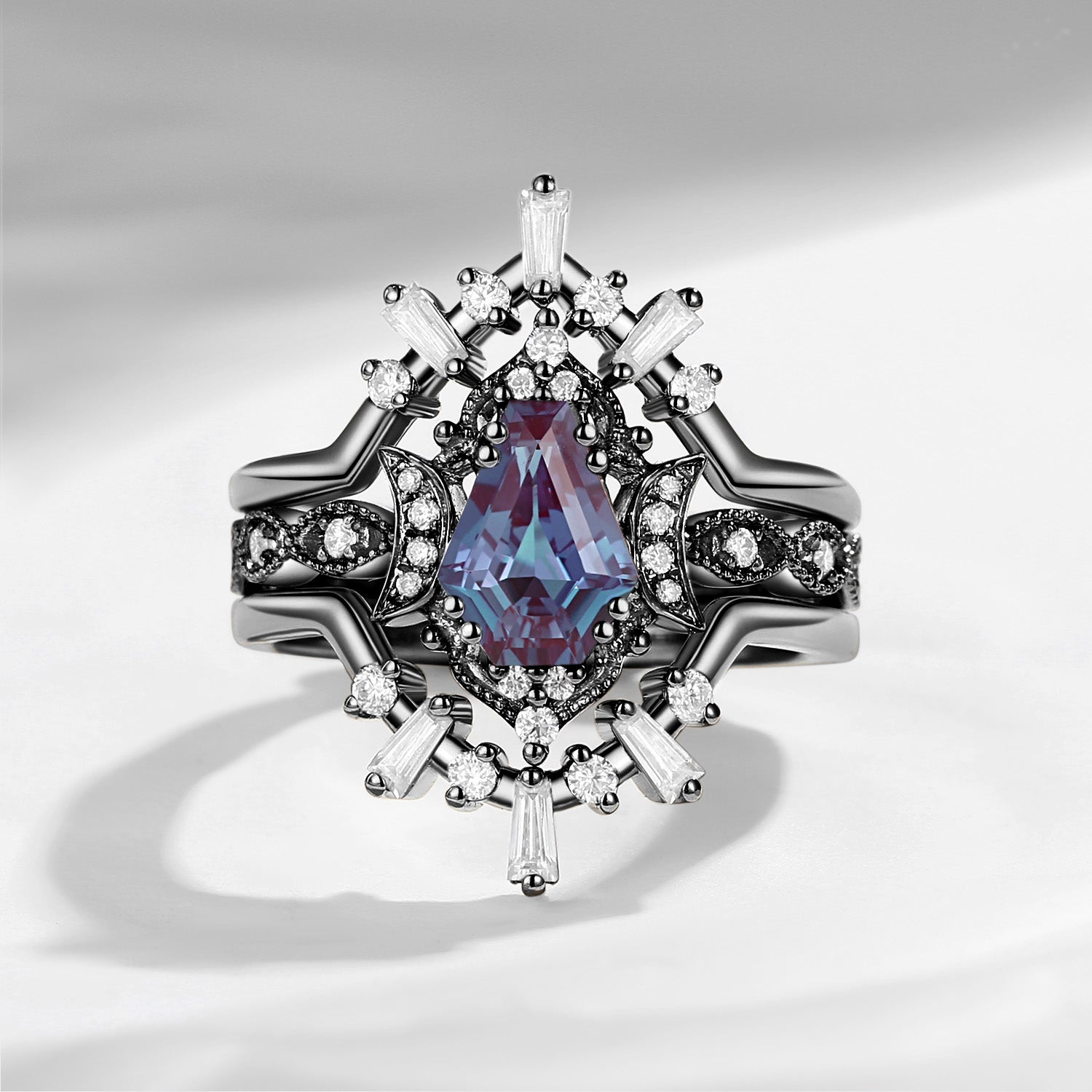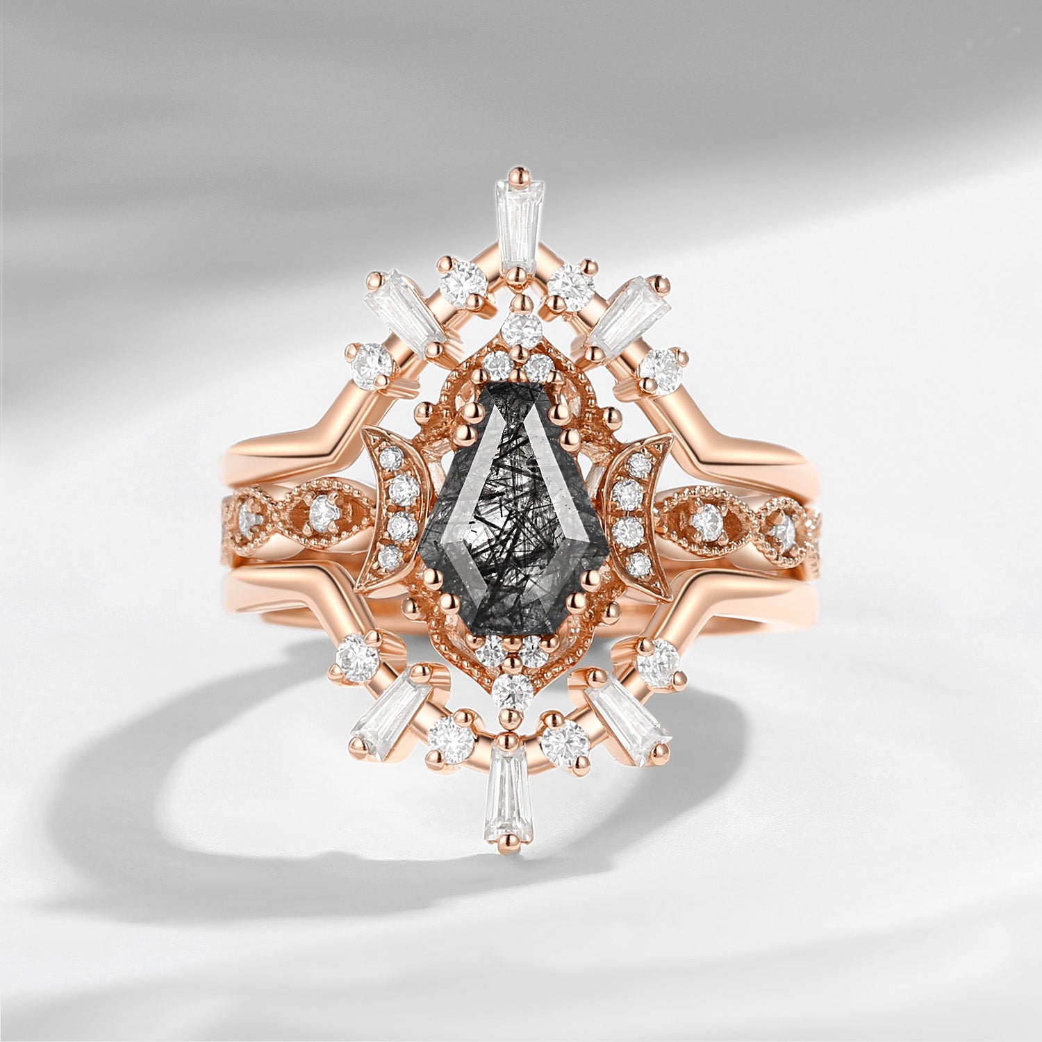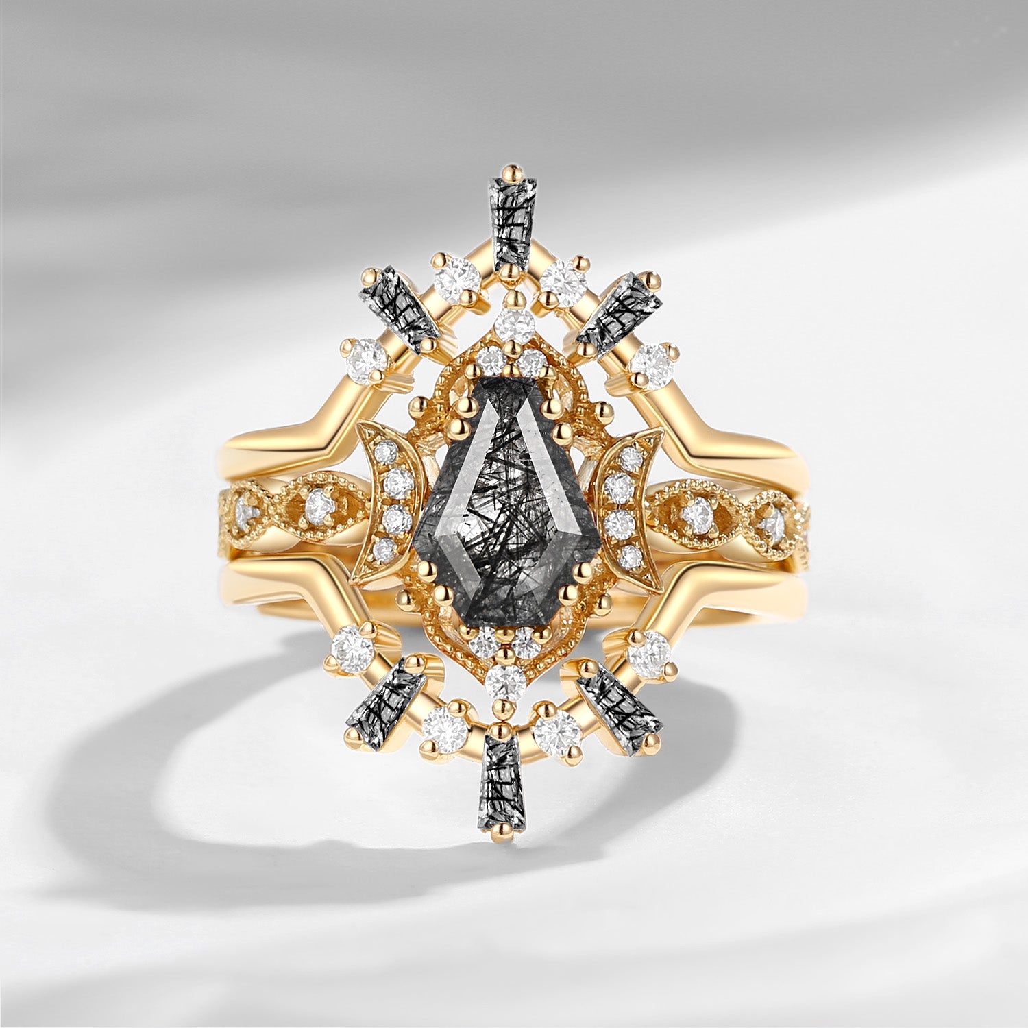 Coffin Black Rutilated Quartz Crescent Engagement Ring 3pcs Moon Bridal Ring Vintage Sunburst Deco Baguette Engagement Ring