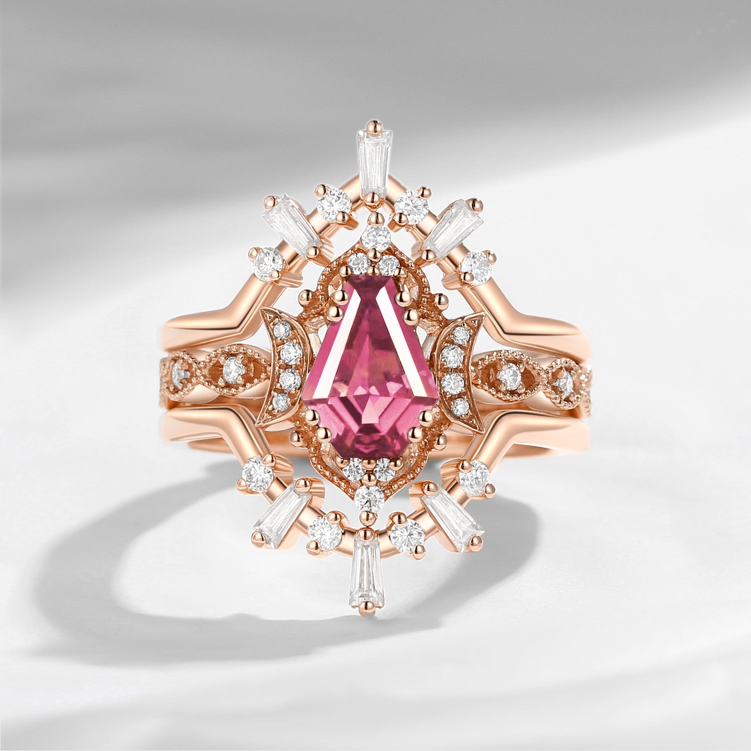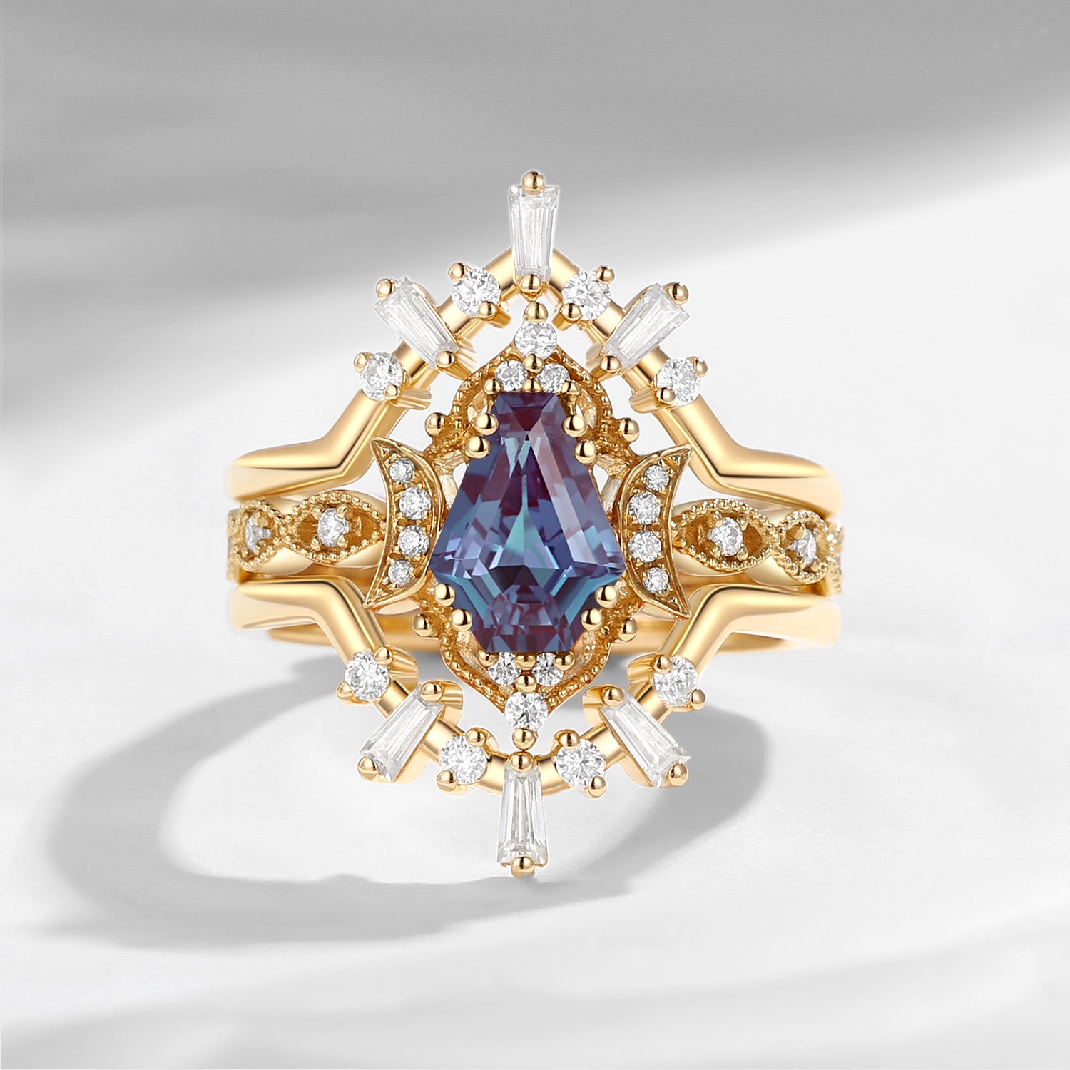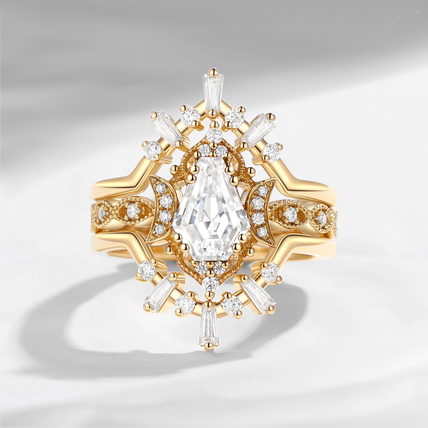 Coffin Black Rutilated Quartz Crescent Engagement Ring 3pcs Moon Bridal Ring Vintage Sunburst Deco Baguette Engagement Ring