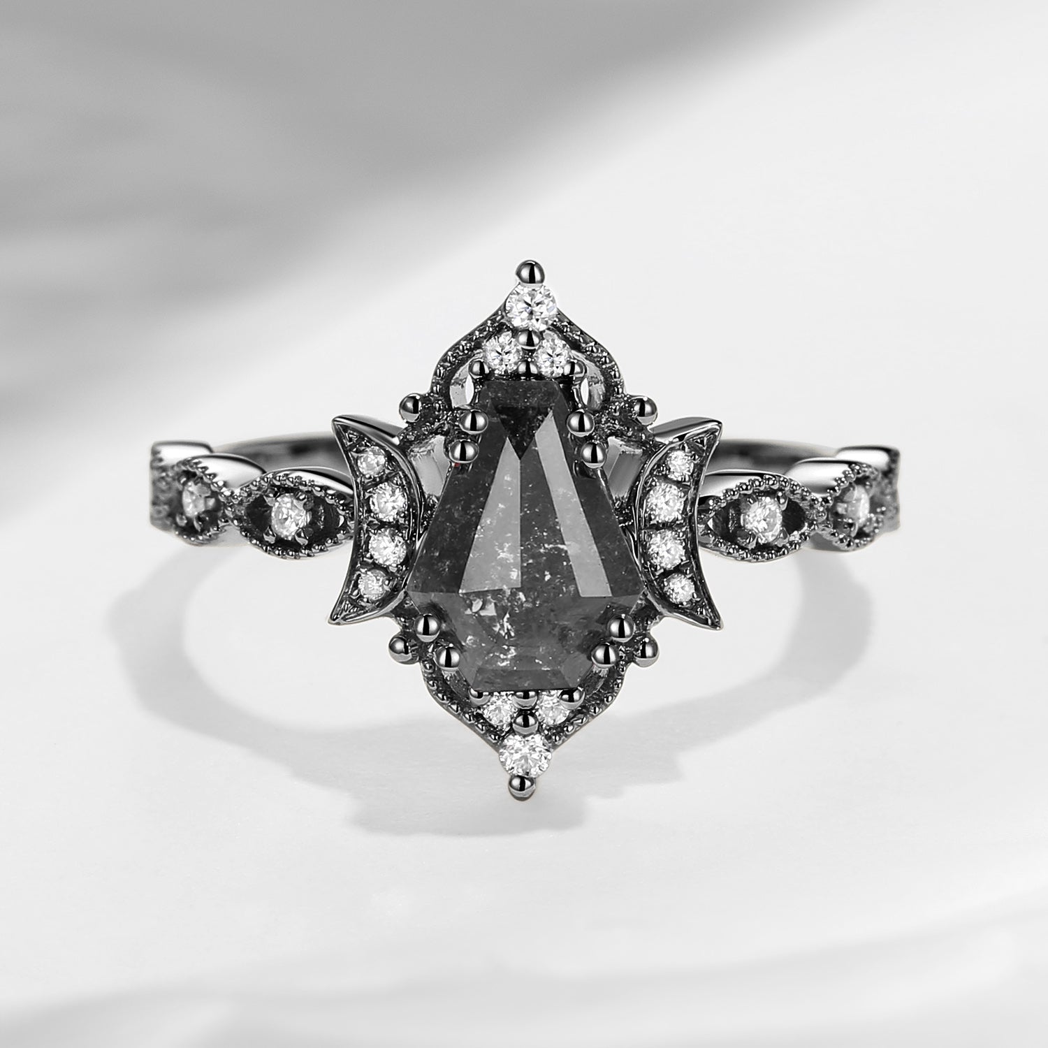 Crescent Moon | Coffin Cut Salt & Pepper Diamond Engagement Ring Unique Engagement Ring