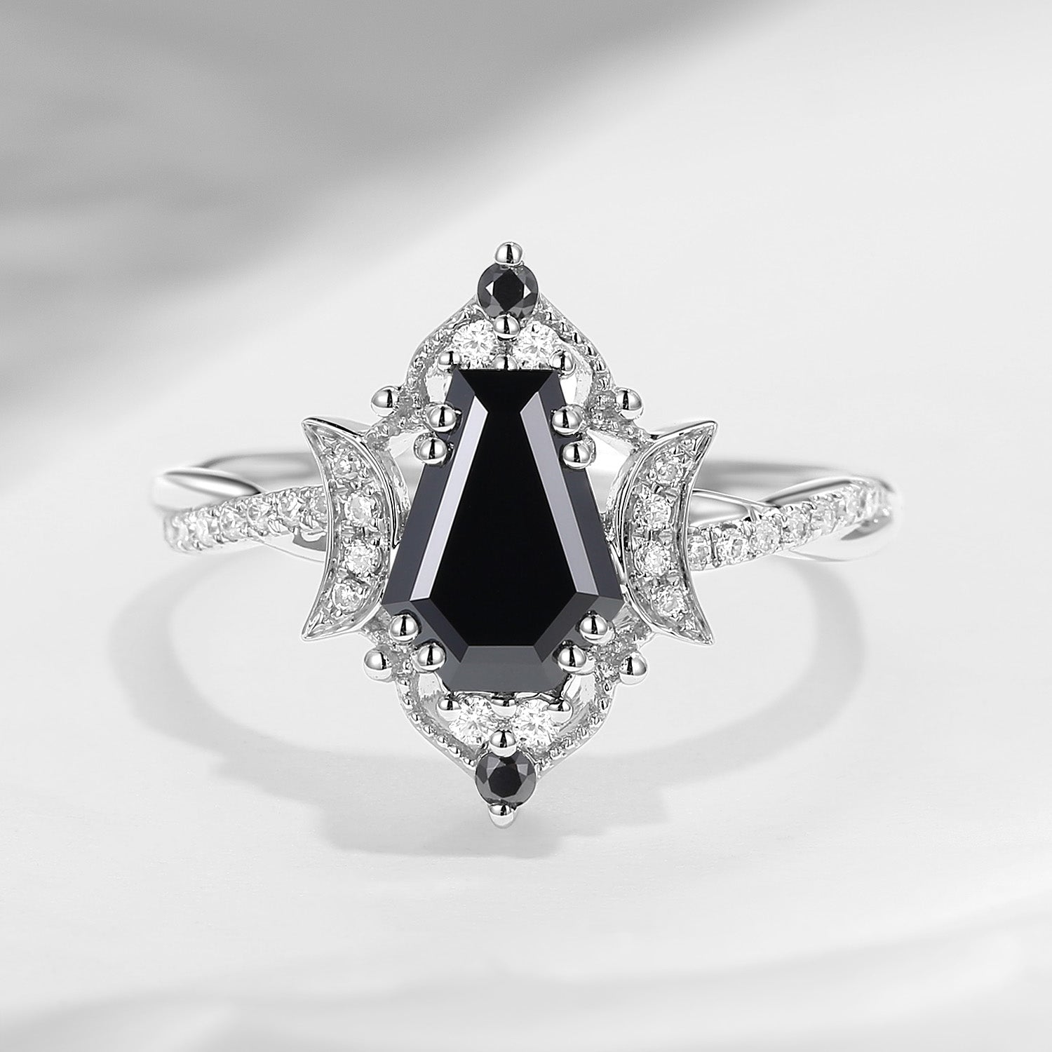 Crescent Moon | Coffin Cut Salt and Pepper Diamond Twisted Engagement Ring Unique Diamond Ring White Gold Vintage Diamond Ring Moon Ring Anniversary Gift