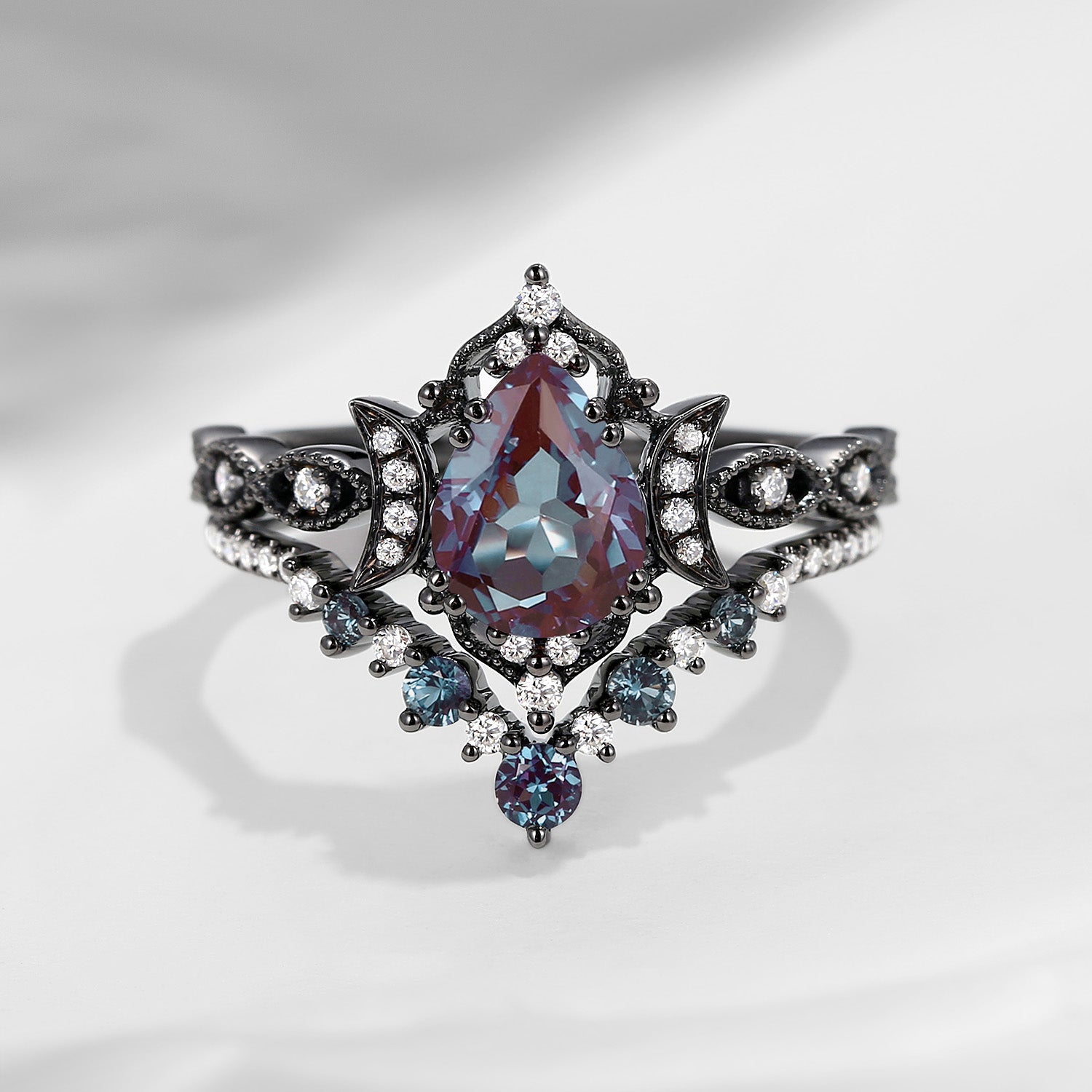 Crescent Moon | Pear Cut Black Rutilated Quartz Garnet Ring Set 2pcs - Waning Moon