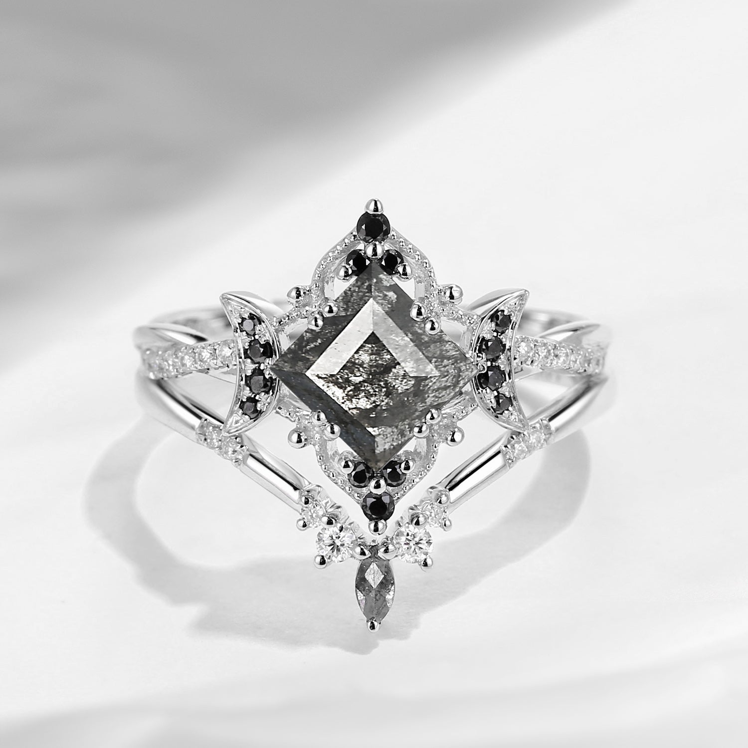 Crescent Moon | Rhombus Cut Salt and Pepper Diamond 'Noir' Engagement Ring Set 2pcs