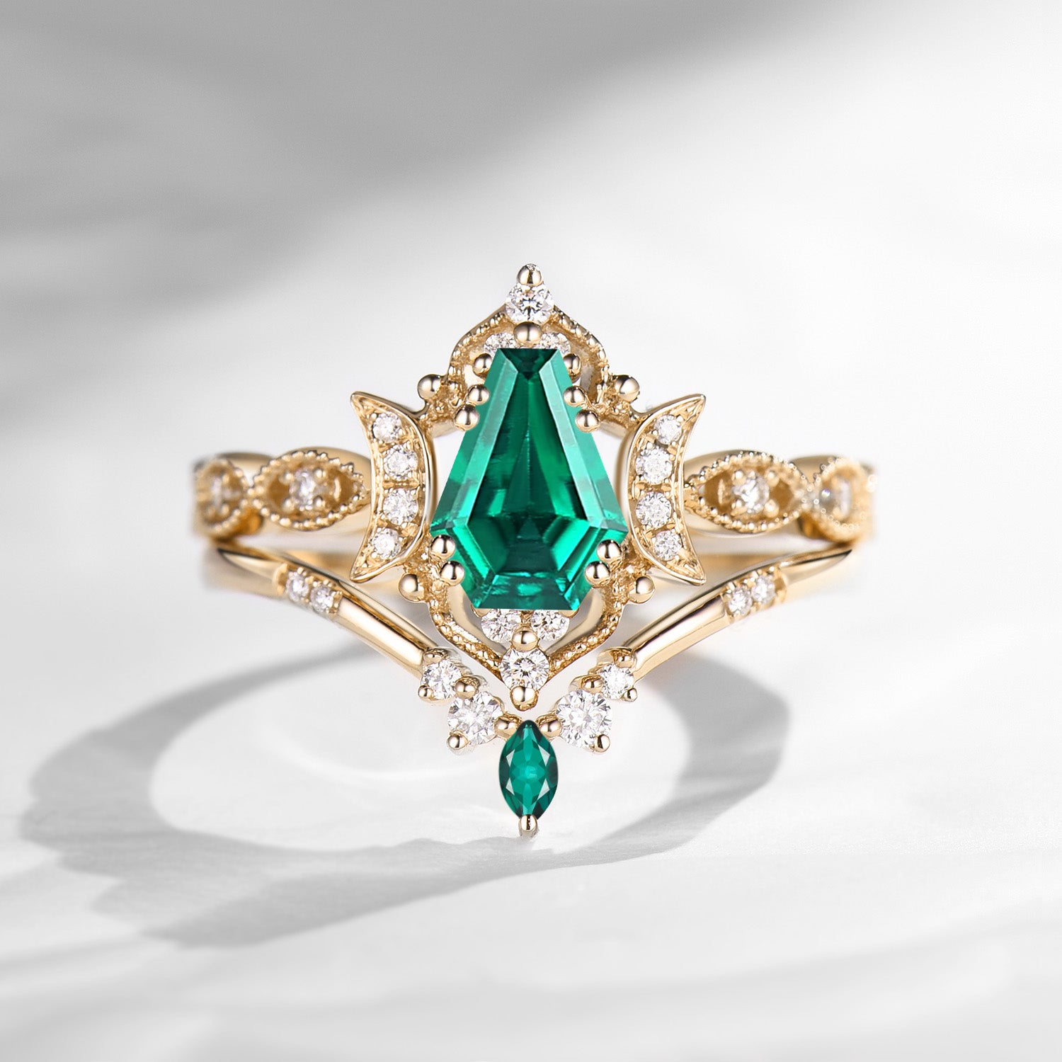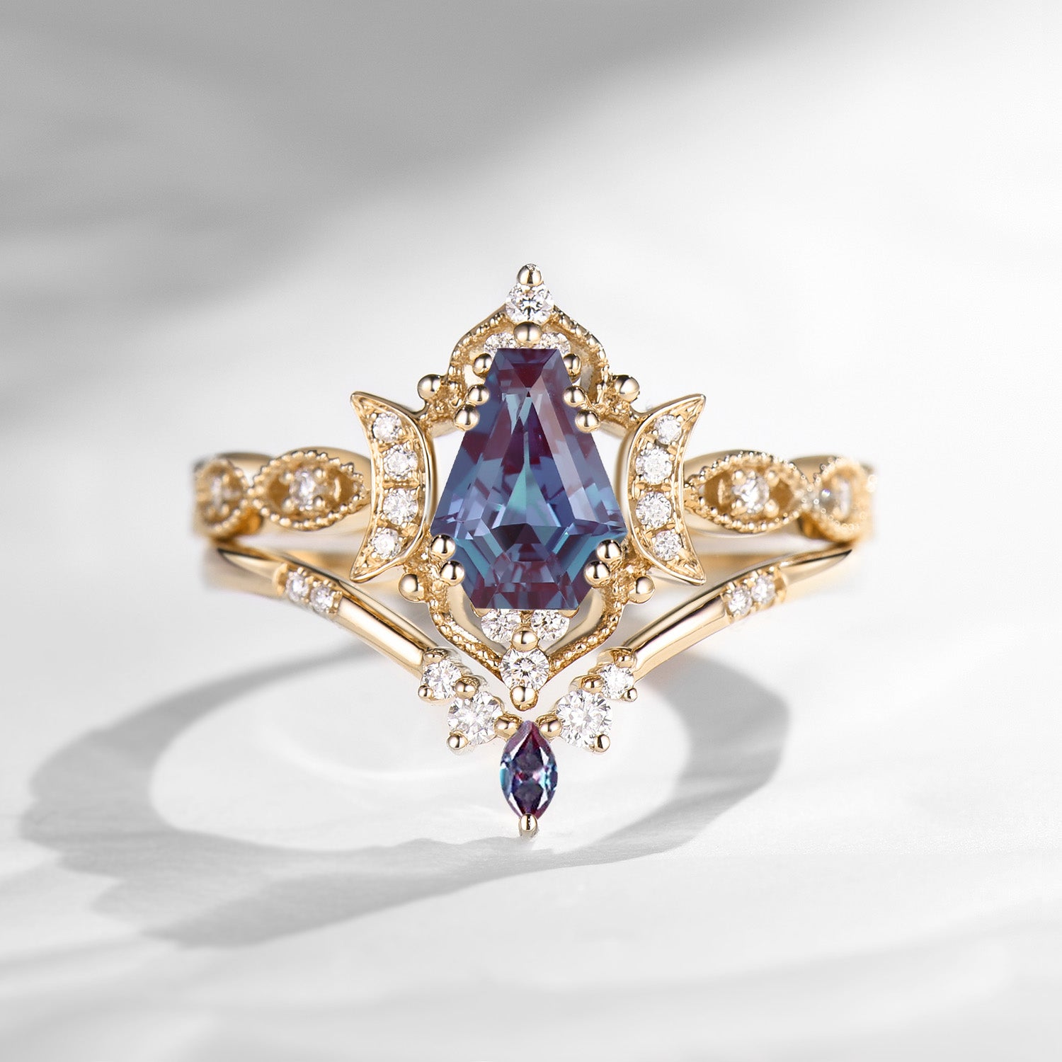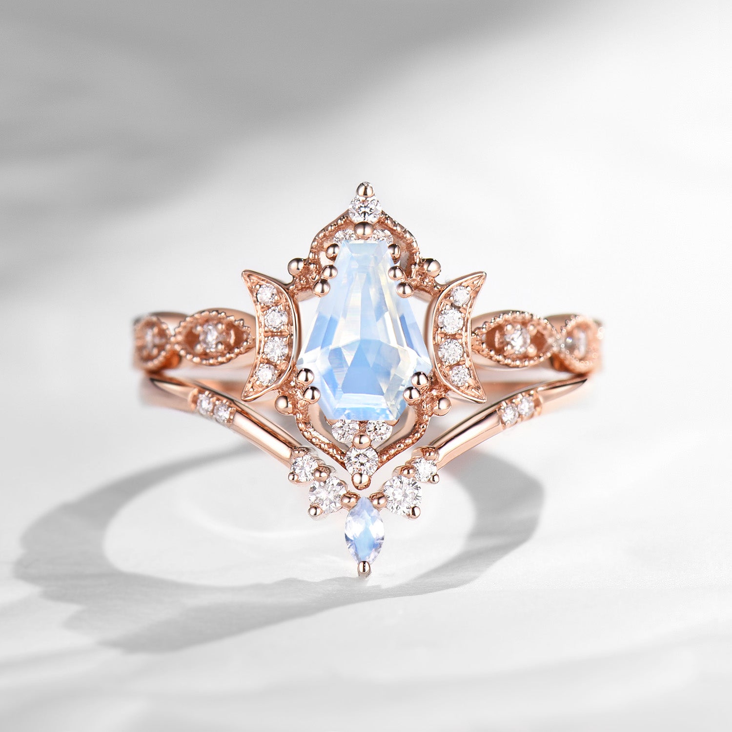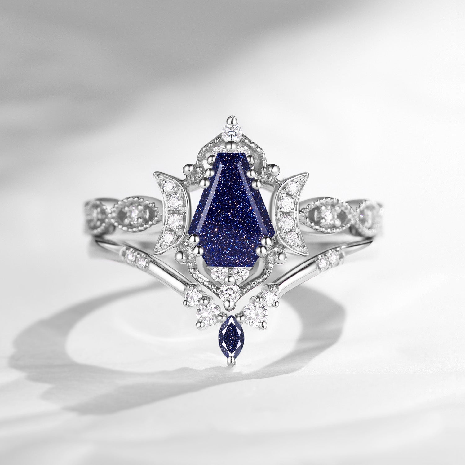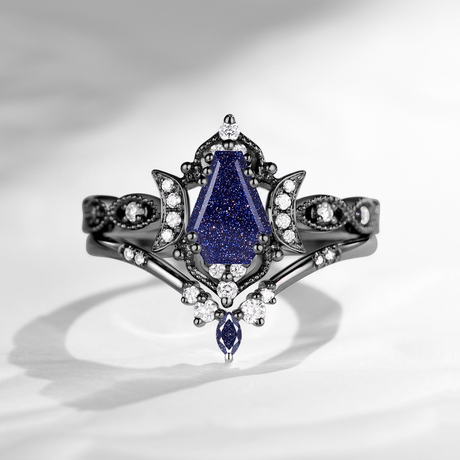• Design - Featuring a delicate milgrain setting with two crescent moons embracing a center coffin, with a matching band to add some sparkle and moonlight to your Starland.