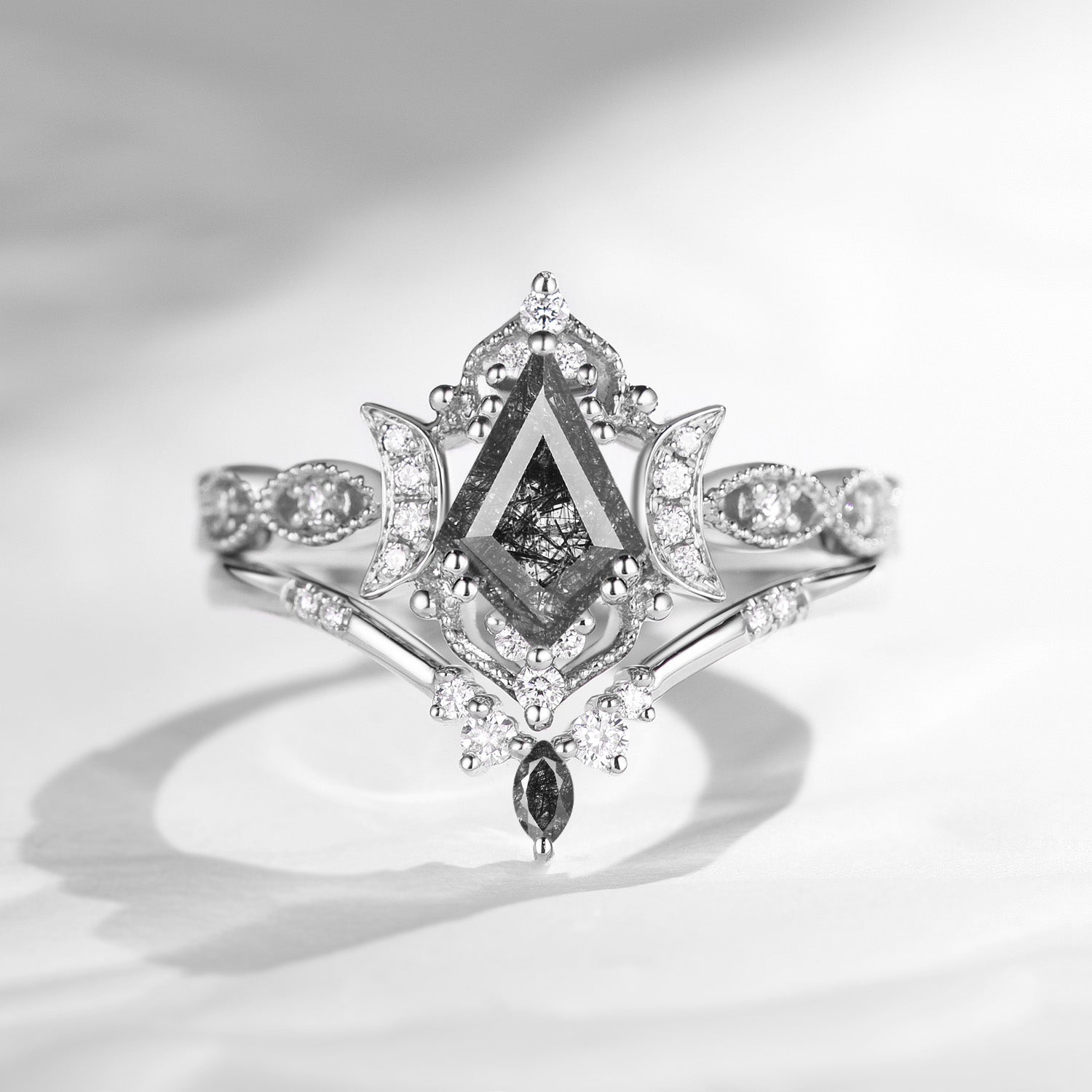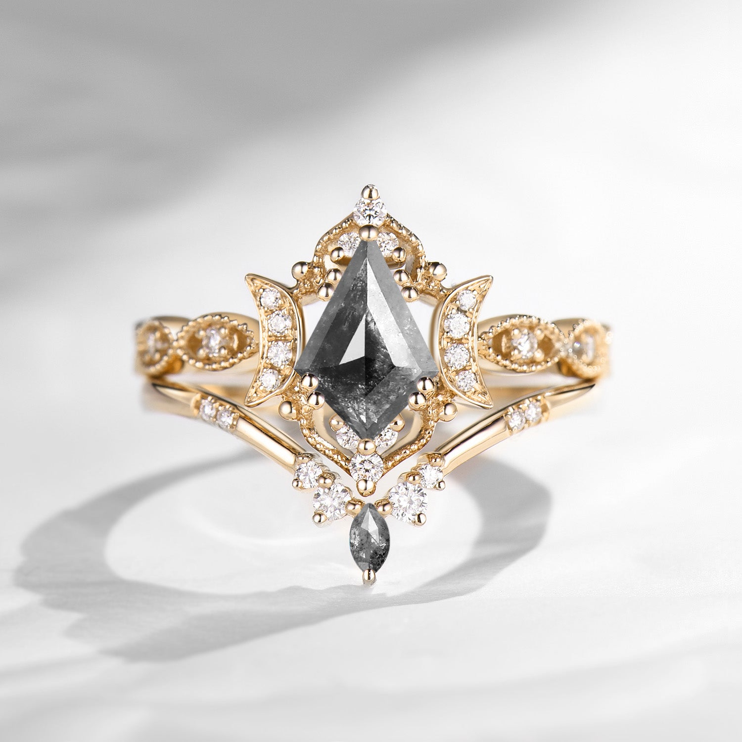 Crescent Moon | Unique Kite Cut Natural Salt And Pepper Diamond Black Gold Engagement Ring Set 2pcs - Luna