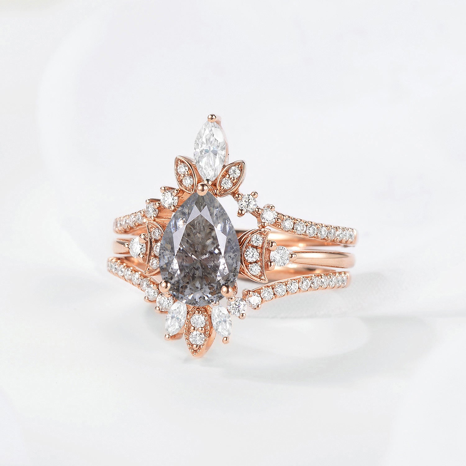 Crescent moon | Vintage Inspired Pear Cut Salt & Pepper Diamond Engagement Ring Set 3pcs