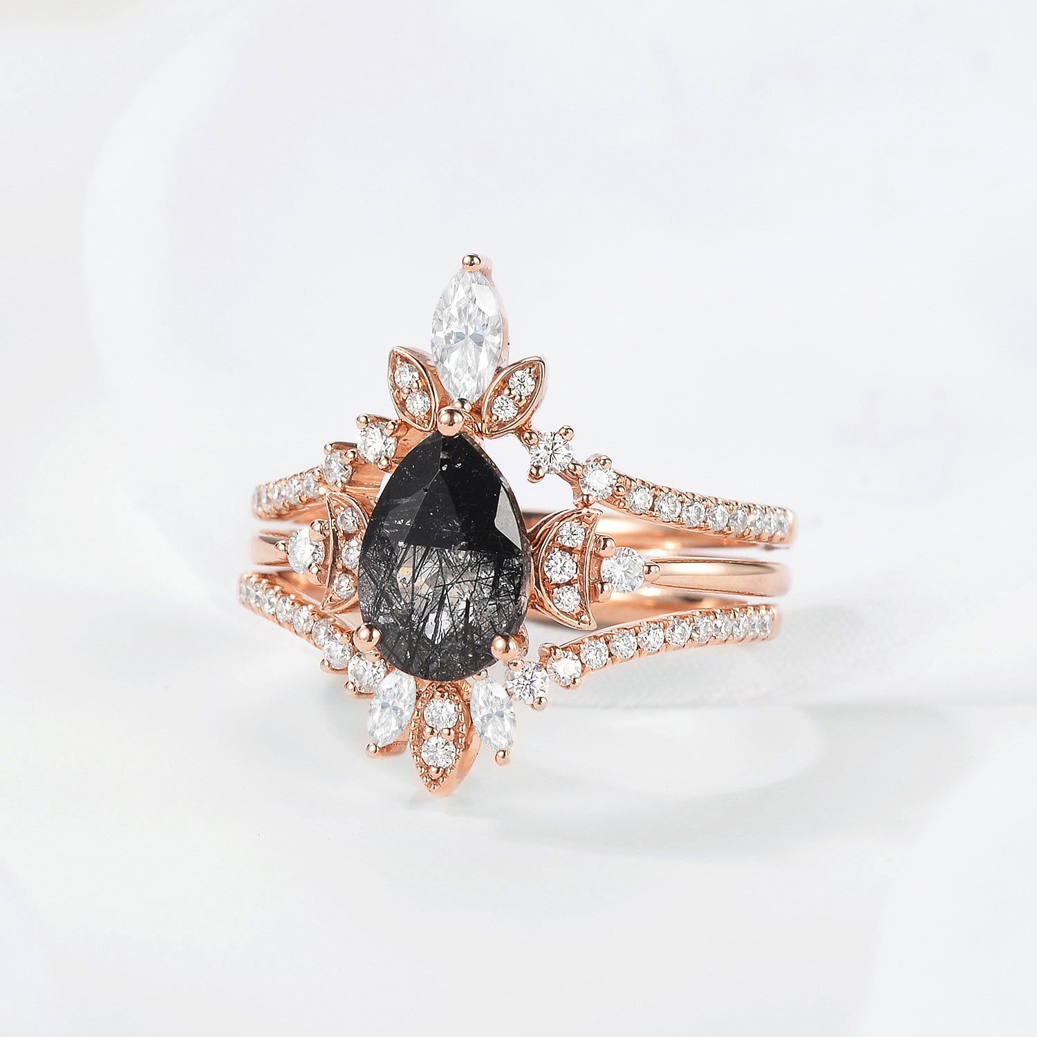 Crescent moon | Vintage Inspired Pear Cut Black Rutilated Quartz Engagement Ring Set 3pcs