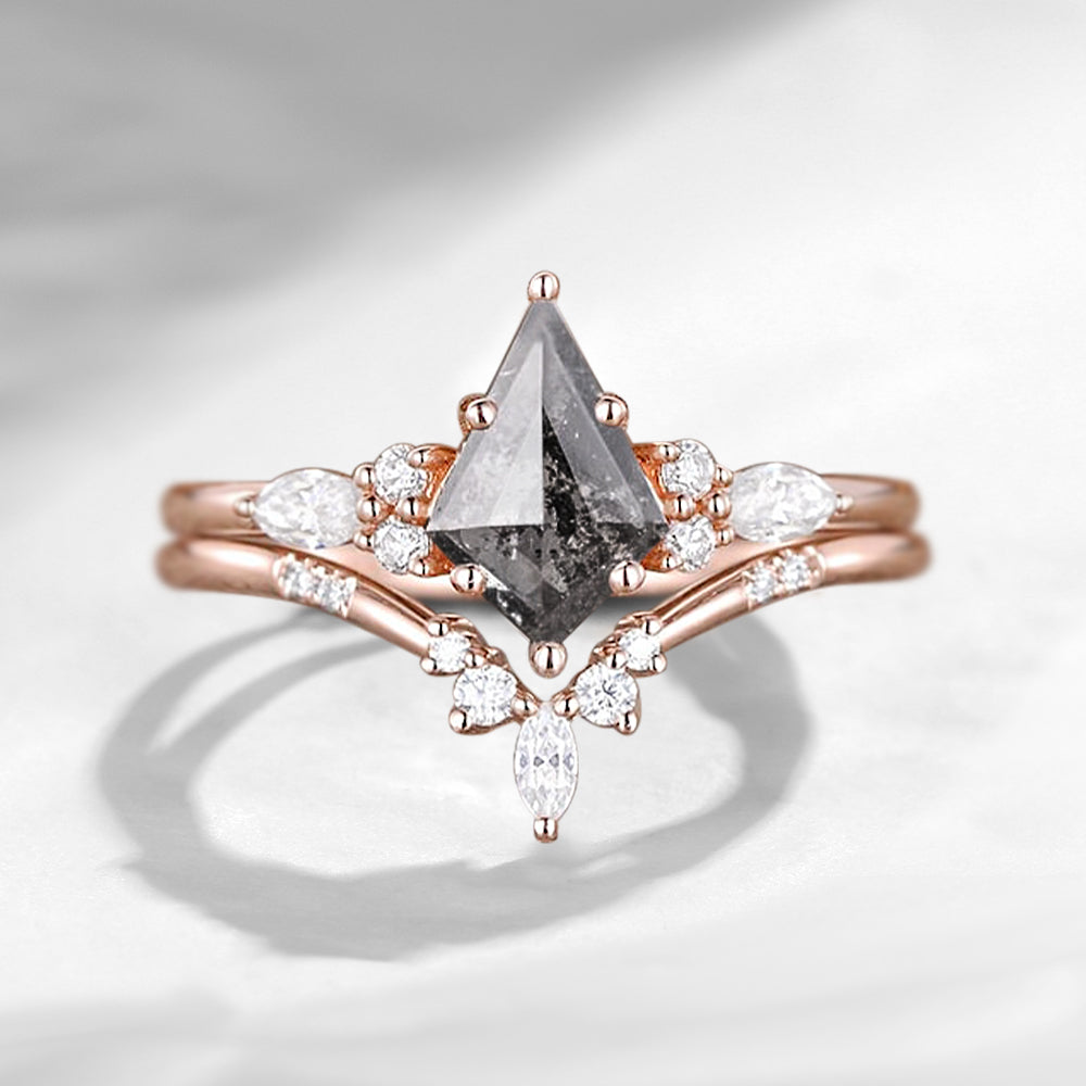 Kite Natural Salt and Pepper Diamond Engagement Ring White Gold Engagement Ring Dainty Wedding Ring Set Bridal Set Women