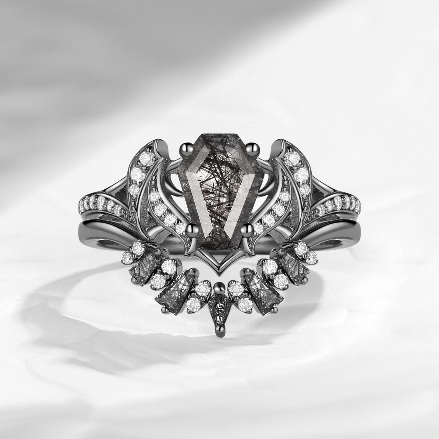 Unique Coffin Shaped Black Rutilated Quartz Bat Wing Inspired Engagement Ring Set 2pcs