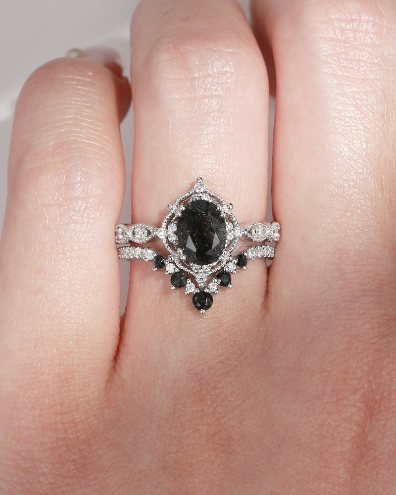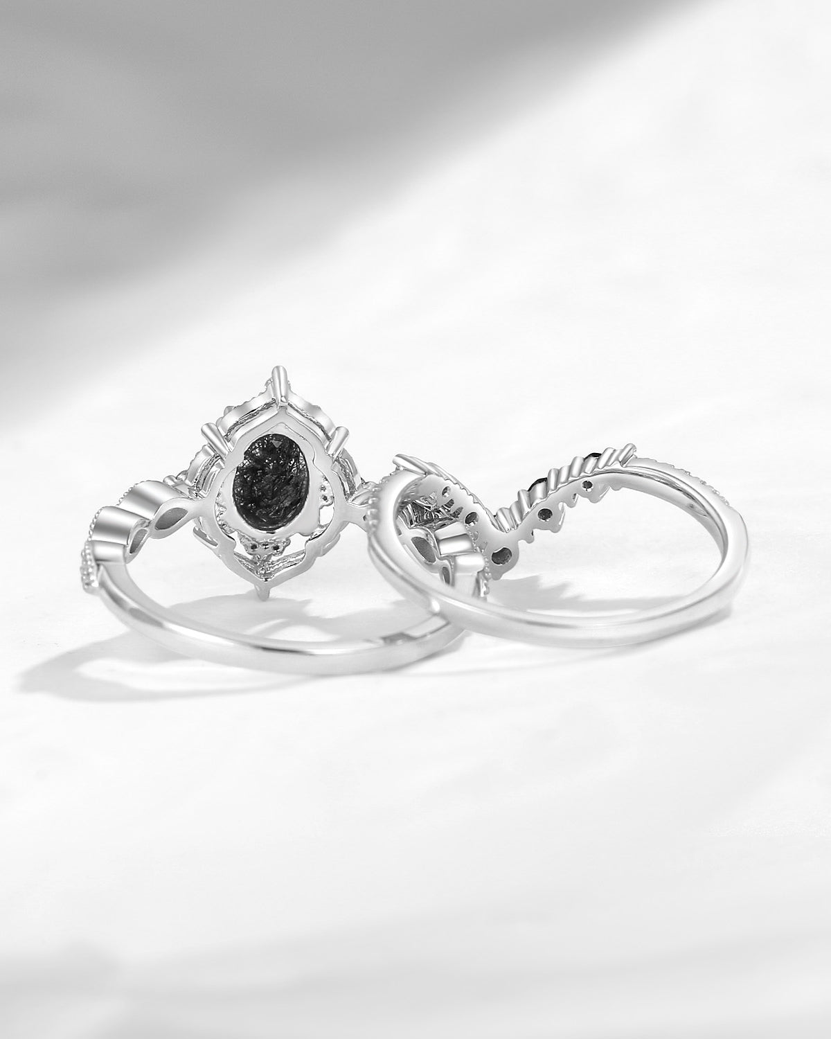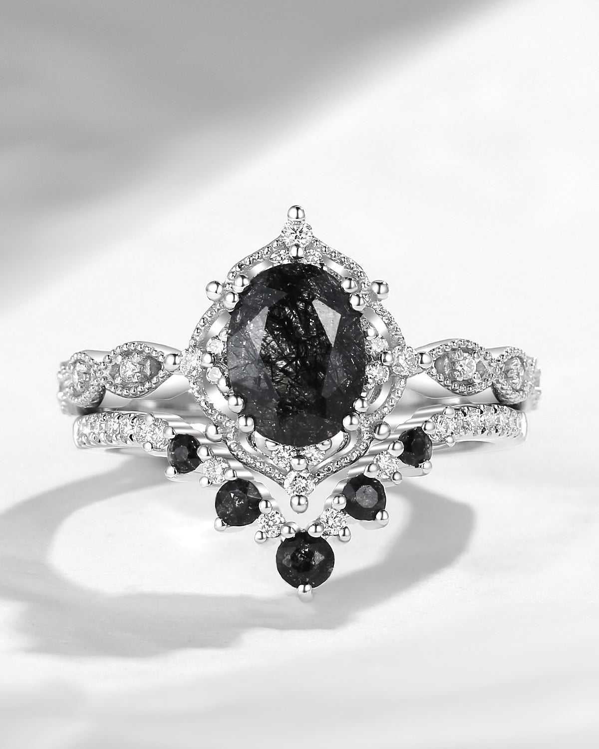 18k Unique Oval Black Rutilated Quartz Chevron Flower Engagement Ring Set 2pcs