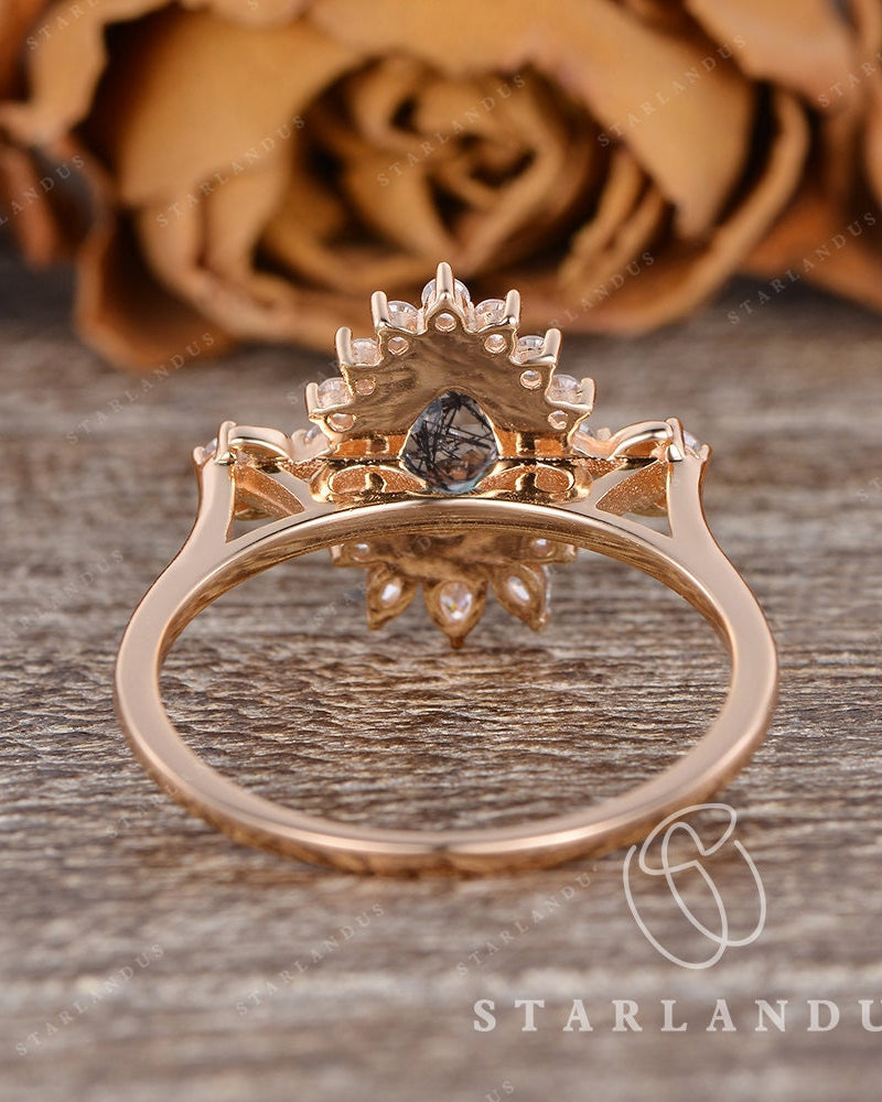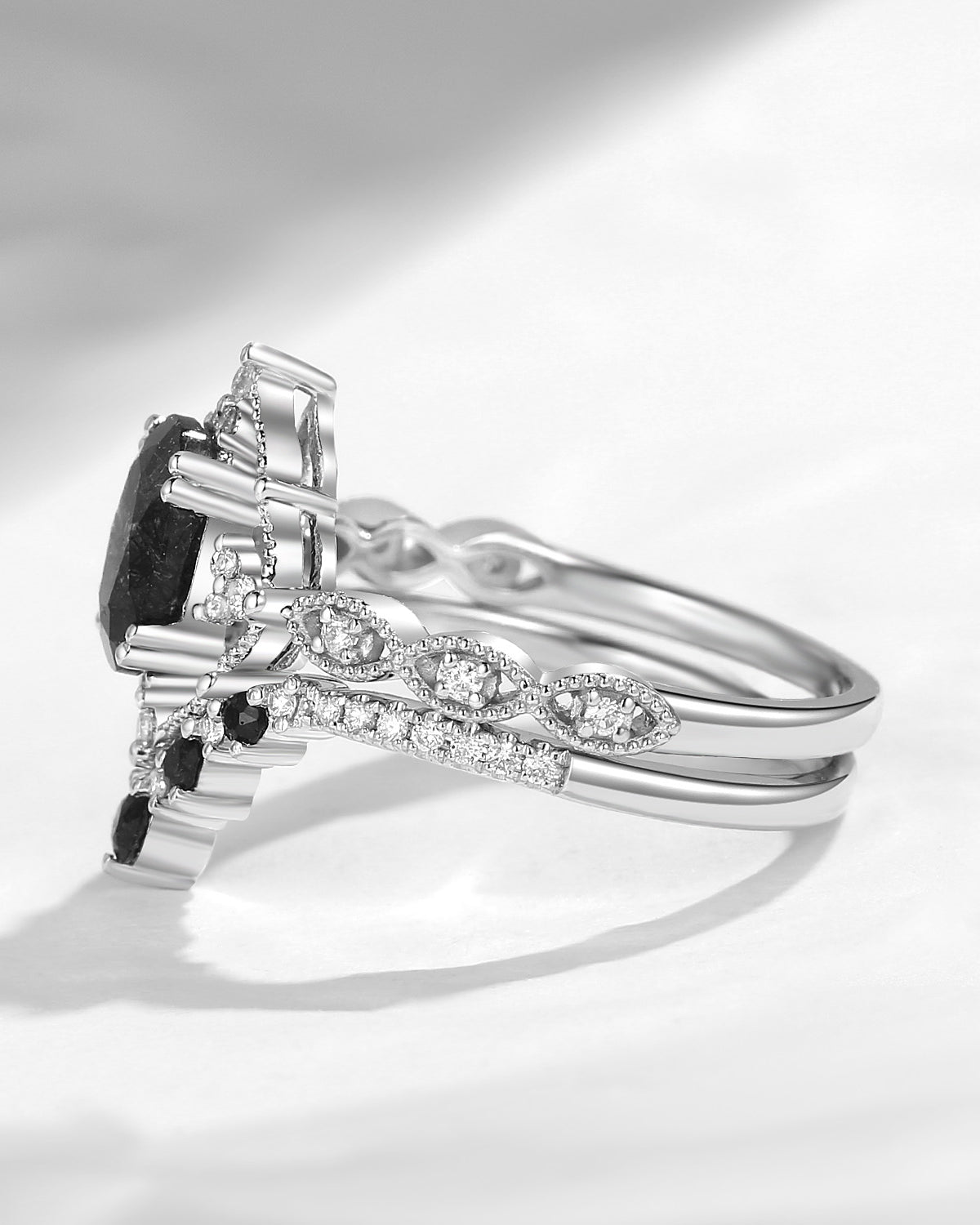 Crescent Moon | Vintage Pear Cut Black Rutilated Quartz Engagement Ring 2pcs - Luna