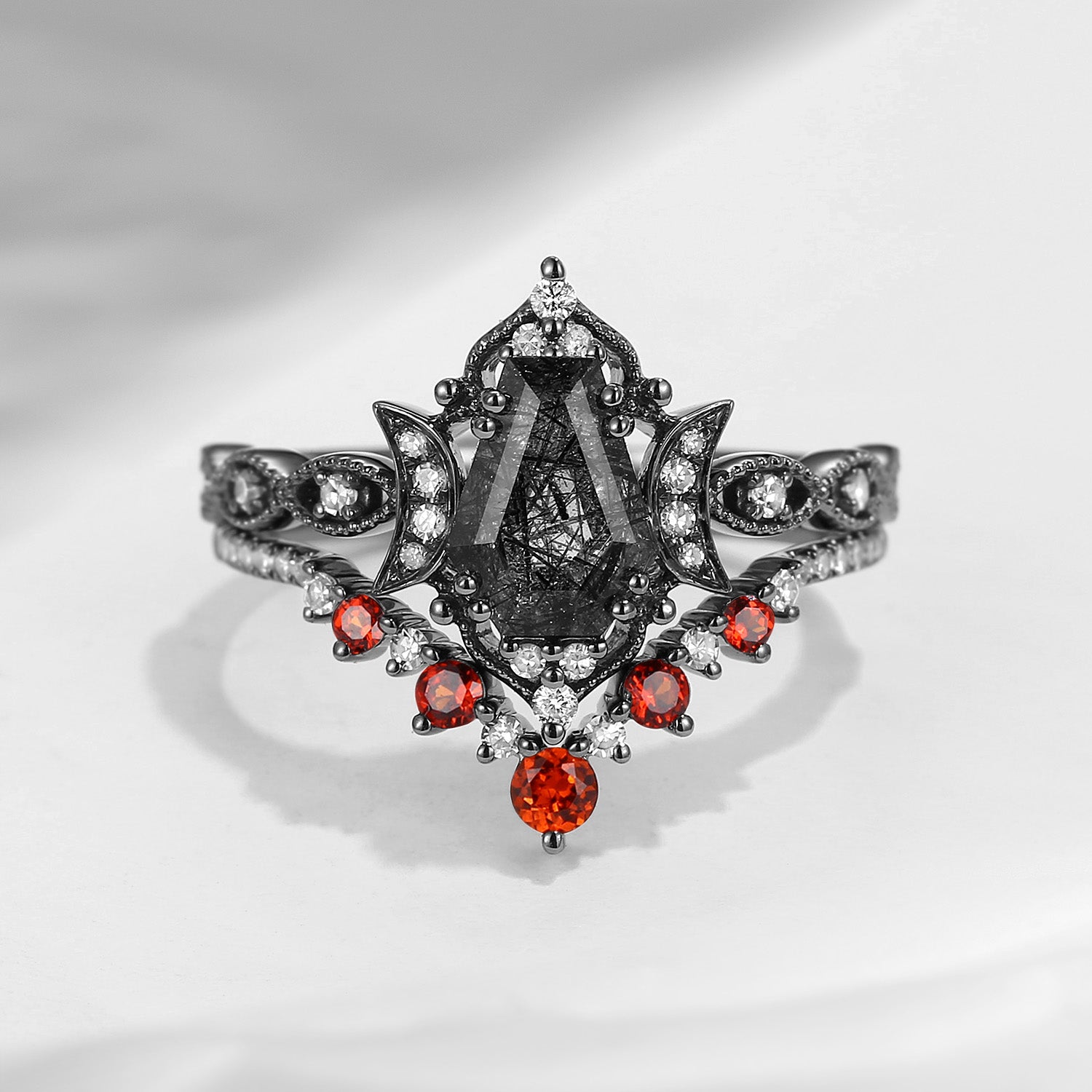 Crescent Moon | Coffin Cut Black Rutilated Quartz 'Black Statement' Ring Set 2pcs