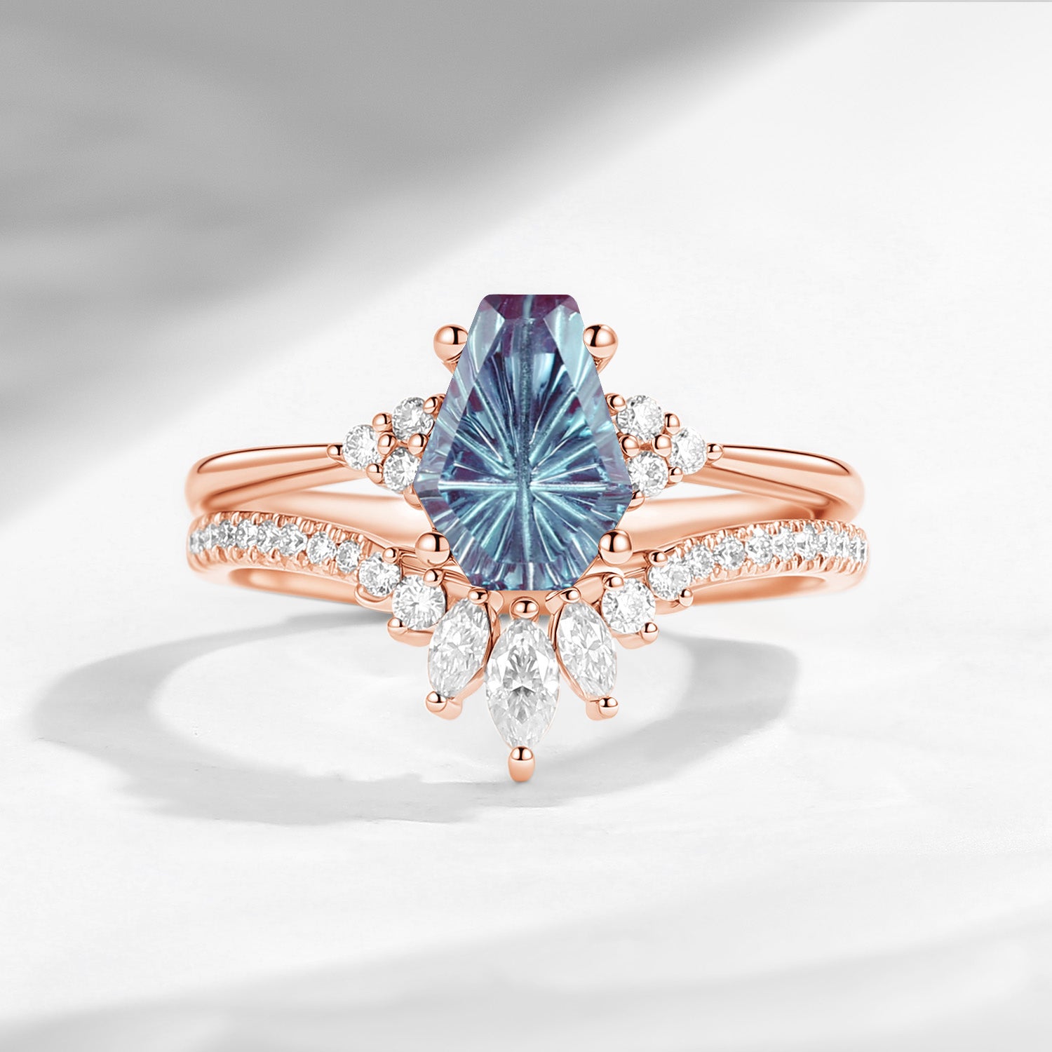 Firework Cut Coffin Lab Alexandrite Engagement Set 2pcs - White Dress