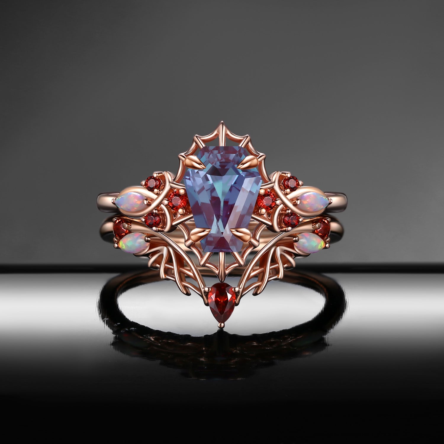Gothic Coffin Shaped Lab Alexandrite Spider Inspired Engagement Ring Set 2pcs