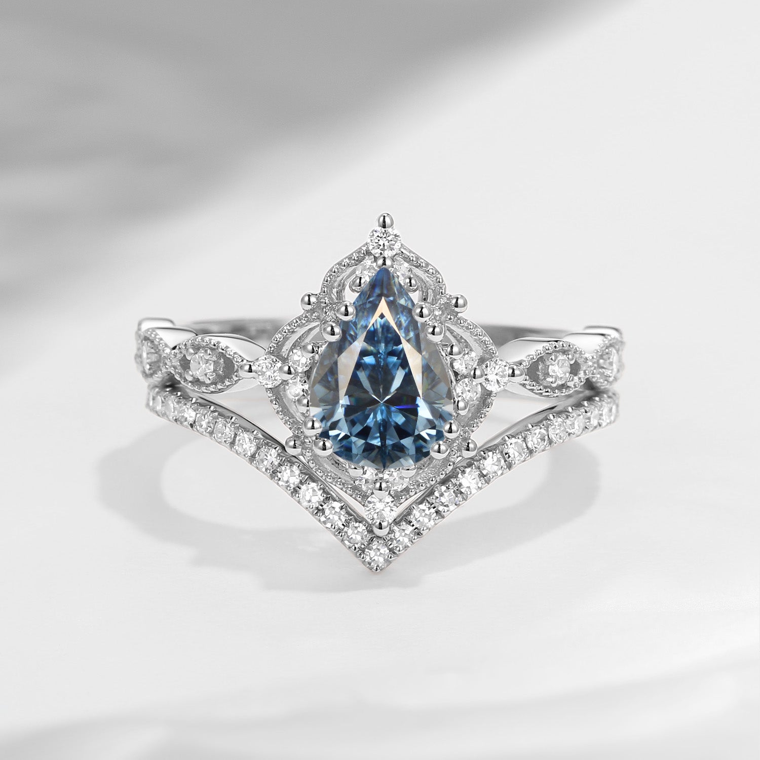 1.5ct Pear Shaped Royal Blue Moissanite Engagement Ring Set 2pcs Chevron Paved Wedding Ring Women Flower Vintage Inspired Ring 'Evelyn'