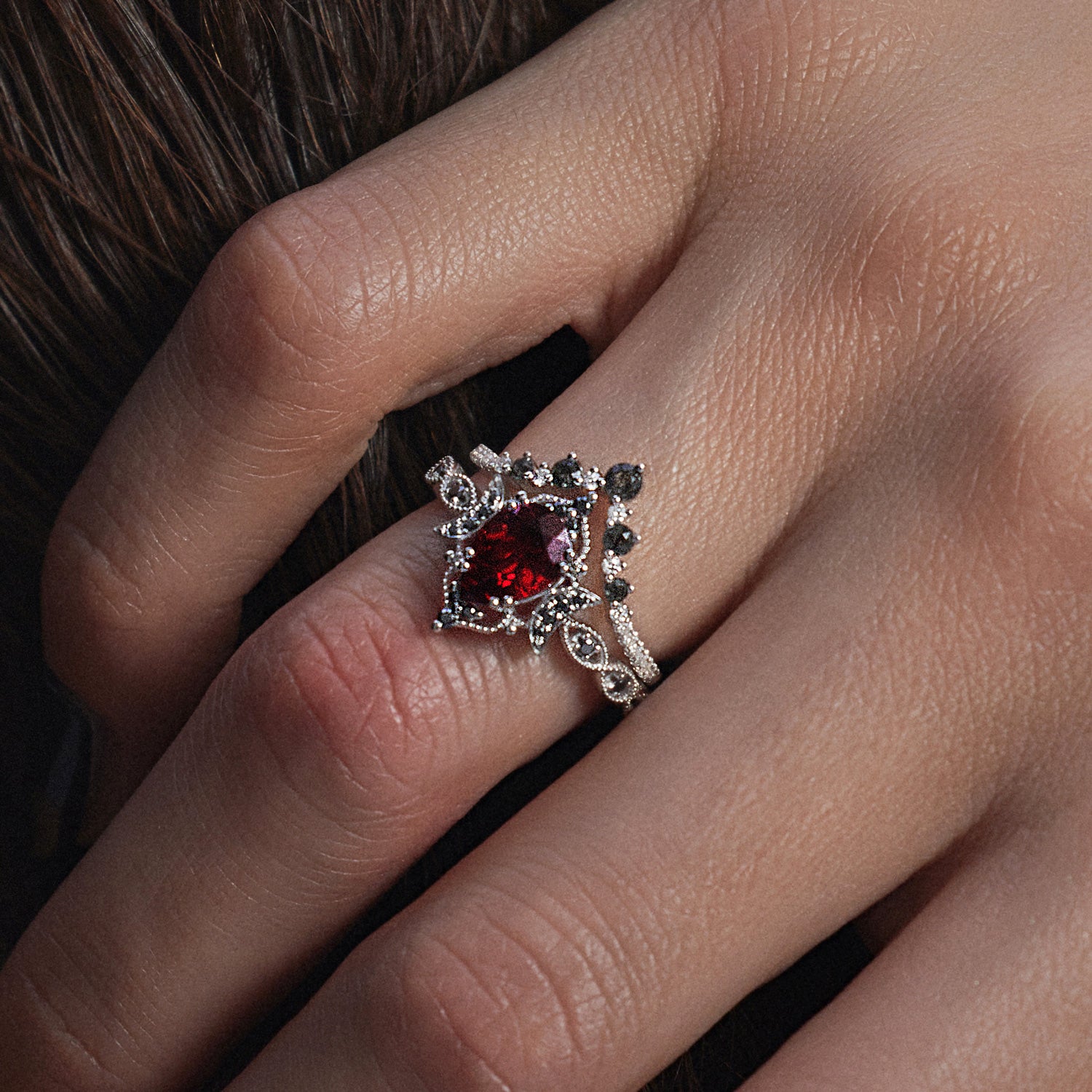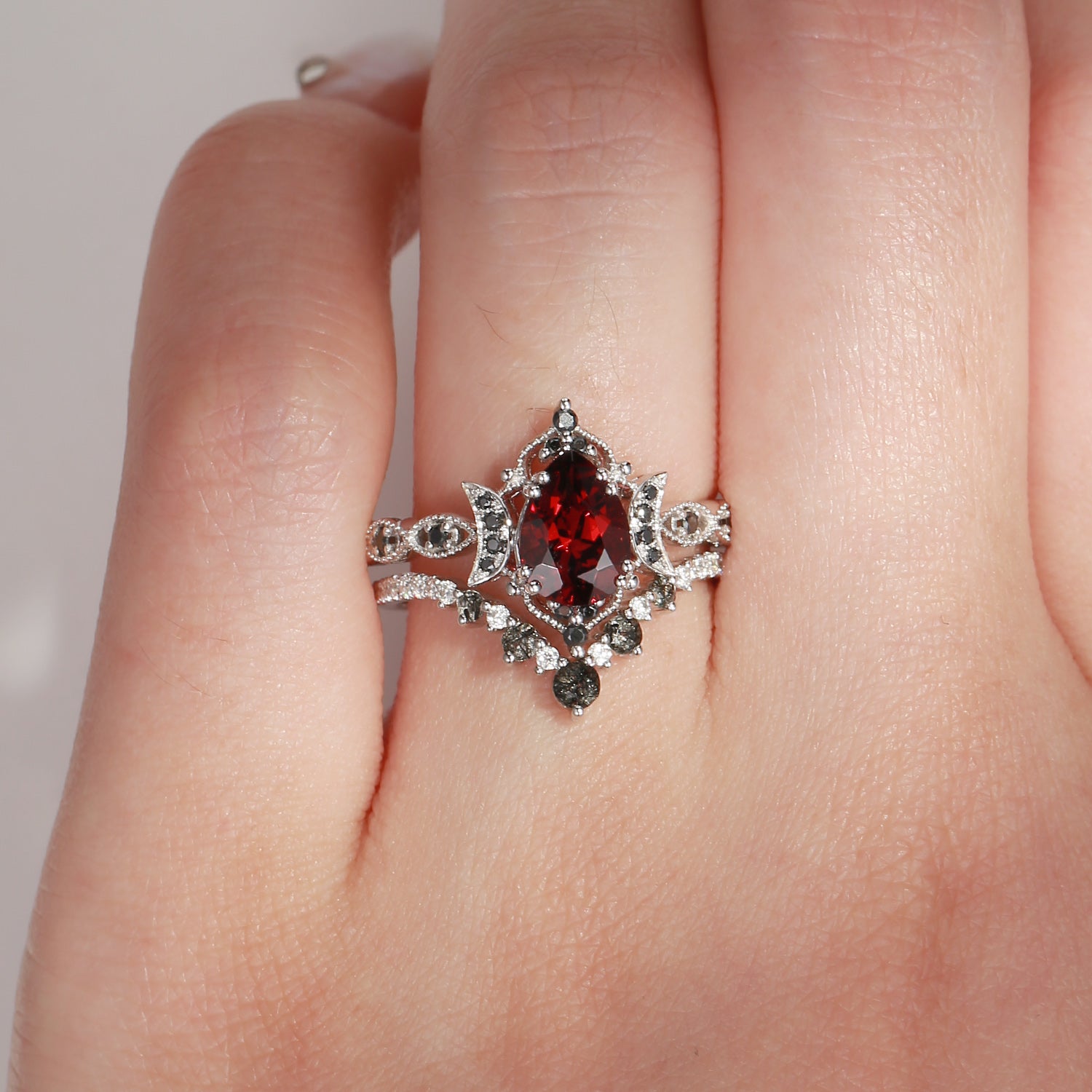 Crescent Moon | Pear Shaped Garnet Curved Engagement Ring Set 2pcs - Eclipse