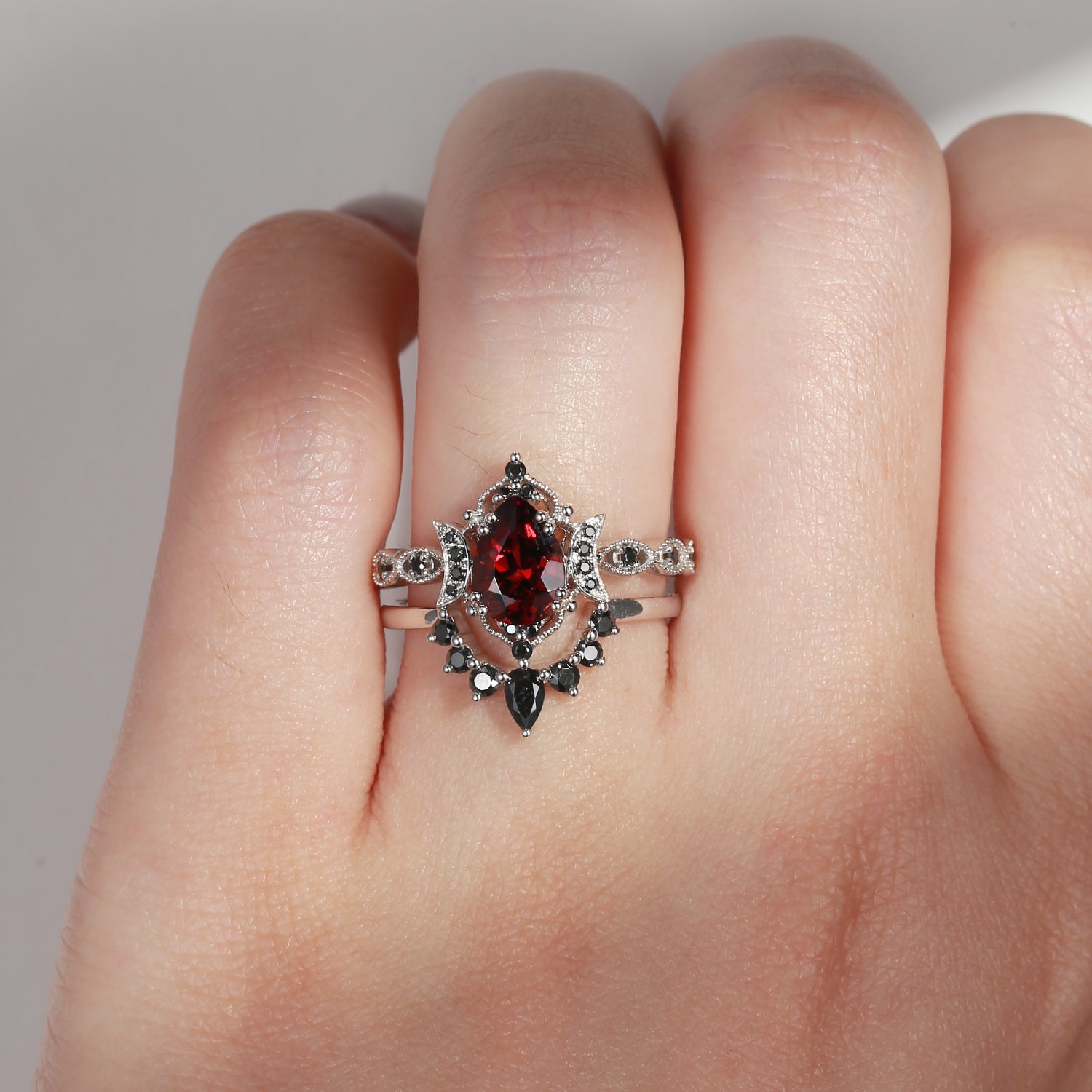Crescent Moon | 18K Vintage Inspired Pear Shaped Garnet Ring Set 2pcs - Eclipse
