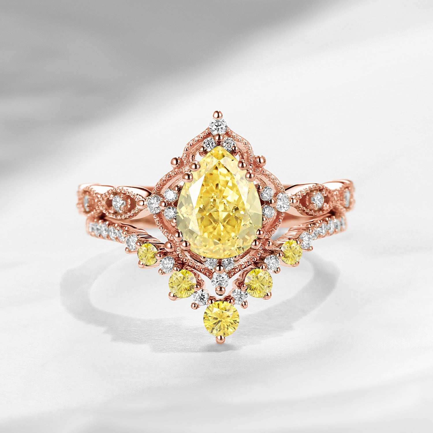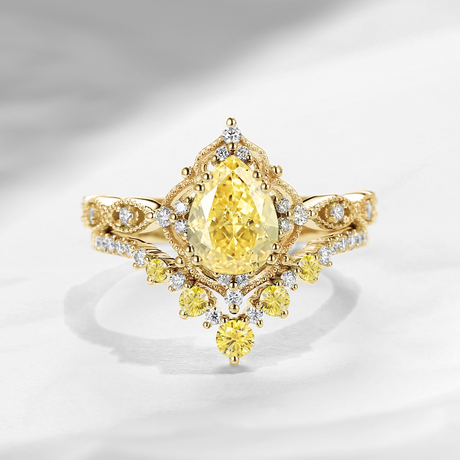 Antique Pear Cut Yellow Lab Diamond Engagement Ring 2pcs