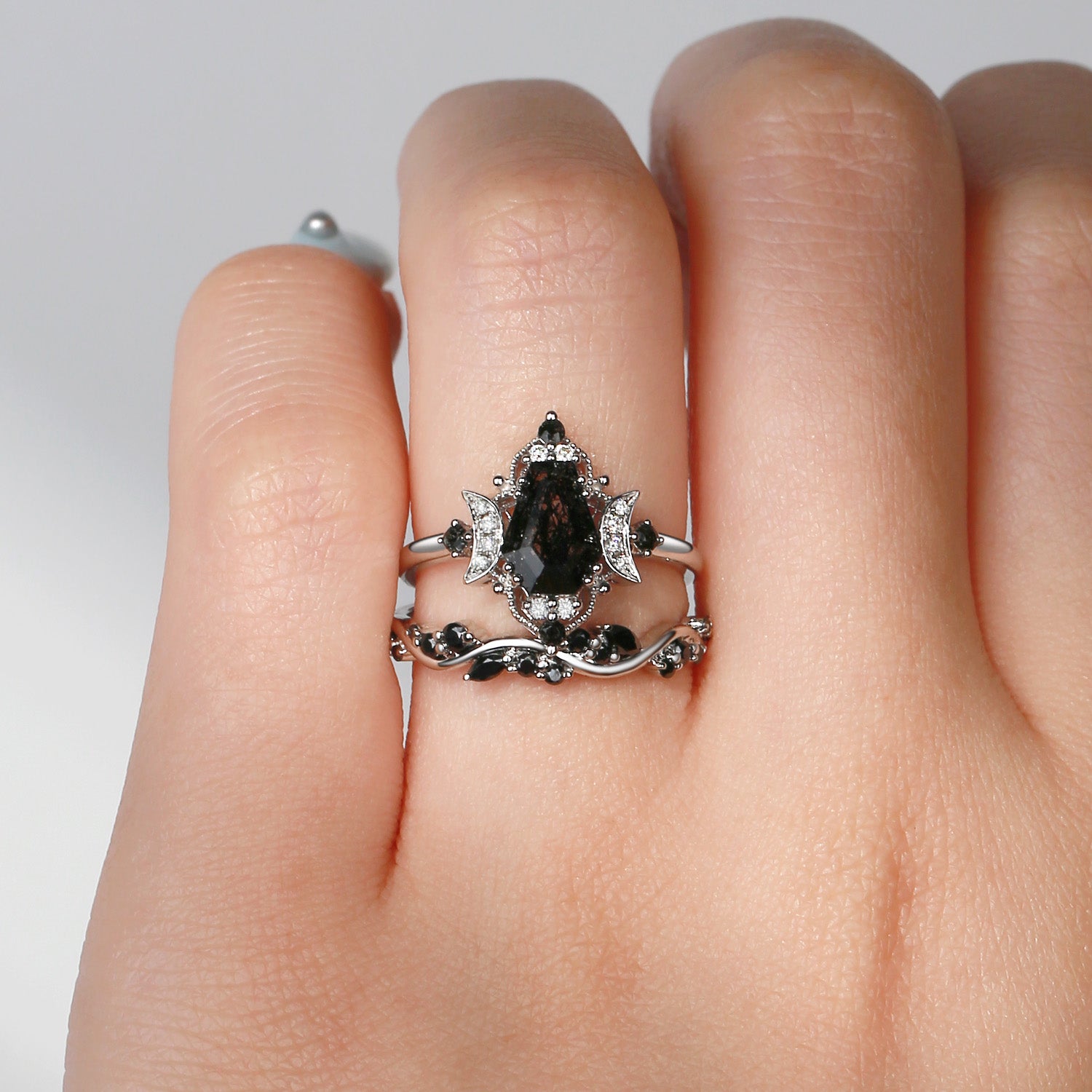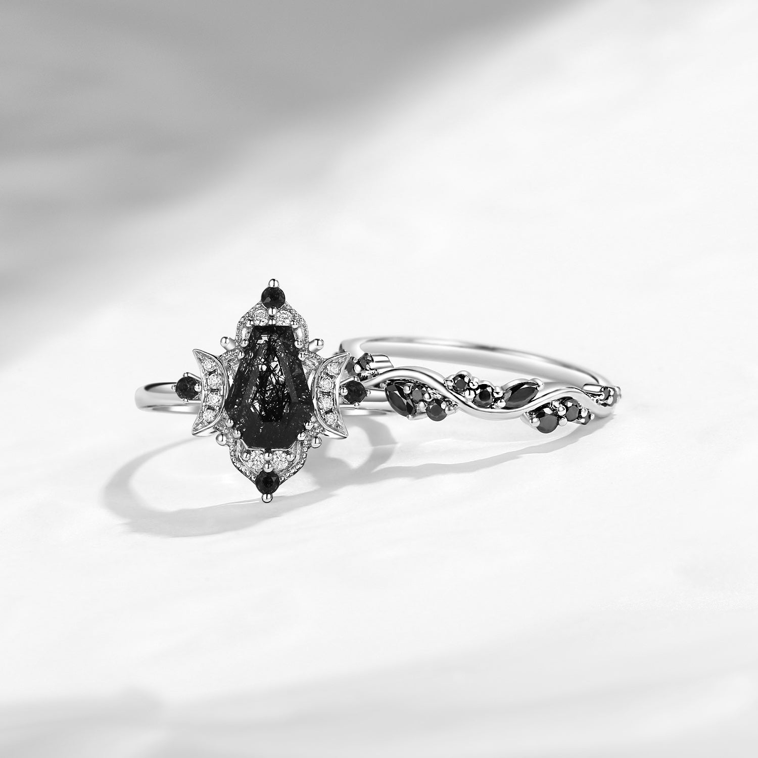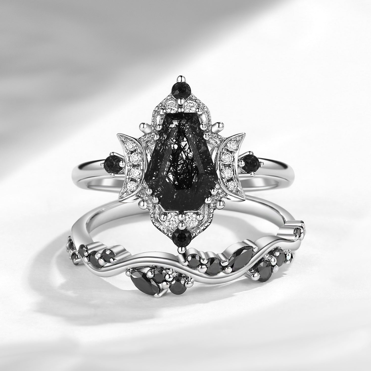 Crescent Moon | Coffin Cut Lab Alexandrite 'Black Statement' Ring Set 2pcs