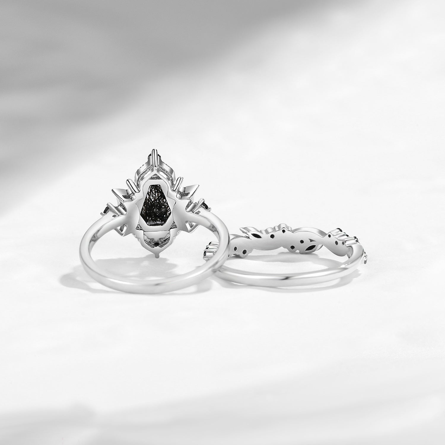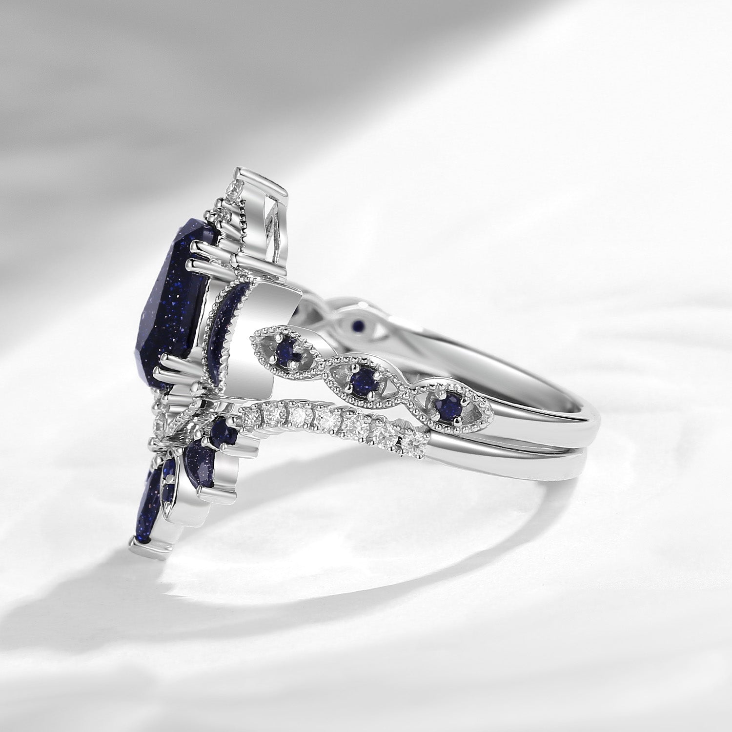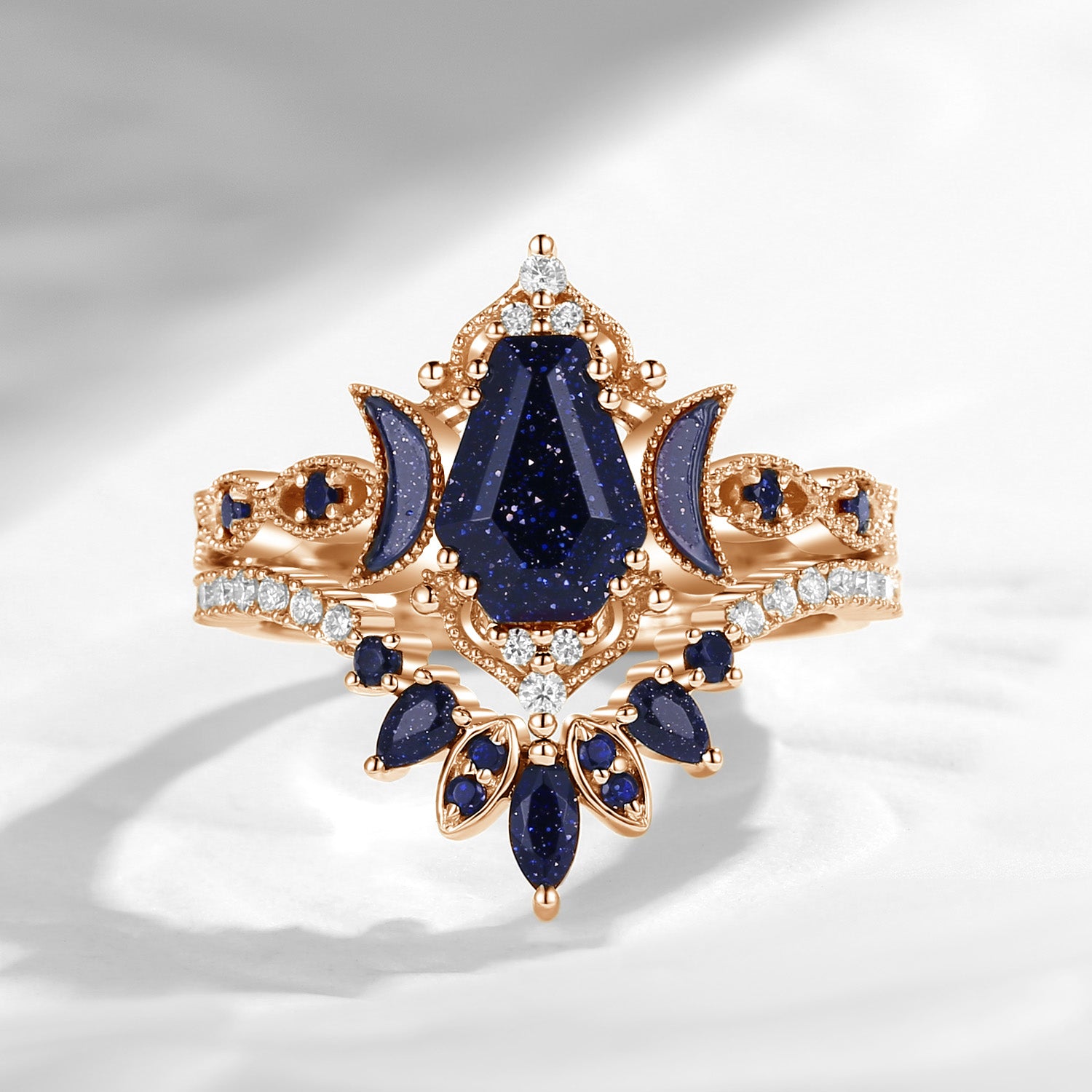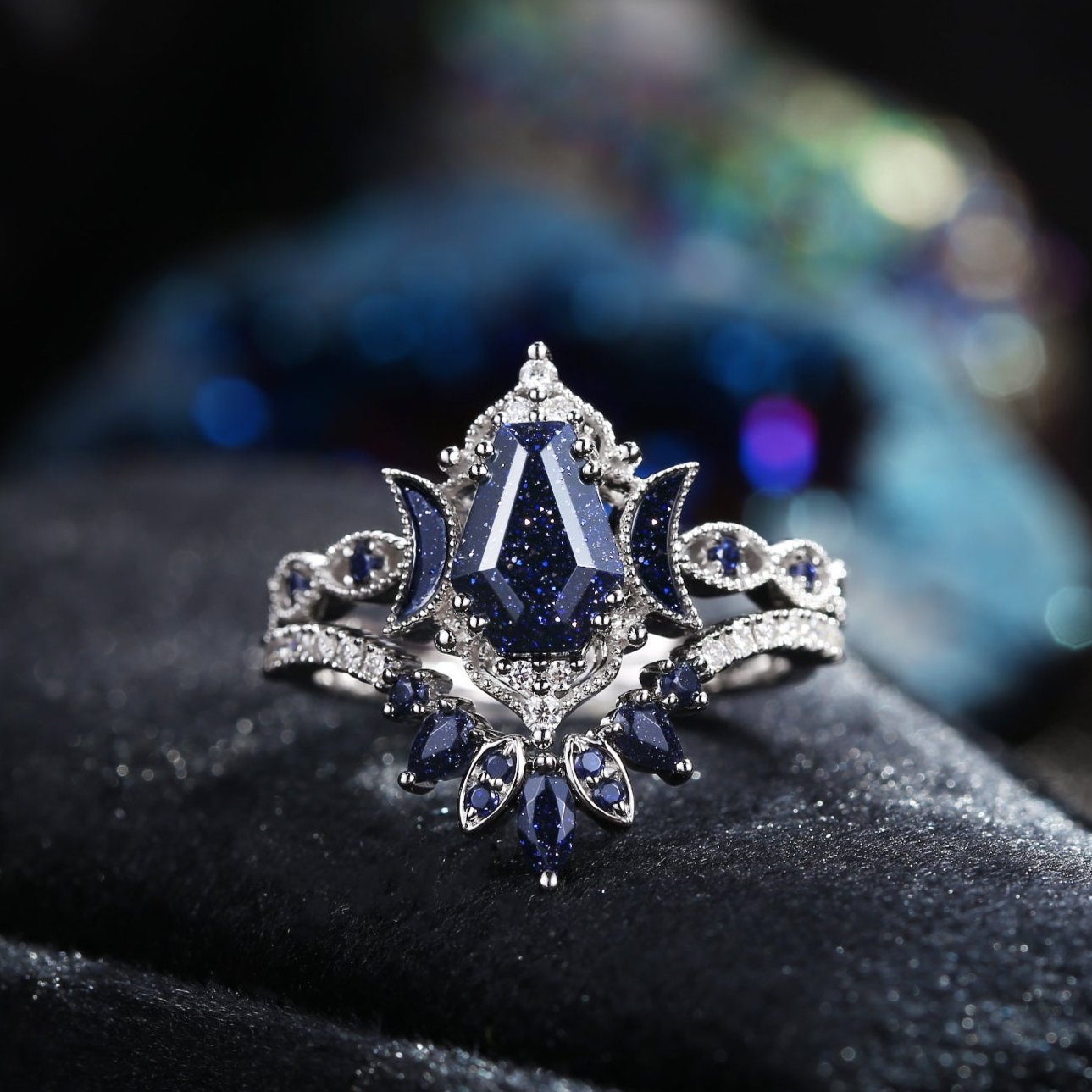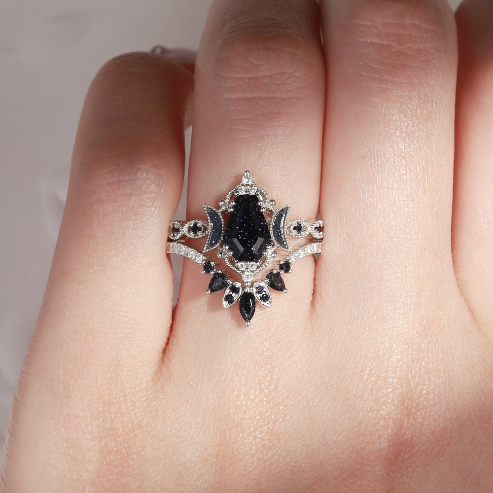 Crescent Moon | Coffin Cut Blue Sandstone Engagement Ring Set 2pcs- 'Ultra Galaxy'