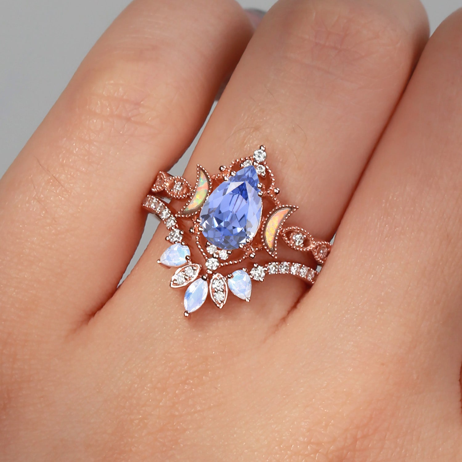 Antique Pear Cut Blue Lab Diamond Engagement Ring 2pcs
