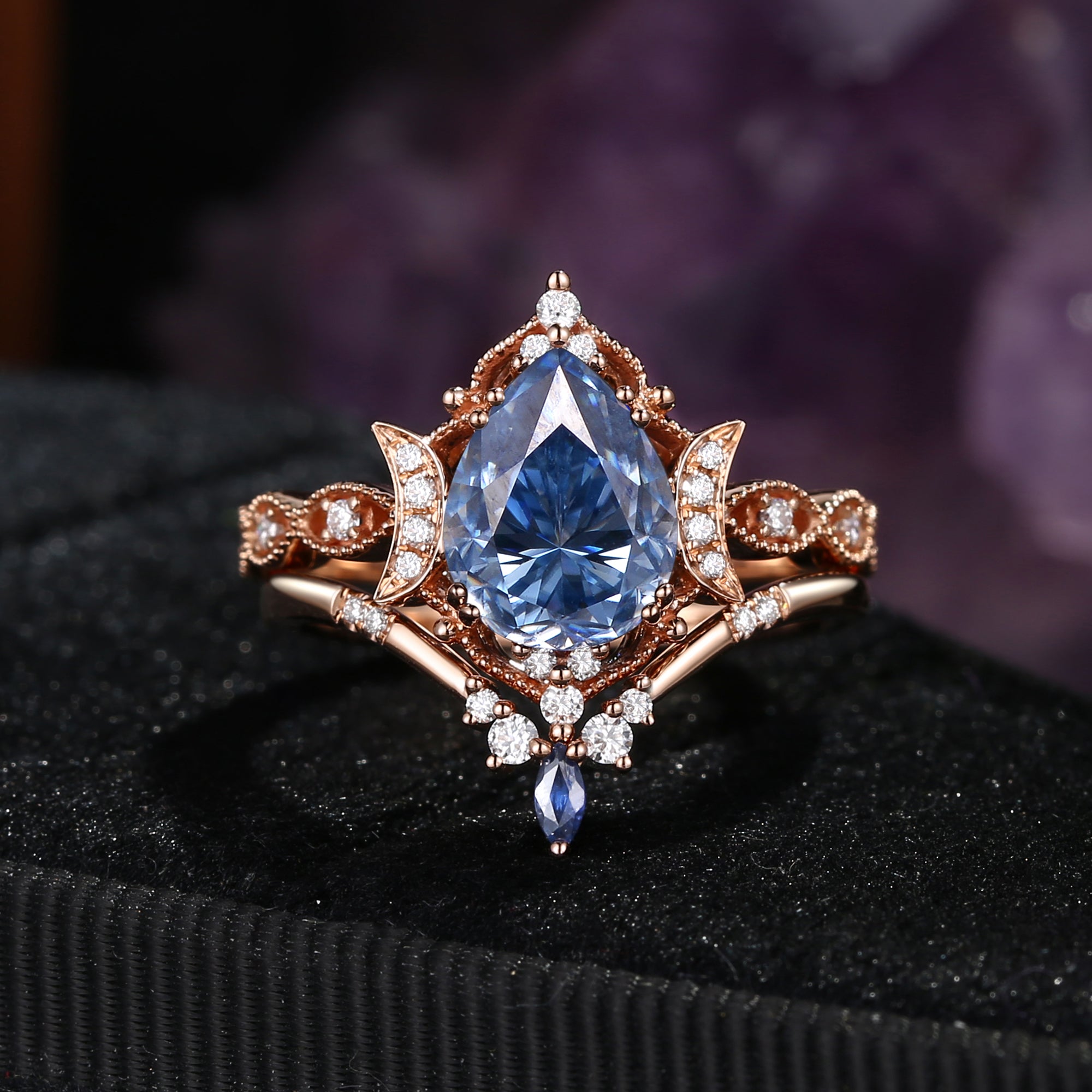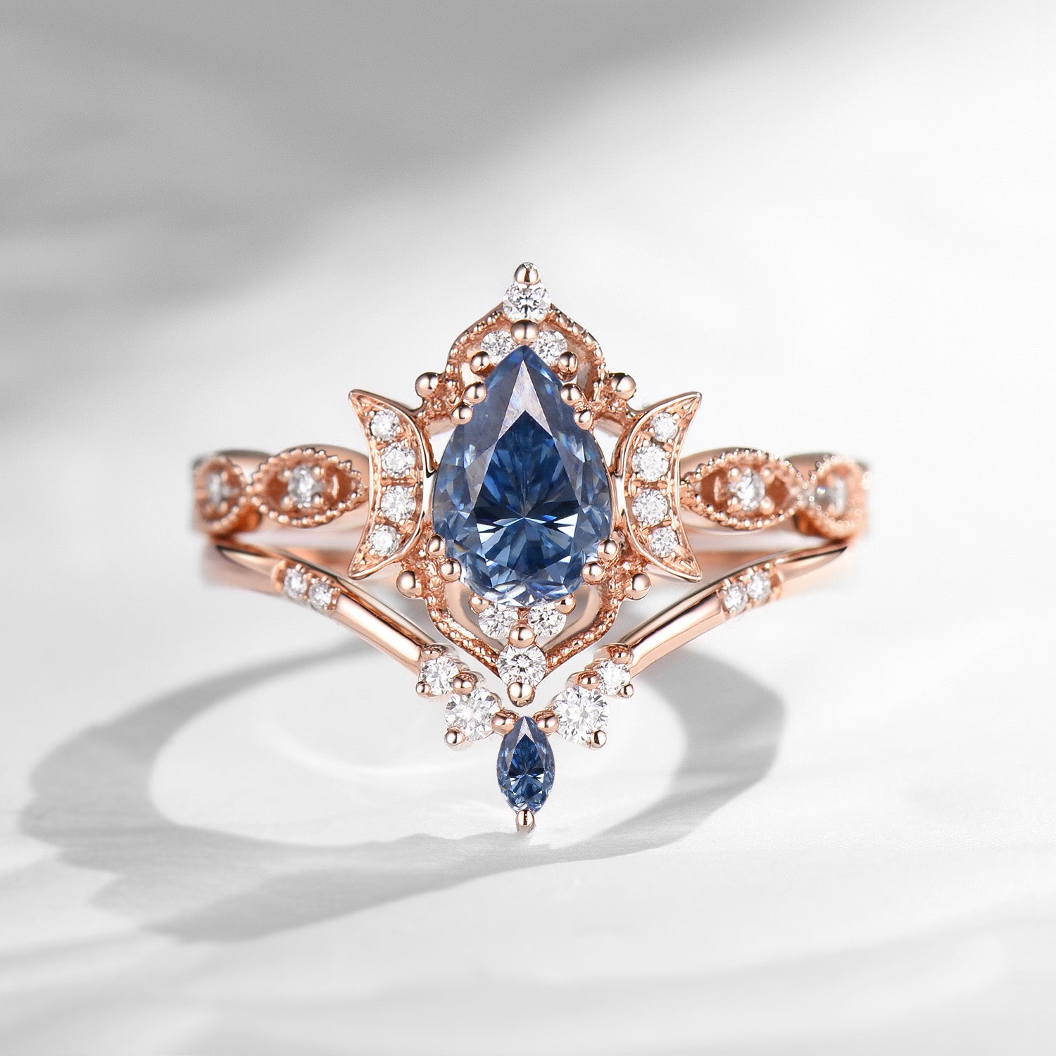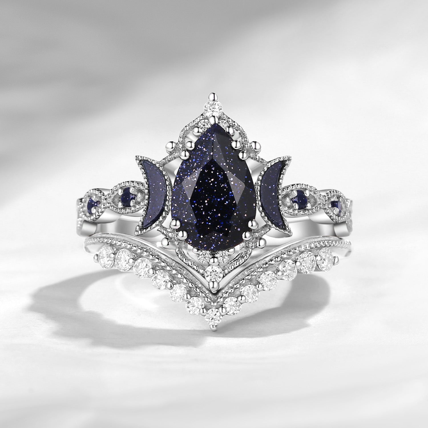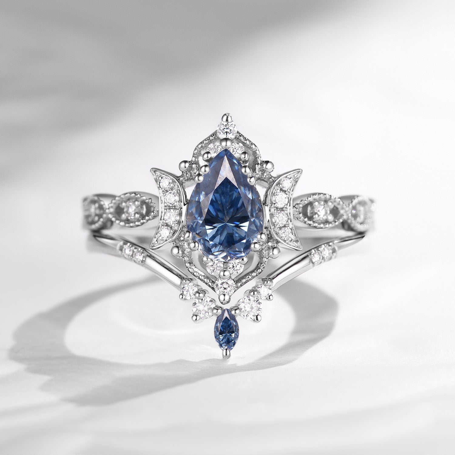 Crescent Moon | Pear Cut Blue Sandstone Engagement Ring Set 2pcs