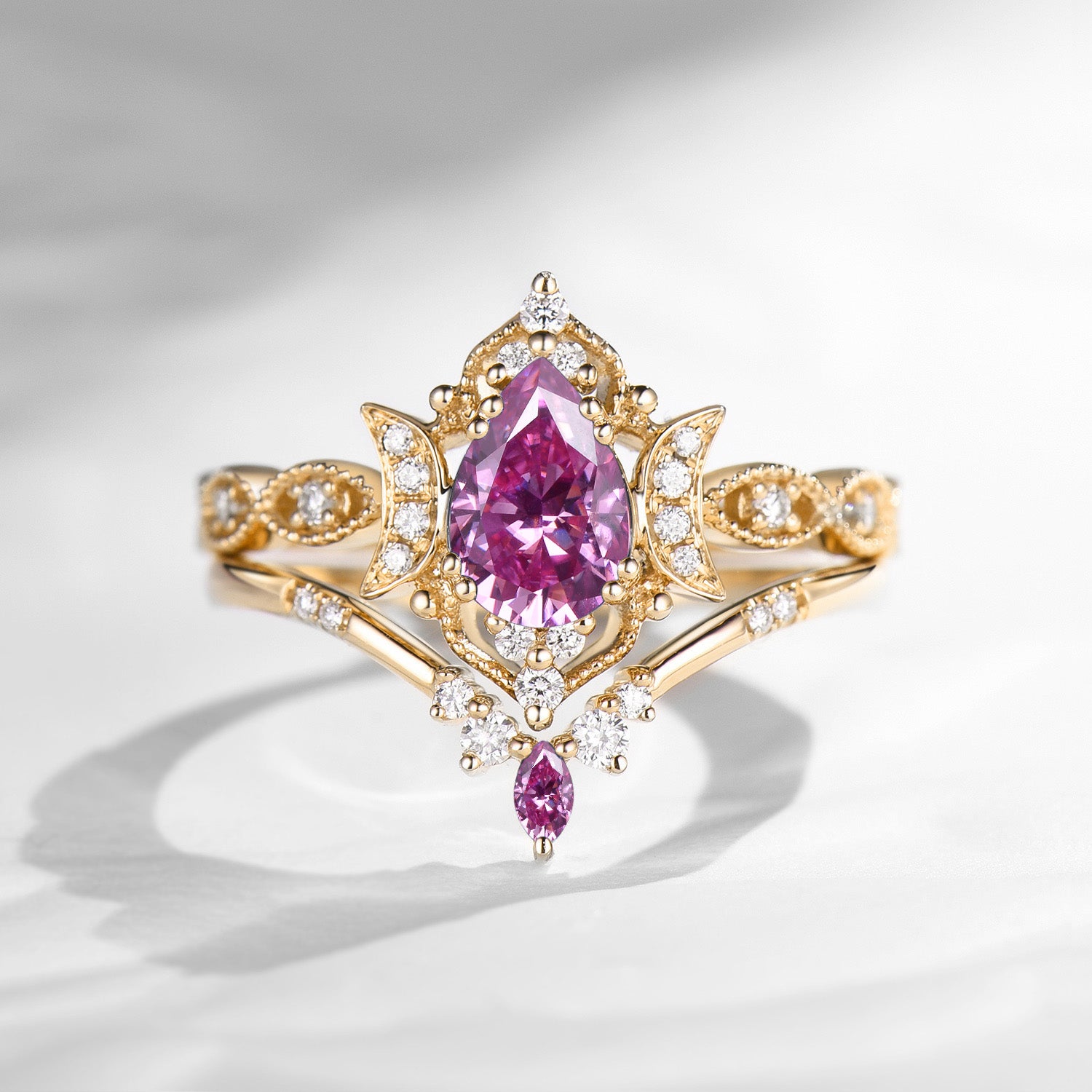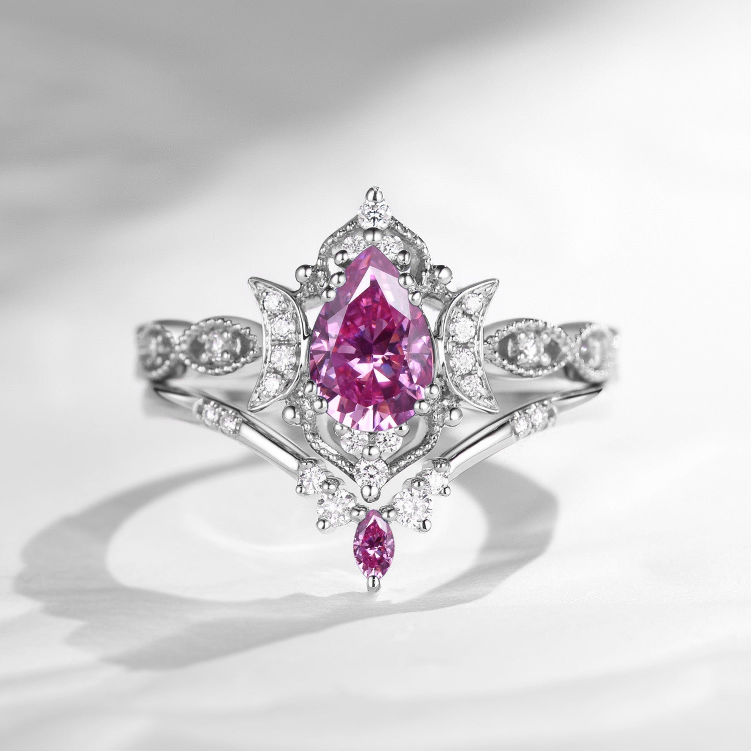 Crescent Moon | Unique Pink Moissanite Engagement Ring Set 2pcs - Full Moon