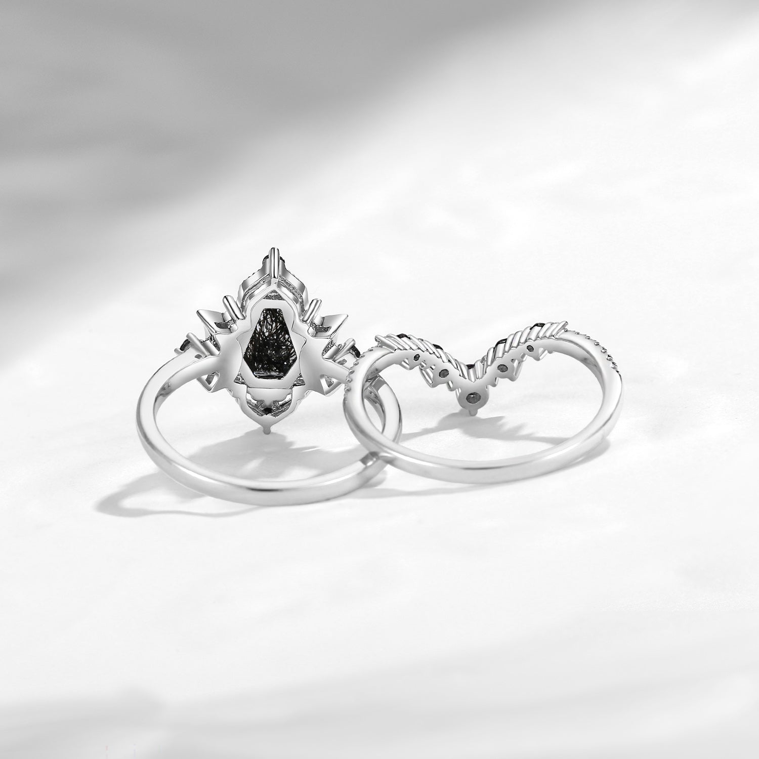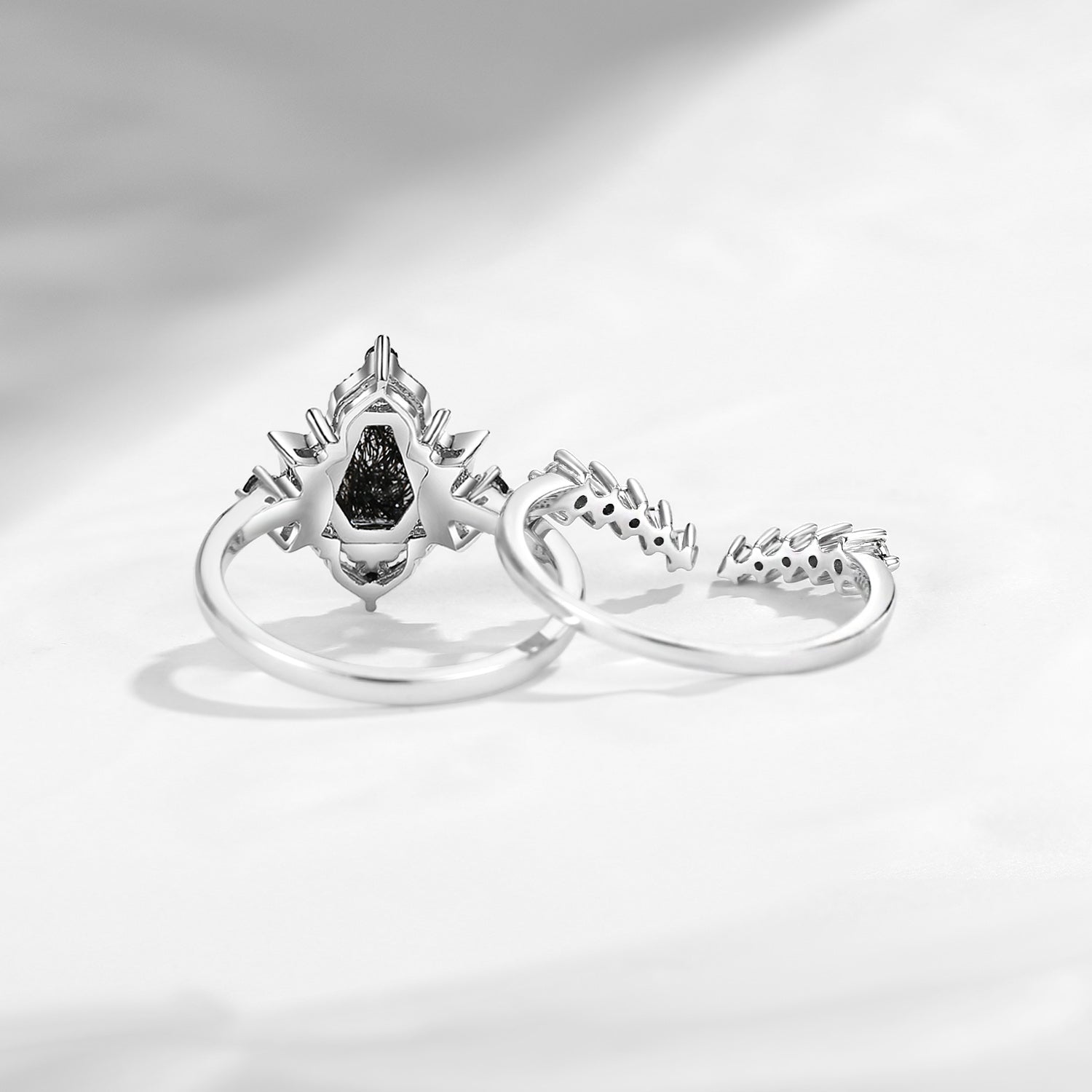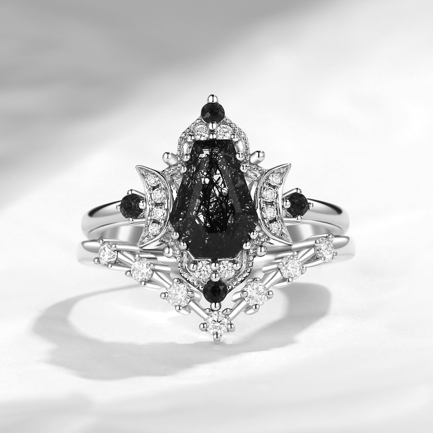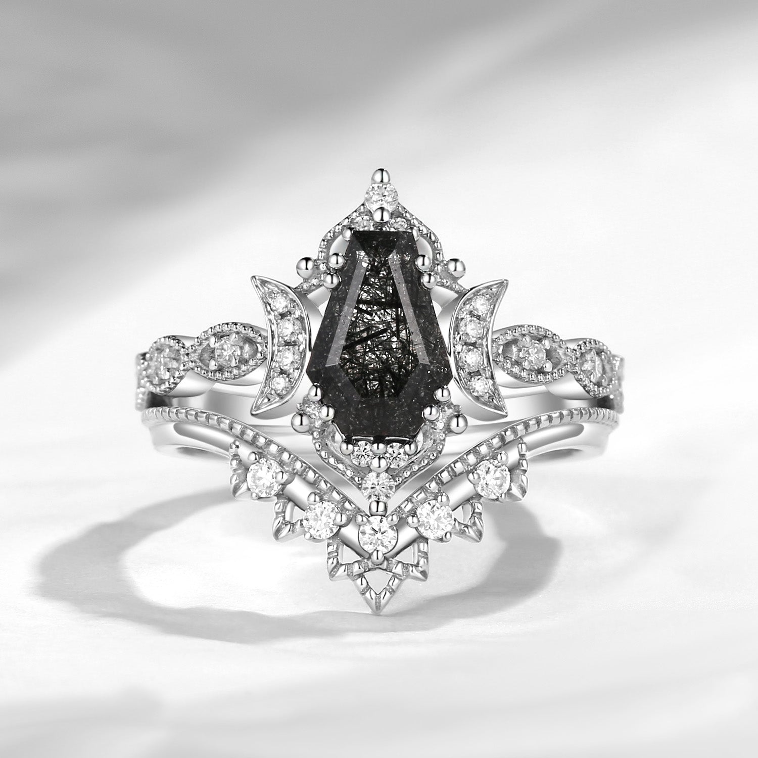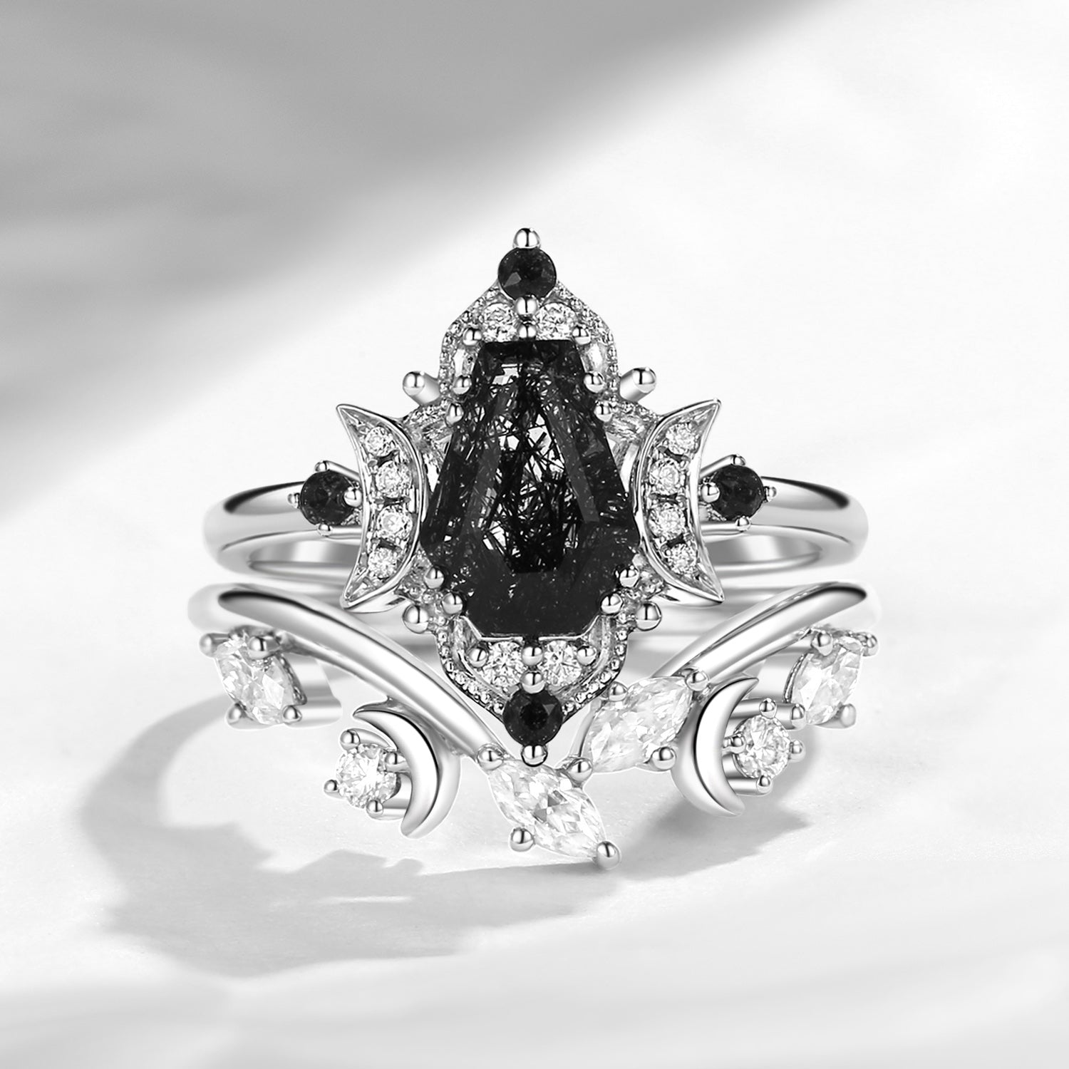 Crescent Moon | Coffin Cut Black Rutilated Quartz Engagement Ring Set 2pcs