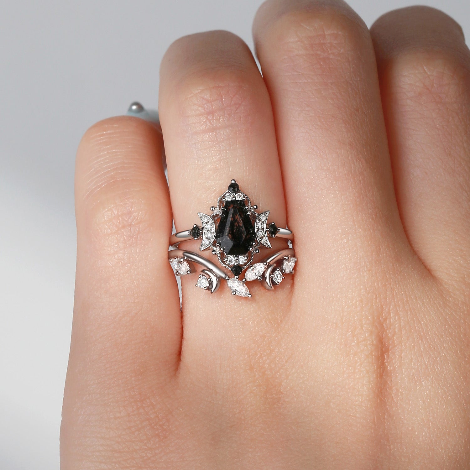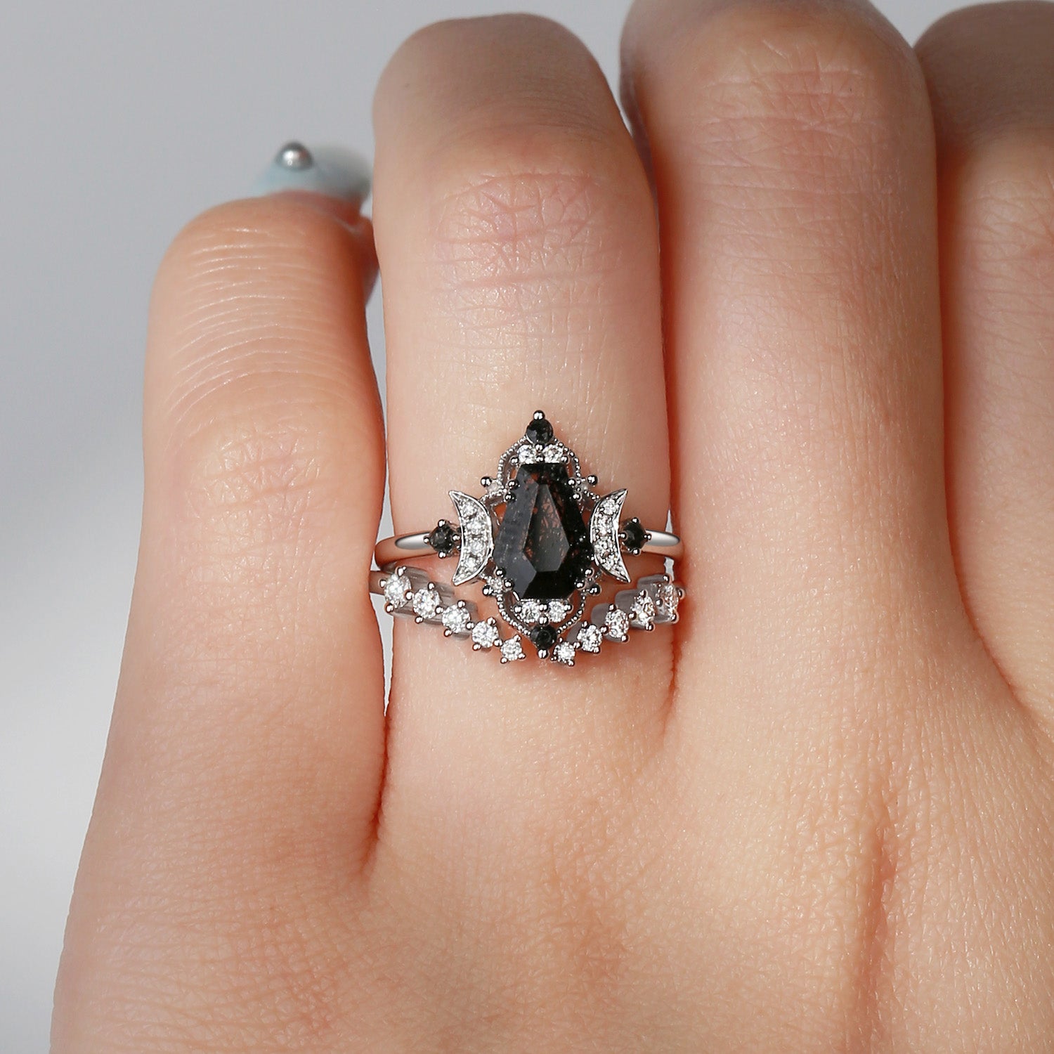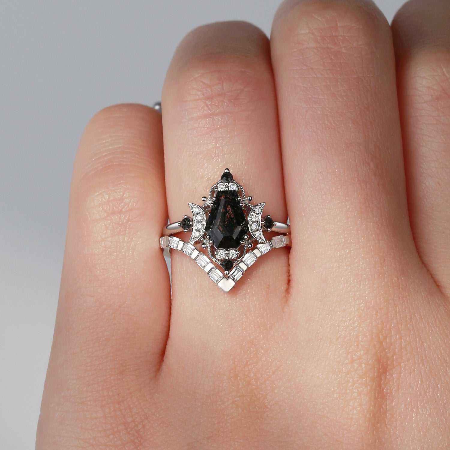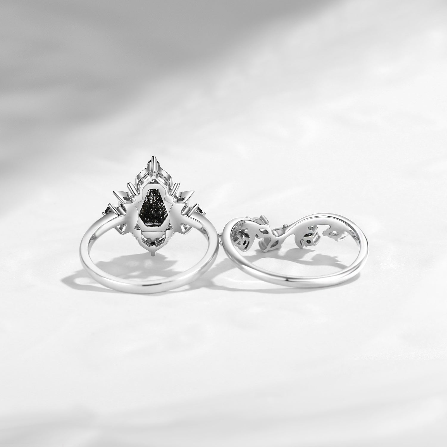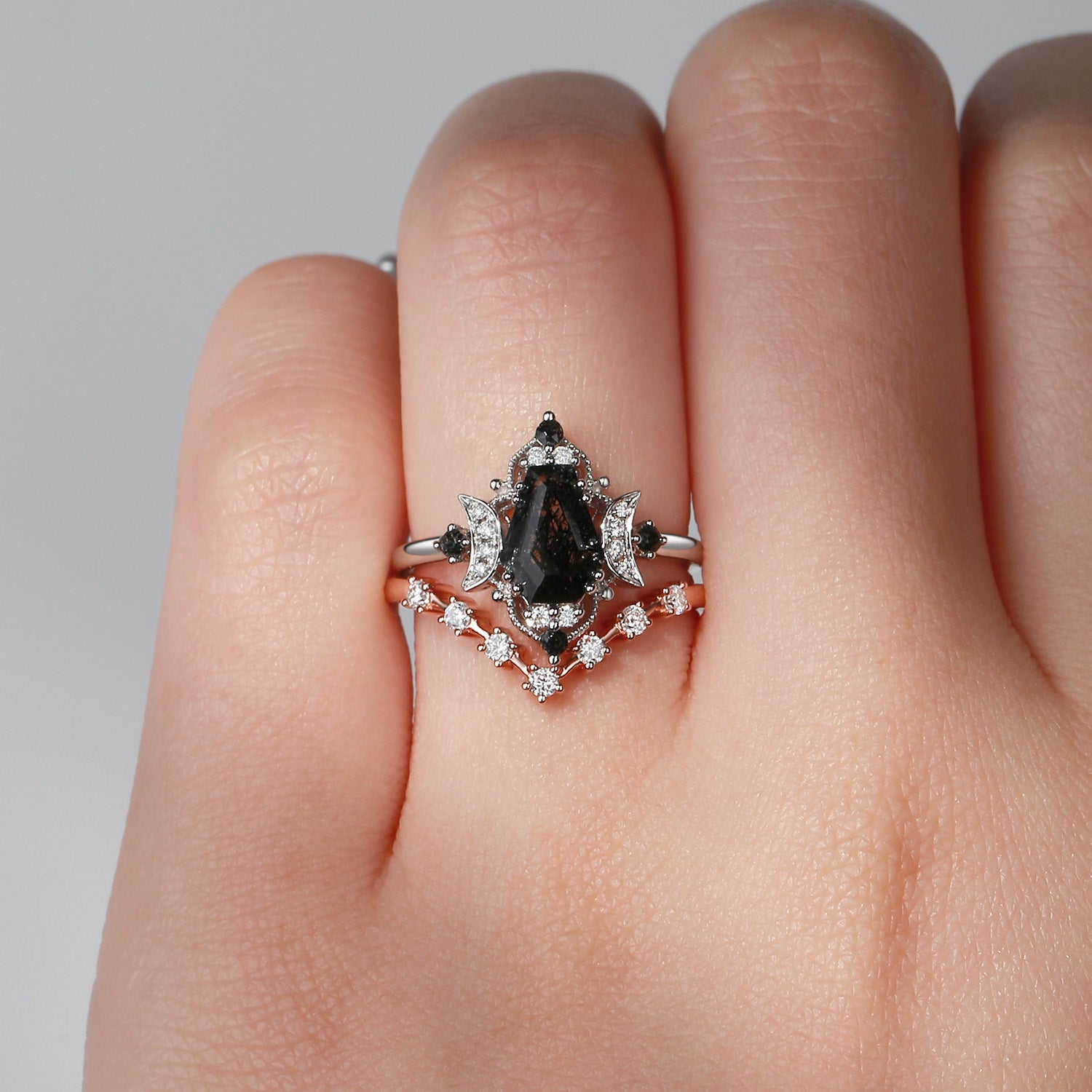 Crescent Moon | Coffin Cut Black Rutilated Quartz Engagement Ring Set 2pcs