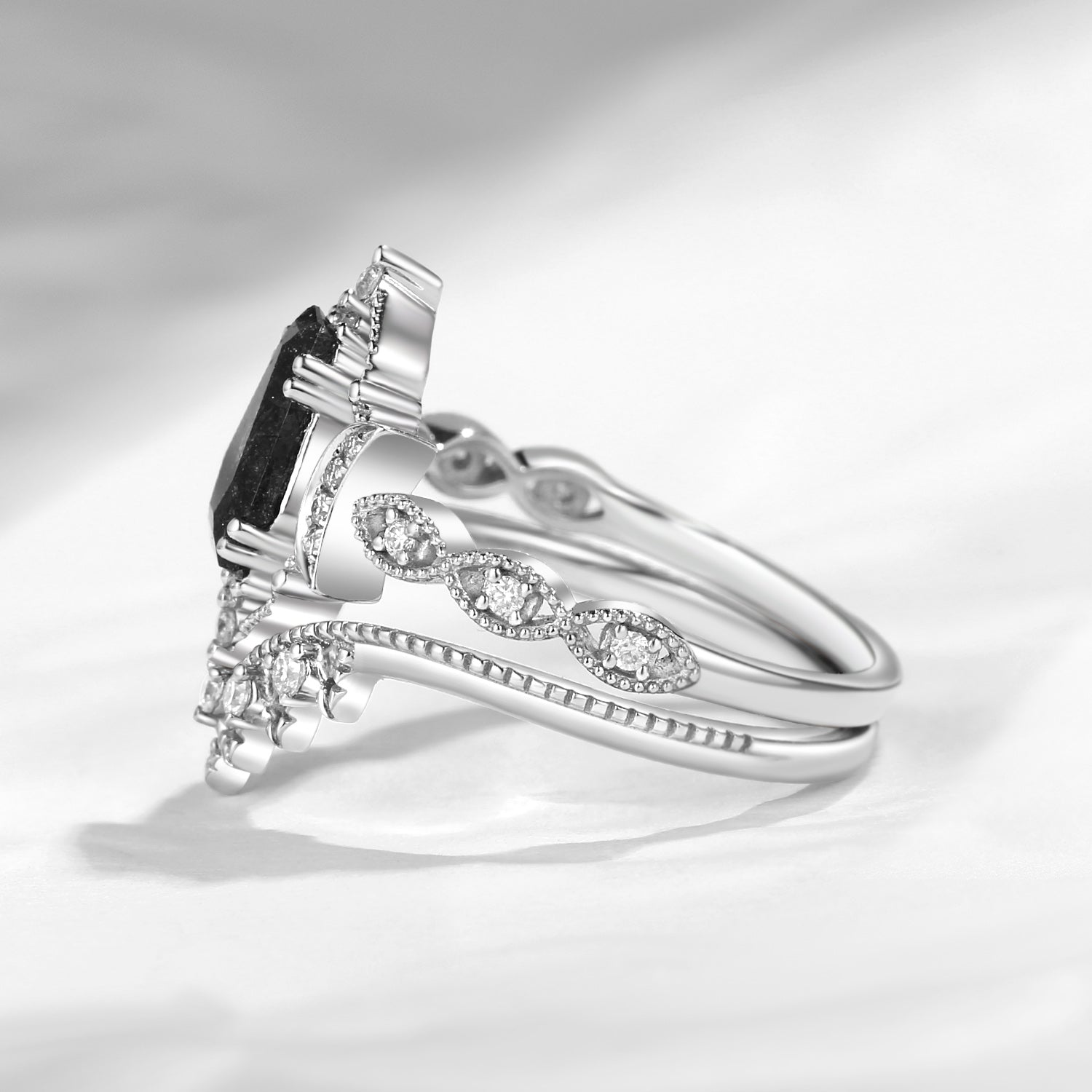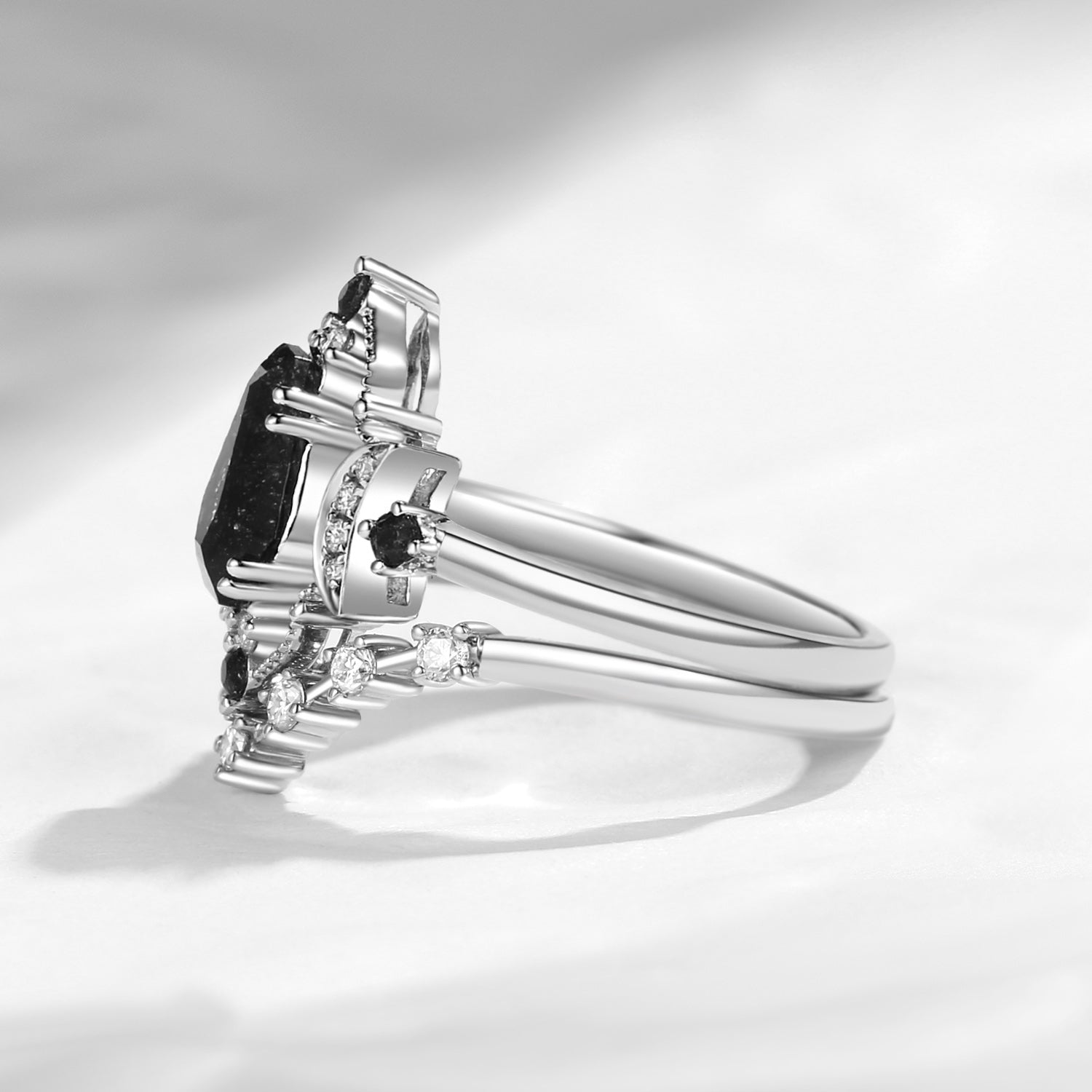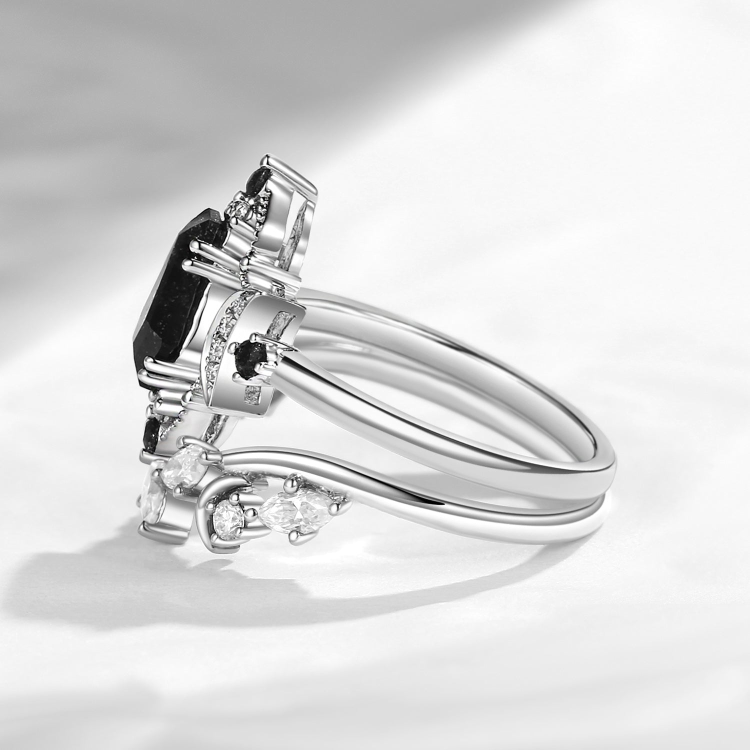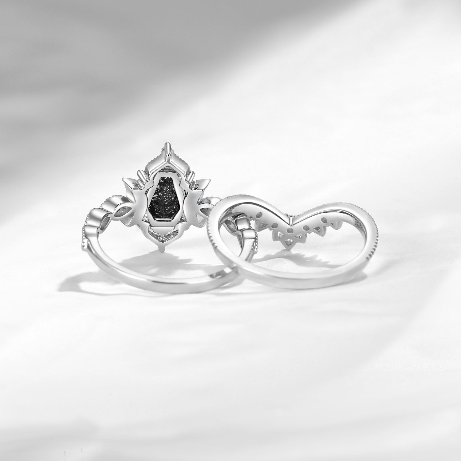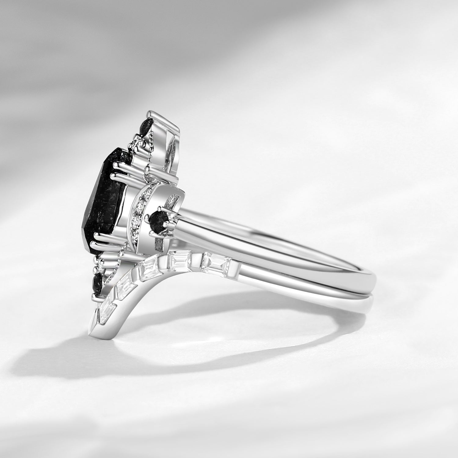 Crescent Moon | Coffin Cut Black Rutilated Quartz Engagement Ring Set 2pcs