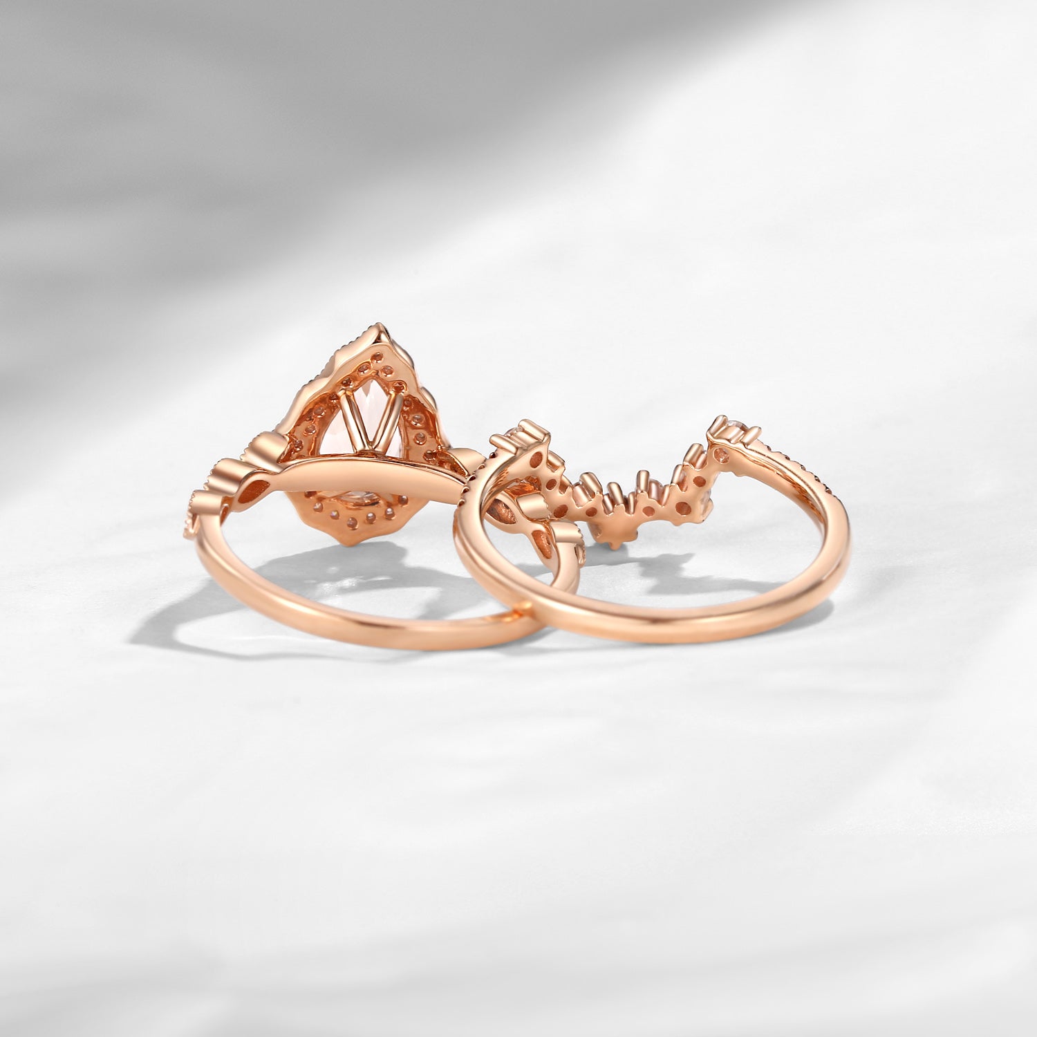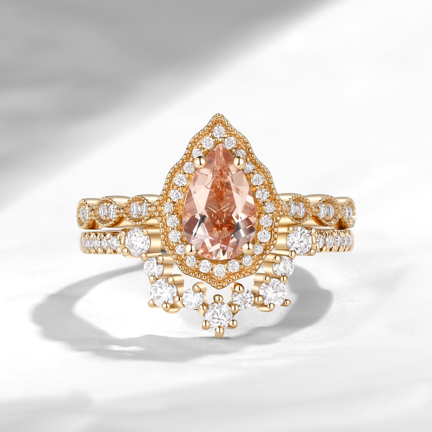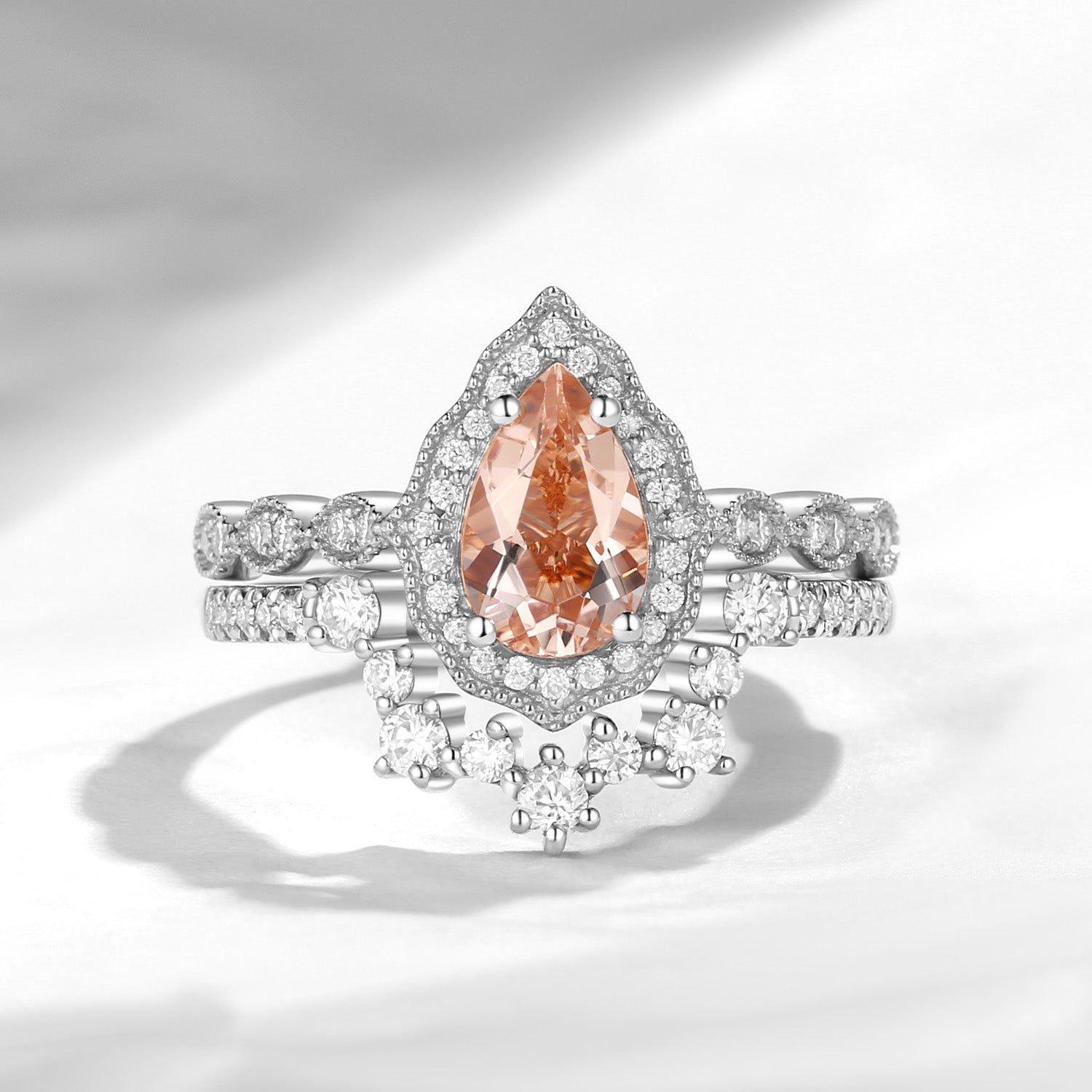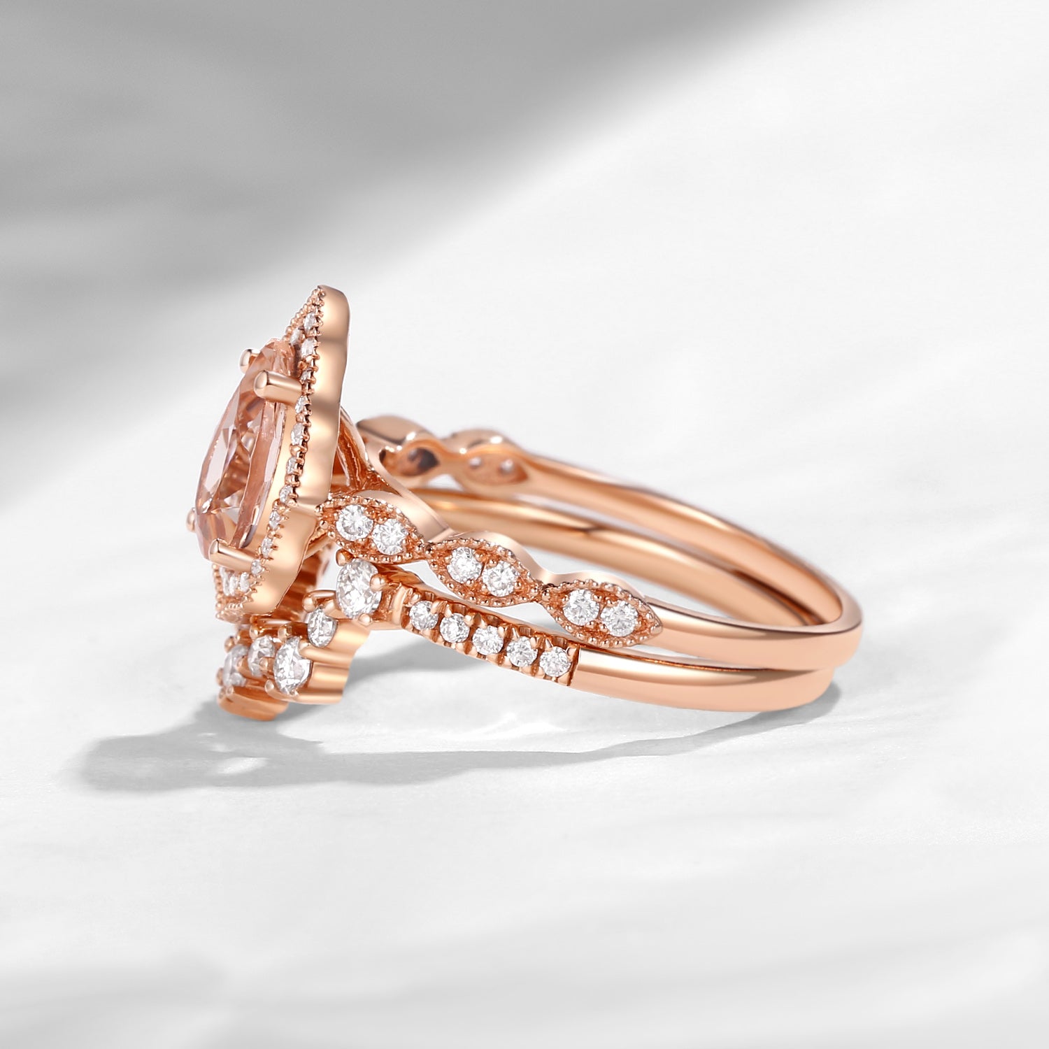 Vintage Inspired Pear Shaped Morganite Halo Engagement Ring Set 2pcs