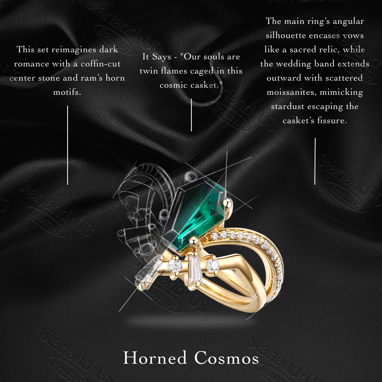 Maximalist Style Coffin Cut Lab Emerald Black Gold Bridal Set 3pcs - Bat Knight