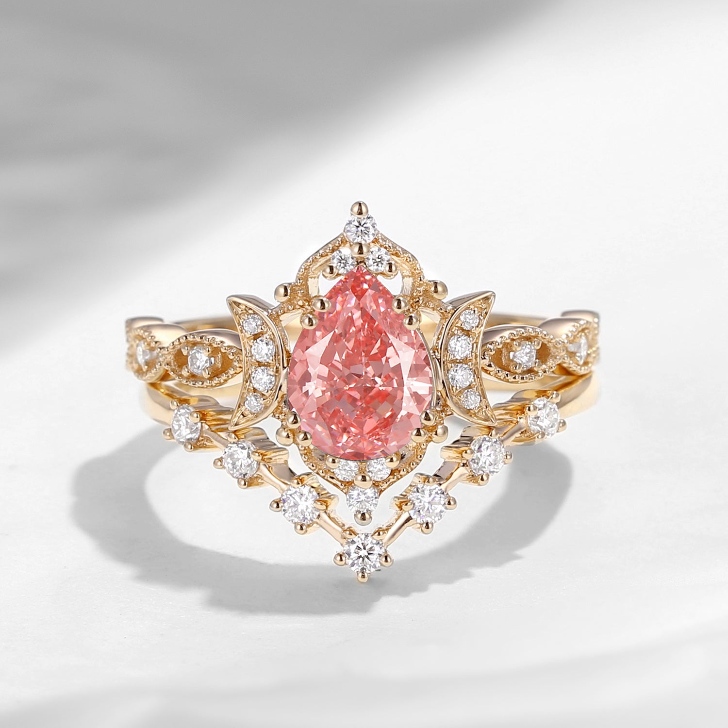 Crescent Moon | Pear Cut Pink Lab Diamond Galaxy Engagement Ring Set 2pcs